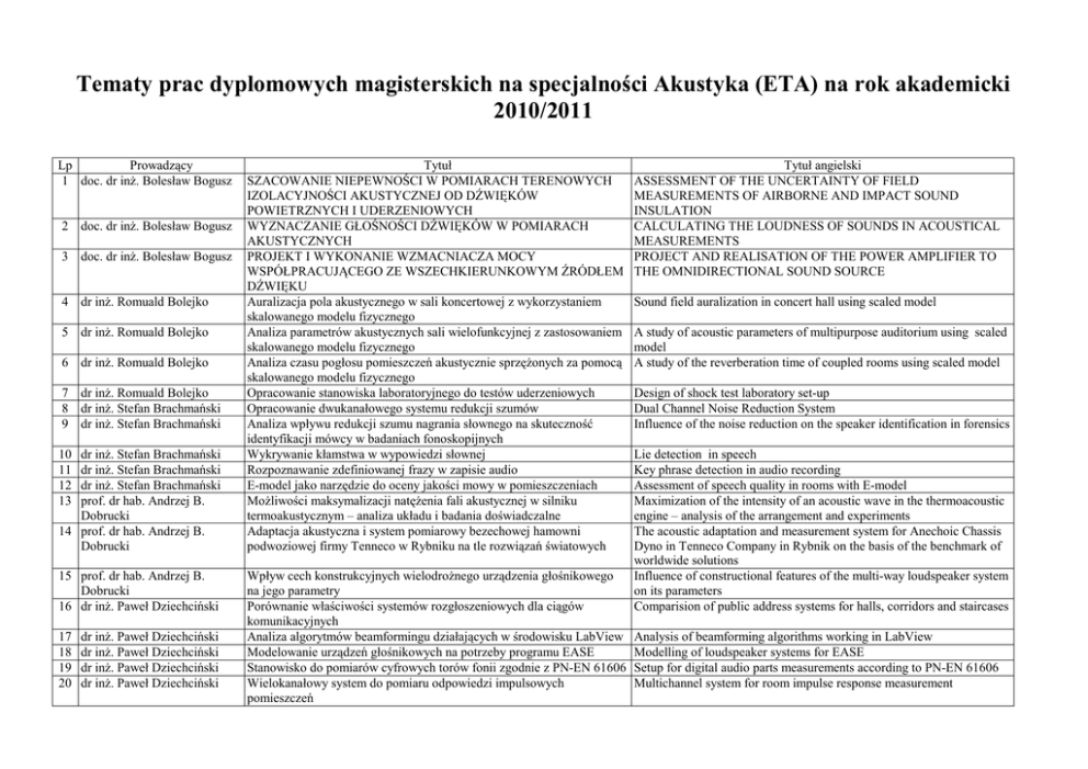 Tematy prac dyplomowych magisterskich na specjalności Akustyka (ETA) na rok akademicki 2010/2011 Lp Prowadzący 1 doc. dr inŜ. Bolesław Bogusz 2 doc. dr inŜ. Bolesław Bogusz 3 doc. dr inŜ. Bolesław Bogusz 4 dr inŜ. Romuald Bolejko 5 dr inŜ. Romuald Bolejko 6 dr inŜ. Romuald Bolejko 7 dr inŜ. Romuald Bolejko 8 dr inŜ. Stefan Brachmański 9 dr inŜ. Stefan Brachmański 10 11 12 13 dr inŜ. Stefan Brachmański dr inŜ. Stefan Brachmański dr inŜ. Stefan Brachmański prof. dr hab. Andrzej B. Dobrucki 14 prof. dr hab. Andrzej B. Dobrucki 15 prof. dr hab. Andrzej B. Dobrucki 16 dr inŜ. Paweł Dziechciński 17 18 19 20 dr inŜ. Paweł Dziechciński dr inŜ. Paweł Dziechciński dr inŜ. Paweł Dziechciński dr inŜ. Paweł Dziechciński Tytuł SZACOWANIE NIEPEWNOŚCI W POMIARACH TERENOWYCH IZOLACYJNOŚCI AKUSTYCZNEJ OD DŹWIĘKÓW POWIETRZNYCH I UDERZENIOWYCH WYZNACZANIE GŁOŚNOŚCI DŹWIĘKÓW W POMIARACH AKUSTYCZNYCH PROJEKT I WYKONANIE WZMACNIACZA MOCY WSPÓŁPRACUJĄCEGO ZE WSZECHKIERUNKOWYM ŹRÓDŁEM DŹWIĘKU Auralizacja pola akustycznego w sali koncertowej z wykorzystaniem skalowanego modelu fizycznego Analiza parametrów akustycznych sali wielofunkcyjnej z zastosowaniem skalowanego modelu fizycznego Analiza czasu pogłosu pomieszczeń akustycznie sprzęŜonych za pomocą skalowanego modelu fizycznego Opracowanie stanowiska laboratoryjnego do testów uderzeniowych Opracowanie dwukanałowego systemu redukcji szumów Analiza wpływu redukcji szumu nagrania słownego na skuteczność identyfikacji mówcy w badaniach fonoskopijnych Wykrywanie kłamstwa w wypowiedzi słownej Rozpoznawanie zdefiniowanej frazy w zapisie audio E-model jako narzędzie do oceny jakości mowy w pomieszczeniach MoŜliwości maksymalizacji natęŜenia fali akustycznej w silniku termoakustycznym – analiza układu i badania doświadczalne Adaptacja akustyczna i system pomiarowy bezechowej hamowni podwoziowej firmy Tenneco w Rybniku na tle rozwiązań światowych Wpływ cech konstrukcyjnych wielodroŜnego urządzenia głośnikowego na jego parametry Porównanie właściwości systemów rozgłoszeniowych dla ciągów komunikacyjnych Analiza algorytmów beamformingu działających w środowisku LabView Modelowanie urządzeń głośnikowych na potrzeby programu EASE Stanowisko do pomiarów cyfrowych torów fonii zgodnie z PN-EN 61606 Wielokanałowy system do pomiaru odpowiedzi impulsowych pomieszczeń Tytuł angielski ASSESSMENT OF THE UNCERTAINTY OF FIELD MEASUREMENTS OF AIRBORNE AND IMPACT SOUND INSULATION CALCULATING THE LOUDNESS OF SOUNDS IN ACOUSTICAL MEASUREMENTS PROJECT AND REALISATION OF THE POWER AMPLIFIER TO THE OMNIDIRECTIONAL SOUND SOURCE Sound field auralization in concert hall using scaled model A study of acoustic parameters of multipurpose auditorium using scaled model A study of the reverberation time of coupled rooms using scaled model Design of shock test laboratory set-up Dual Channel Noise Reduction System Influence of the noise reduction on the speaker identification in forensics Lie detection in speech Key phrase detection in audio recording Assessment of speech quality in rooms with E-model Maximization of the intensity of an acoustic wave in the thermoacoustic engine – analysis of the arrangement and experiments The acoustic adaptation and measurement system for Anechoic Chassis Dyno in Tenneco Company in Rybnik on the basis of the benchmark of worldwide solutions Influence of constructional features of the multi-way loudspeaker system on its parameters Comparision of public address systems for halls, corridors and staircases Analysis of beamforming algorithms working in LabView Modelling of loudspeaker systems for EASE Setup for digital audio parts measurements according to PN-EN 61606 Multichannel system for room impulse response measurement 21 dr hab. inŜ. Tadeusz Gudra 22 dr hab. inŜ. Tadeusz Gudra 23 dr hab. inŜ. Tadeusz Gudra 24 dr inŜ. Maurycy J. Kin 25 dr inŜ. Maurycy J. Kin 26 dr inŜ. Maurycy J. Kin 27 dr inŜ. Maurycy J. Kin 28 dr inŜ. Piotr Z. Kozłowski 29 dr inŜ. Piotr Z. Kozłowski 30 dr inŜ. Piotr Z. Kozłowski 31 dr inŜ. Piotr Z. Kozłowski 32 prof. Wojciech Majewski 33 dr inŜ. Krzysztof Opieliński 34 dr inŜ. Krzysztof Opieliński 35 dr inŜ. Krzysztof Opieliński 36 dr inŜ. Krzysztof Opieliński 37 dr inŜ. Krzysztof Opieliński 38 dr inŜ. Krzysztof Opieliński 39 dr inŜ. Przemysław Plaskota 40 dr inŜ. Przemysław Plaskota 41 dr inŜ. Przemysław Plaskota 42 dr inŜ. Przemysław Plaskota 43 dr inŜ. Przemysław Plaskota Analiza moŜliwości zastosowania ultradźwięków w procesie uzyskiwania gazu z łupków ilastych Opracowanie ultradźwiękowej metody badania gumowych taśm transportowych Opracowanie i wykonanie modelu uniwersalnego noŜa ultradźwiękowego Metody kształtowania atmosfery w nagraniach muzyki powaŜnej dla róŜnych składów wykonawczych Ocena jakości dźwięku warstwy rytmicznej w nagraniach „home recording” Ocena jakości dźwięku warstwy melodycznej i harmonicznej w nagraniach typu „home recording” Badanie głośności programów radiowych Opracowanie zasad projektowania i uŜytkowania systemów elektroakustycznych stosowanych w teatrach dramatycznych Opracowanie zasad projektowania ochrony przeciwdźwiękowej dla obiektów wykorzystujących wentylację mechaniczną Optymalizacja sieci fonicznych Metody badania i parametryzowania fonicznych wzmacniaczy mocy Przebiegi tonu krtaniowego wybranych mówców oraz ich imitatorów Opracowanie stanowiska laboratoryjnego do pomiaru nieliniowego parametru akustycznego B/A ośrodków biologicznych Opracowanie metody wyznaczania i wizualizacji drogi promieni wiązki fali ultradźwiękowej transmitowanej przez struktury niejednorodne Praktyczne aspekty wykorzystania procesorów dynamiki i procesorów efektowych w procesie udźwiękowienia filmu w systemie dookólnym Opracowanie wspomaganego komputerowo stanowiska laboratoryjnego do badania wpływu ultradźwięków na struktur