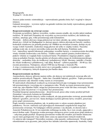 Biogeografia Wykład 9 / 18-04-2012 Jeszcze jeden termin: reintrodukcja – wprowadzanie gatunku który był i wyginął w danym miejscu. Gatunek inwazyjny – wywiera wpływ na gatunki rodzime (nie każdy wprowadzony gatunek staje się inwazyjnym). Rozprzestrzenianie się zwierząt czynne Zwierzęta są ruchliwe, lądowe wszystkie, wodne czasem osiadłe, ale zwykle jakieś stadium ruchliwe. W skali kuli Ziemskiej nie wszystkie są rzeczywiście ruchliwe, ale niektóre np. renifery, antylopy gnu, wilki przemierzają setki kilometrów. Pływanie – dobrzy pływacy mogą pokonywać też duże odcinki, np. jeden z hipopotamów dostał się z Afryki na Madagaskar (w dawnej epoce), dobrze pływają też bawoły, renifery, krokodyle różańcowe (te potrafią przebyć do 1000km na otwartym oceanie, dostaje się na wyspy wokół Australii). Zaskrońce mogą pływać ale tylko w ciepłej wodzie. Naczelne unikają wody tak, że nawet niewielka rzeka jest dla nich barierą. Podobnie susły. Lot – najszybszy sposób lokomocji, pokonujący wszelkie bariery, o rozmieszczeniu decydują wtedy warunki środowiska a nie bariery. Trudno często znaleźć granicę środowiskową u ptaków właśnie ze względu brak wyraźnych barier. Przykładowe migracje ptaków, szpak – zimą na południe Europy, kaczka górska od obszaru arktycznego do śródziemnomorskiego, dzierzba – zachodnia Azja, do środkowej i południowej Afryki. Bociany, jaskółki z Europy do Afryki środkowej i południowej, i tak dalej. Rekord – rybitwa popielata – 30-40 tys. km rocznie przemierza. Nietoperze, rekord 3500 km na Hawaje z Ameryki Płn. A więc o rozmieszczeniu zwykle mówi się w przypadku ssaków z wyjątkiem ssaków morskich i nietoperzy, których dyspersja jest bardzo duża. Rozprzestrzenianie się bierne Anemochoria, dotyczy głównie nasion roślin, ale dotyczy też niektórych zwierząt albo ich stadiów przetrwalnych. Pajączki – babie lato. Zarodniki bakterii, grzybów. Trąba powietrzna może przenieść cały zbiornik wodny razem ze zwierzętami. W nietrwałych zbiornikach wodnych są zwierzęta których jaja wymagają wręcz przesuszenia lub przemarznięcia i rozwijają się w następnym roku. Wtedy są często przenoszone przez wiatr (np. jaja efipialne Dafni, mogą być przenoszone przez wiatr lub inne zwierzęta). Wrotki mogą się same incystować i w tej postaci być przenoszone. Przykład dyspersji anemochorycznej – drozd kwiczoł, przez silne wiatry przebył pół kuli Ziemskiej i utworzyły kolonię na Grenlandii. Hydrochoria – głównie dotyczy roślin wodnych, ale jaja przetrwalne zwierząt, przetrwalniki bakterii i grzybów, jest też tzw. fauna dryfująca (syrton) głównie larwy owadów, porywana przez prąd i przenoszona. Prądy morskie roznoszą plankton, tak, że praktycznie w całym oceanie plankton jest jednakowy. Na tzw. tratwach czyli pływających elementach czegokolwiek mogą być przenoszone zwierzęta. Na Galapagos robiono pomiary i się okazało, że dociera tam z Ameryki Południowej do 16 ton materiału roślinnego na dobę. Są w tym owady, pajęczaki a nawet drobne ssaki. Dyspersja wodna pewnego chrząszcza przez ocean przez prąd zatokowy – całą trasę prądu przebył. Dyspersja powietrzno-wodna dla owadów jest bardzo skuteczna (są też stare geologicznie więc miały dużo czasu na opanowanie różnych środowisk. Co ułatwia taki transport? Niewielkie rozmiary, silne pazurki, roślinożerność. Wśród ssaków rekordzistami są tu gryzonie, jako jedyne bez udziału człowieka opanowały Australię. Gady mają niski metabolizm i odporną skórę na utratę wody i na wodę morską, więc też skutecznie mogą się przenosić zwłaszcza jaszczurki. Zoochoria – zwierzęta roznoszą głównie nasiona roślin (epi i endo). Biochoria – przenoszenie jednego zwierzęcia przez inne, np. pasożytów (epi i endo). Forezja to właściwie to samo. Najwięcej przenoszą ptaki ale też ryby i owady. Mogą być transportowane drobne owady, ślimaki, pijawki, małże, skorupiaki. Przykłady: ptaki wodne przenoszące organizmy wodne, larwy owadów przenoszone przez pszczoły, drobne małże na odnóżach dużych owadów wodnych, larwy szczeżui i skójki na płetwach ryb. Antropochoria – (zawlekanie) zachodzi od zawsze, nasiliło się ok. 1500 roku w czasie wielkich podróży geograficznych. Bariery każdy czynnik który hamuje, uniemożliwia albo utrudnia dyspersję, ale: nie zawsze są one ostre, czasami się zmieniają, coś co jest barierą dla jednego gatunku nie jest nią dla innego. Szczelność barier – najsilniejszą dla lądowych gatunków jest zwykle woda, a dla wodnych ląd. Odległość a wielkość zwierzęcia: w całej Arktyce jest jeden gatunek renifera a wiele gatunków lemingów. Ważny jest też wiek bariery, jak dawno powstała, jaka kolonizacja mogła w związku z tym zajść. Np. bardzo duże różnice faunistyczne między Afryką i Ameryką Płd. Zasolenie może być barierą – u nas za niskie dla wielu zwierząt, podobnie jak zbyt niska temperatura (prądy morskie mogą być barierami). Słona woda ogranicza bardziej przenoszenie się ryb i płazów niż ssaków (prędzej się ssak dostanie na wyspę oceaniczną niż ryba słodkowodna). Co np. na Saharze naprawdę stanowi barierę? Nie zawsze łatwo określić, może być wiele czynników. Barierą może być dla jednego gatunku zasięg innego gatunku (konkurencja). Sahara oddziela Holarktyczną krainę od Etiopskiej, jest wyraźna bariera dla większości zwierząt. Wysokie góry – ukształtowanie, klimat, brak roślinności – często są barierą. Istotne jest czy są położone południkowo czy równoleżnikowo, w Europie wyraźnie rozdzielają krainy od siebie, np. Himalaje rozdzielają Holarktyczną od Orientalnej. Jeśli są położone południkowo jak w Ameryce, to mogą gatunki penetrować z północy na południe i na odwrót. W morzach są takie organizmy które występują praktycz