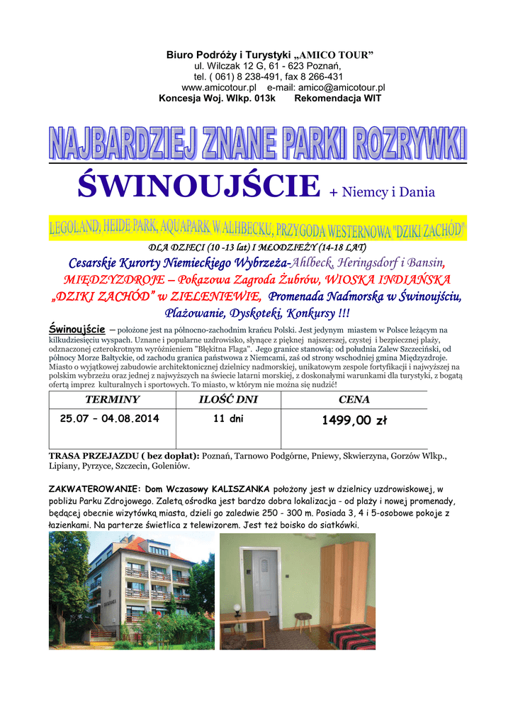 Biuro Podróży i Turystyki „AMICO TOUR” ul. Wilczak 12 G, 61 - 623 Poznań, tel. ( 061) 8 238-491, fax 8 266-431 www.amicotour.pl e-mail: [email protected] Koncesja Woj. Wlkp. 013k Rekomendacja WIT ŚWINOUJŚCIE + Niemcy i Dania DLA DZIECI (10 -13 lat) I MŁ MŁODZIEŻ ODZIEŻY (14(14-18 LAT) Cesarskie Kurorty Niemieckiego WybrzeżaWybrzeża-Ahlbeck, Heringsdorf i Bansin, MIĘDZYZDROJE – Pokazowa Zagroda Żubrów, WIOSKA INDIAŃSKA „DZIKI ZACHÓD” w ZIELENIEWIE, Promenada Nadmorska w Świnoujściu, Plażowanie, Dyskoteki, Konkursy !!! Świnoujście – położone jest na północno-zachodnim krańcu Polski. Jest jedynym miastem w Polsce leżącym na kilkudziesięciu wyspach. Uznane i popularne uzdrowisko, słynące z pięknej najszerszej, czystej i bezpiecznej plaży, odznaczonej czterokrotnym wyróżnieniem "Błękitna Flaga". Jego granice stanowią: od południa Zalew Szczeciński, od północy Morze Bałtyckie, od zachodu granica państwowa z Niemcami, zaś od strony wschodniej gmina Międzyzdroje. Miasto o wyjątkowej zabudowie architektonicznej dzielnicy nadmorskiej, unikatowym zespole fortyfikacji i najwyższej na polskim wybrzeżu oraz jednej z najwyższych na świecie latarni morskiej, z doskonałymi warunkami dla turystyki, z bogatą ofertą imprez kulturalnych i sportowych. To miasto, w którym nie można się nudzić! TERMINY ILOŚĆ DNI CENA 25.07 – 04.08.2014 11 dni 1499,00 zł TRASA PRZEJAZDU ( bez dopłat): Poznań, Tarnowo Podgórne, Pniewy, Skwierzyna, Gorzów Wlkp., Lipiany, Pyrzyce, Szczecin, Goleniów. ZAKWATEROWANIE: Dom Wczasowy KALISZANKA położony jest w dzielnicy uzdrowiskowej, w pobliżu Parku Zdrojowego. Zaletą ośrodka jest bardzo dobra lokalizacja - od plaży i nowej promenady, będącej obecnie wizytówką miasta, dzieli go zaledwie 250 - 300 m. Posiada 3, 4 i 5-osobowe pokoje z łazienkami. Na parterze świetlica z telewizorem. Jest też boisko do siatkówki. PROGRAM: WYCIECZKA AUTOKAROWA: HEIDE PARK to jedno z największych wesołych miasteczek w Europie. Jego bogata oferta przyciąga codziennie setki turystów. Na terenie parku znajdują się m. in.: zjeżdżalnie, łodzie i tratwy, kolejki górskie, kraina piratów, akrobaci, różnego typu rolby, karuzele obrotowo-młynowe, kolejki ziemne i powietrzne, wieże widokowe. Można tu obejrzeć pokaz tresury delfinów i fok, paradę egzotycznych ptaków, pokazy klownów,teatry kukiełkowe oraz wiele innych atrakcji. Wyjazd na wycieczkę ok. 02.00, pobyt około 8 godz., powrót do ośrodka ok. 24.00. Obowiązkowo na bilet wstępu należy posiadać 18 euro. W cenie biletu zawarta jest możliwość nieograniczonego korzystania ze wszystkich działających urządzeń rekreacyjnych. WYCIECZKA AUTOKAROWA: LEGOLAND – DANIA - zapraszamy do najsławniejszego z Parków Rozrywki zbudowanego z klocków LEGO. Podzielony jest na kilka krain tematycznych: DuploLand, Imagination Zone, LEGOREDO Town, Adventure Land, Miniland, Pirate Land, Lego City, Knights Kingdom, Viking Land. W Minilandzie z 20 milionów klocków zbudowane są najważniejsze obiekty architektoniczne świata m.in. Statua Wolności czy Wieża Eiffla. Wyjazd na wycieczkę ok. 01.00, pobyt około 8 godz., powrót do ośrodka ok. 24.00.Obowiązkowo na bilet wstępu należy posiadać 39 euro. W cenie biletu zawarta jest możliwość korzystania ze wszystkich działających atrakcji. WYCIECZKA AUTOKAROWA DO ALHBECK I CESARSKICH KURORTÓW –poznamy niemieckie kąpieliska na wyspie Uznam. AQUAPARK/TERMY – NIEMCY. Kompleks nowoczesnych basenów z wodą termalną. Obowiązkowo na bilet wstępu należy posiadać 8 euro. W cenie biletu zawarta jest możliwość korzystania ze wszystkich działających urządzeń rekreacyjnych PAKIET „Świat Kąpieli”. WYCIECZKA AUTOKAROWA: MIĘDZYZDROJE, Zagroda Pokazowa Żubrów, punkt widokowy „Góra Gosań”, spacer Aleją Gwiazd, kąpiele w morzu, plażowanie. WYCIECZKA AUTOKAROWA „DZIKI ZACHÓD” WIOSKA INDIAŃSKA koło KOŁOBRZEGU w Zieleniewie jest idealnym miejscem dla spragnionych przygód w stylu western, miejscem gdzie można spotkać prawdziwych kowboi, odwiedzić saloon, zobaczyć westernowe show, napad na bank, pokazy kaskaderskie. Można udać się do wioski indiańskiej, odwiedzić indiański wigwam, posłuchać indiańskich opowieści, zobaczyć egzotyczne stroje Indian i ich barwne tańce, uczestnictwo w obrzędach indiańskich. PLAŻOWANIE, KĄPIELE MORSKIE, piłka plażowa, KONKURSY: Rzeźb z piasku, turniej tenisa stołowego DYSKOTEKI, PROMENADA NADMORSKA W ŚWINOUJŚCIU, spacery brzegiem morza, poszukiwanie bursztynów, niezapomniane widoki podczas zachodów słońca. ŚWIADCZENIA: - przejazd autokarem z klimatyzacją, DVD, zbiórka o godz. 7.30, wyjazd z Poznania o godz.8.00 ul. Zwierzyniecka przy starym ZOO - zakwaterowanie 10 noclegów w pokojach wg.opisu - wyżywienie 3 x dziennie + dodatek podwieczorkowy , od obiadu w dniu przyjazdu, do śniadania w dniu wyjazdu + suchy prowiant na powrót, na całodzienne wycieczki uczestnicy otrzymają suchy prowiant, - program wg.opisu - doświadczona kadra pedagogiczna, ratownik, opieka miejscowych służb medycznych - ubezpieczenie od NNW i KL ( Niemcy) dzieci cierpiące na choroby przewlekłe muszą zostać ubezpieczone przez rodziców) UWAGA! Obowiązkowo należy posiadać: łącznie 65 Euro na wejścia do Parków Rozrywki (wymienione w programie), ewentualnie kwotę 299 zł-równowartość kwoty w euro płatne w biurze przed wyjazdem. Paszport lub dowód tymczasowy, legitymację szkolną, mały plecak na wycieczki, kurtkę przeciwdeszczową, wygodne obuwie, czapkę, strój kąpielowy, krem z filtrem. POWRÓT: w ostatnim dniu turnusu przewidywany powrót do Poznania ok. godziny 18.00-19.00