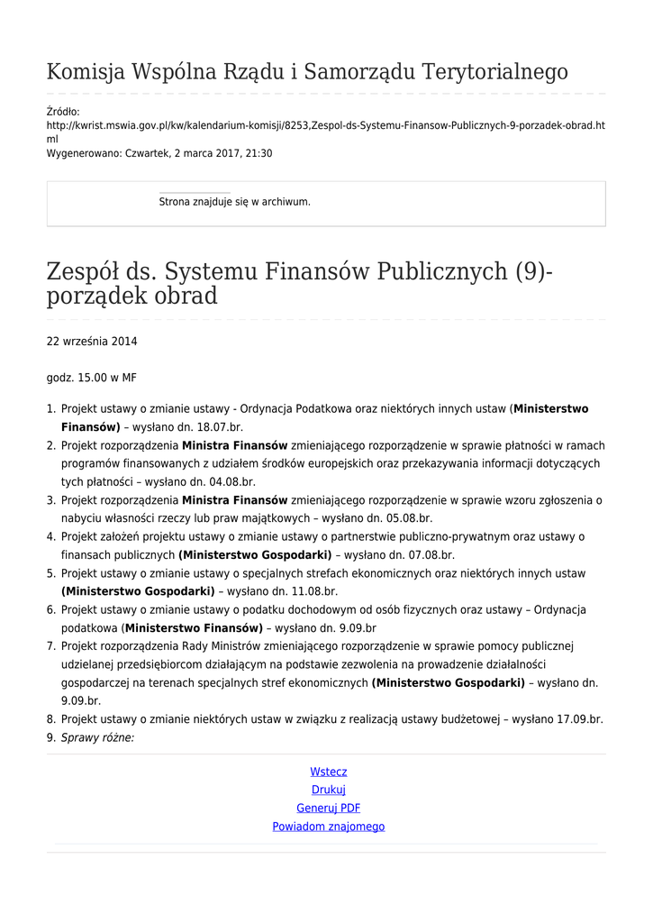 Komisja Wspólna Rządu i Samorządu Terytorialnego Źródło: http://kwrist.mswia.gov.pl/kw/kalendarium-komisji/8253,Zespol-ds-Systemu-Finansow-Publicznych-9-porzadek-obrad.ht ml Wygenerowano: Czwartek, 2 marca 2017, 21:30 Strona znajduje się w archiwum. Zespół ds. Systemu Finansów Publicznych (9)porządek obrad 22 września 2014 godz. 15.00 w MF 1. Projekt ustawy o zmianie ustawy - Ordynacja Podatkowa oraz niektórych innych ustaw (Ministerstwo Finansów) – wysłano dn. 18.07.br. 2. Projekt rozporządzenia Ministra Finansów zmieniającego rozporządzenie w sprawie płatności w ramach programów finansowanych z udziałem środków europejskich oraz przekazywania informacji dotyczących tych płatności – wysłano dn. 04.08.br. 3. Projekt rozporządzenia Ministra Finansów zmieniającego rozporządzenie w sprawie wzoru zgłoszenia o nabyciu własności rzeczy lub praw majątkowych – wysłano dn. 05.08.br. 4. Projekt założeń projektu ustawy o zmianie ustawy o partnerstwie publiczno-prywatnym oraz ustawy o finansach publicznych (Ministerstwo Gospodarki) – wysłano dn. 07.08.br. 5. Projekt ustawy o zmianie ustawy o specjalnych strefach ekonomicznych oraz niektórych innych ustaw (Ministerstwo Gospodarki) – wysłano dn. 11.08.br. 6. Projekt ustawy o zmianie ustawy o podatku dochodowym od osób fizycznych oraz ustawy – Ordynacja podatkowa (Ministerstwo Finansów) – wysłano dn. 9.09.br 7. Projekt rozporządzenia Rady Ministrów zmieniającego rozporządzenie w sprawie pomocy publicznej udzielanej przedsiębiorcom działającym na podstawie zezwolenia na prowadzenie działalności gospodarczej na terenach specjalnych stref ekonomicznych (Ministerstwo Gospodarki) – wysłano dn. 9.09.br. 8. Projekt ustawy o zmianie niektórych ustaw w związku z realizacją ustawy budżetowej – wysłano 17.09.br. 9. Sprawy różne: Wstecz Drukuj Generuj PDF Powiadom znajomego