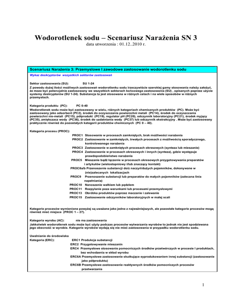 Wodorotlenek sodu – Scenariusz Narażenia SN 3 data utworzenia : 01.12..2010 r. Scenariusz Narażenia 3: Przemyslowe I zawodowe zastosowanie wodorotlenku sodu Wykaz deskryptorów wszystkich sektorów zastosowań Sektor zastosowania (SU): SU 1-24 Z powodu dużej ilości możliwych zastosowań wodorotlenku sodu irzeczywiście szerokiej gamy stosowania należy założyć, że moze być potencjalnie zastosowany we wszystkich sektorach końcowego zastosowania (SU) , opisanych poprzez użycie systemy deskryptorów (SU 1-24). Substancja ta jest stosowana w różnych celach i na wiele sposobów w różnych przemysłach. Kategoria produktu (PC): PC 0-40 Wodorotlenek sodu może być zastosowany w wielu, różnych kategoriach chemicznych produktów (PC). Może być zastosowany jako adsorbent (PC2), środek do oczyszczania powierzchni metali (PC14), środek do oczyszczania powierzchni nie-metali (PC15), półprodukt (PC19), regulator pH (PC20), odczynnik laboratoryjny (PC21), środek myjący (PC35), zmiękczacz wody (PC36), środek do uzdatniania wody (PC37) lub odczynnik ekstrakcyjny . Może być zastosowany praktycznie również do pozostałych kategorii produktów chemicznych (PC 0 – 40). Kategoria procesu (PROC): PROC1 Stosowanie w procesach zamkniętych, brak możliwości narażenia PROC2 Zastosowanie w zamkniętych, trwałych procesach z możliwością sporadycznego, kontrolowanego narażenia PROC3 Zastosowanie w zamkniętych procesach okresowych (synteza lub mieszanie) PROC4 Zastosowanie w procesach okresowych i innych (synteza), gdzie występuje prawdopodobieństwo narażenia PROC5 Mieszanie bądź łączenie w procesach okresowych przygotowywania preparatów i artykułów (wielostopniowy i/lub znaczący kontakt) PROC8a/b Przenoszenie substancji do/z naczyń/dużych pojemników, dokonywane w (nie)zalecanych lokalizacjach PROC9 Przenoszenie substancji lub preparatów do małych pojemników (zalecana linia napełniania) PROC10 Nanoszenie wałkiem lub pędzlem PROC11 Rozpylanie poza warunkami lub procesami przemysłowymi PROC13 Obróbka produktów poprzez maczanie i zalewanie PROC15 Zastosowanie odczynników laboratoryjnych w małej scali Kategorie procesów wymienione powyżej są uważane jako jedne z najważniejszych, ale pozostałe kategorie procesów mogą również mieć miejsce (PROC 1 – 27). Kategoria wyrobu (AC): nie ma zastosowania Jakkolwiek wodorotlenek sodu może być użyty podczas procesów wytwarzania wyrobów to jednak nie jest spodziewana jego obecność w wyrobie. Kategorie wyrobów wydają się nie mieć zastosowania w przypadku wodorotlenku sodu. Uwalnianie do środowiska Kategoria (ERC): ERC1 Produkcja substancji ERC2 Przygotowywanie mieszanin ERC4 Przemysłowe stosowanie pomocniczych środków przetwórczych w procesie I produktach, bez wchodzenia w skład wyrobu ERC6A Przemysłowe zastosowanie skutkujące eyprodukowaniem innej substancji (zastosowanie jako półproduktu) ERC6B Przemysłowe zastosowanie reaktywnych środków pomocniczych procesów przetwarzania 1 ERC7 Przemysłowe zastosowanie substancji w systemach zamkniętych ERC8A Szeroki zakres zastosowań w pomieszczeniach zamkniętych jako środka pomocniczego w otwartych systemach ERC8B Szeroki zakres zastosowań substancji reaktywnych w pomieszczeniach zamkniętych, w systemach otwartych ERC8D Szeroki zakres zastosowan jako środka pomocniczego na otwartej przestrzeni w otwartych systemach ERC9A Szeroki zakres zastosowań substancji w pomieszczeniach zamkniętych I systemach zamkniętych Kategorie uwalniane do środowiska wymienione powyżej są uważane jako jedne z najważniejszych, ale pozostałe kategorie uwalniania w warunkach przemysłowych mogą również mieć miejsce (ERC 1-12). Inne objaśnienia Typowe zastosowania obejmują ; produkcje organicznych I nieorganicznych chemikaliów, produkcję I wybielanie pulpy papierniczej, produkcję aluminium I innych metali, przemysł spożywczy, uzdatnianie wody, produkcję tekstyliów, zawodowe zastosowania końcowe przygotowanych produktów I inne zastosowania przemysłowe. EU Ocena ryzyka Została wykonana Ocena Ryzyka w krajach UE w oparciu o istniejące w tej sprawie Rozporządzenie Rady nr 793/93. Stosowny Raport Oceny Ryzyka został ukończony w roku 2007 i jest dostępny pod poniższym adresem internetowym : http://ecb.jrc.ec.europa.eu/DOCUMENTS/Existing-Chemicals/RISK_ASSESSMENT/REPORT/sodiumhydroxidereport416.pdf Powiązany scenariusz narażenia (1) kontrola narażenia środowiskowego Cechy produktu Stały lub ciekły wodorotlenek sodu, o całym zakresie stężeń (0-1-- %), w postaci stałej : niska klasa bezpylowości Częstotliwość I czas trwania stosowania/narażenia W sposób ciągły Warunki operacyjne I srodki kontroli w miejscu stosowania do redukcji lub ograniczenia rozlań/rozsypów, emisji do powitrza I uwalniania do gruntu. Stosowne środki kontroli ryzyka narażenia środowiska mające na celu uniknięcie przedostawania się roztworu wodorotlenku sodu do miejskich ścieków lub do wód powierzchniowych, skutkującego znaczącymi zmianami wartości pH. Systematyczne sprawdzanie wartości pH podczas wprowadzania do otwartych wód jest wymagane. Generalnie zrzuty powinny być tak przeprowadzane aby minimalizować zmiany pH w stojących wodach powierzchniowych. Ogólnie większość organizmów wodnych toleruje pH w zakresie 6-9. Zostało o tym wspomniane również w wynikach standardowych testów, wykonywanych na zlecenie OECD, w odniesieniu do wodnych organizmów. Warunki I środki związane z zewnętrznym oczyszczaniem lub odzyskiwaniem odpadów w celu ich usunięcia. Nie występują odpady wodorotlenku sodu w postaci stałej. Odpady ciekłego wodorotlenku sodu powinny być użyte ponownie lub zrzucone do ścieków przemysłowych i zneutralizowane, jeżeli to konieczne. Powiązany scenariusz narażenia (2), kontrola narażenia pracowników Cechy produktu Stały lub ciekły wodorotlenek sodu, o całym zakresie stężeń (0-1-- %), w post