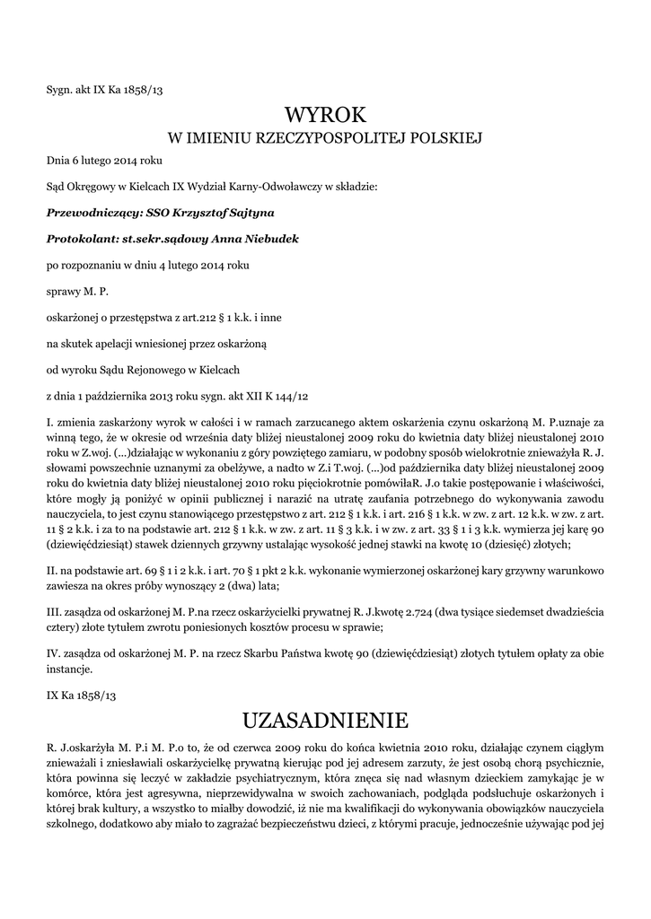 Sygn. akt IX Ka 1858/13 WYROK W IMIENIU RZECZYPOSPOLITEJ POLSKIEJ Dnia 6 lutego 2014 roku Sąd Okręgowy w Kielcach IX Wydział Karny-Odwoławczy w składzie: Przewodniczący: SSO Krzysztof Sajtyna Protokolant: st.sekr.sądowy Anna Niebudek po rozpoznaniu w dniu 4 lutego 2014 roku sprawy M. P. oskarżonej o przestępstwa z art.212 § 1 k.k. i inne na skutek apelacji wniesionej przez oskarżoną od wyroku Sądu Rejonowego w Kielcach z dnia 1 października 2013 roku sygn. akt XII K 144/12 I. zmienia zaskarżony wyrok w całości i w ramach zarzucanego aktem oskarżenia czynu oskarżoną M. P.uznaje za winną tego, że w okresie od września daty bliżej nieustalonej 2009 roku do kwietnia daty bliżej nieustalonej 2010 roku w Z.woj. (...)działając w wykonaniu z góry powziętego zamiaru, w podobny sposób wielokrotnie znieważyła R. J. słowami powszechnie uznanymi za obelżywe, a nadto w Z.i T.woj. (...)od października daty bliżej nieustalonej 2009 roku do kwietnia daty bliżej nieustalonej 2010 roku pięciokrotnie pomówiłaR. J.o takie postępowanie i właściwości, które mogły ją poniżyć w opinii publicznej i narazić na utratę zaufania potrzebnego do wykonywania zawodu nauczyciela, to jest czynu stanowiącego przestępstwo z art. 212 § 1 k.k. i art. 216 § 1 k.k. w zw. z art. 12 k.k. w zw. z art. 11 § 2 k.k. i za to na podstawie art. 212 § 1 k.k. w zw. z art. 11 § 3 k.k. i w zw. z art. 33 § 1 i 3 k.k. wymierza jej karę 90 (dziewięćdziesiąt) stawek dziennych grzywny ustalając wysokość jednej stawki na kwotę 10 (dziesięć) złotych; II. na podstawie art. 69 § 1 i 2 k.k. i art. 70 § 1 pkt 2 k.k. wykonanie wymierzonej oskarżonej kary grzywny warunkowo zawiesza na okres próby wynoszący 2 (dwa) lata; III. zasądza od oskarżonej M. P.na rzecz oskarżycielki prywatnej R. J.kwotę 2.724 (dwa tysiące siedemset dwadzieścia cztery) złote tytułem zwrotu poniesionych kosztów procesu w sprawie; IV. zasądza od oskarżonej M. P. na rzecz Skarbu Państwa kwotę 90 (dziewięćdziesiąt) złotych tytułem opłaty za obie instancje. IX Ka 1858/13 UZASADNIENIE R. J.oskarżyła M. P.i M. P.o to, że od czerwca 2009 roku do końca kwietnia 2010 roku, działając czynem ciągłym znieważali i zniesławiali oskarżycielkę prywatną kierując pod jej adresem zarzuty, że jest osobą chorą psychicznie, która powinna się leczyć w zakładzie psychiatrycznym, która znęca się nad własnym dzieckiem zamykając je w komórce, która jest agresywna, nieprzewidywalna w swoich zachowaniach, podgląda podsłuchuje oskarżonych i której brak kultury, a wszystko to miałby dowodzić, iż nie ma kwalifikacji do wykonywania obowiązków nauczyciela szkolnego, dodatkowo aby miało to zagrażać bezpieczeństwu dzieci, z którymi pracuje, jednocześnie używając pod jej adresem w tym samym czasie i miejscu słów uznanych powszechnie za obelżywe i wulgarne, m.in. wariatka, pierdolona nauczycielka i kurwa, tj. o przestępstwo z art. 212 § l k.k. i art. 216 § l k.k. w zw. z art. 12 k.k. Sąd Rejonowy w Kielcach rozpoznając sprawę po raz pierwszy, wyrokiem z dnia 20 czerwca 2011 r. w sprawie sygn. akt XII K 1509/10 I. w ramach zarzucanego czynu oskarżonego M. P.uznał za winnego tego, że w okresie od czerwca 2009 roku do kwietnia 2010 roku, działając w wykonaniu z góry powziętego zamiaru, wielokrotnie znieważał R. J.słowami powszechnie uznawanymi za obelżywe oraz pomawiał ją o takie postępowanie i właściwości, które mogły ją poniżyć w opinii publicznej oraz narazić na utratę zaufania potrzebnego do wykonywania zawodu nauczyciela, to jest przestępstw z art. 216 § l k.k. i art. 212 § l k.k. w zw. z art. 11 § 2 k.k. w zw. z art. 12 k.k. i na podstawie art. 212 § l k.k. w zw. z art. 11 § 3 k.k. i art. 33 § l i 3 k.k. wymierzył mu karę grzywny w rozmiarze 150 (sto pięćdziesiąt) stawek dziennych, przy ustaleniu wysokości jednej stawki dziennej na kwotę 10 (dziesięć) złotych; II. w ramach zarzucanego czynu oskarżoną M. P.uznał za winną tego, że w okresie od września 2009 roku do kwietnia 2010 roku, działając w wykonaniu z góry powziętego zamiaru, wielokrotnie znieważała R. J.słowami powszechnie uznawanymi za obelżywe oraz pomawiała ją o takie postępowanie i właściwości, które mogły ją poniżyć w opinii publicznej oraz narazić na utratę zaufania potrzebnego do wykonywania zawodu nauczyciela, to jest przestępstwo z art. 216 § l k.k. i art. 212 § l k.k. w zw. z art. 11 § 2 k.k. w zw. z art. 12 k.k. i na podstawie art. 212 § l k.k. w zw. z art. 11 § 3 k.k. i art. 33 § l i 3 k.k. wymierzył jej karę grzywny w rozmiarze 100 (sto) stawek dziennych, przy ustaleniu wysokości jednej stawki dziennej na kwotę 10 (dziesięć) złotych; III. na podstawie art. 69 § l i 2 k.k. i art. 70 § l pkt. 2 k.k. wykonanie orzeczonych wobec M. P.w pkt. I oraz M. P.w pkt. II kar grzywny warunkowo zawiesił ustalając okres próby na 3 (trzy) lata; IV. na podstawie art. 628 pkt. l k.p.k. zasądził od M. P.i M. P.solidarnie na rzecz oskarżycielki prywatnej R. J.kwotę 1.164 (jeden tysiąc sto sześćdziesiąt cztery) złote z tytułu zwrotu poniesionych przez nią kosztów procesu. Wskutek apelacji oskarżonych wniesionych na ich korzyść Sąd Okręgowy w Kielcach wyrokiem z dnia 30 grudnia 2011 r. w sprawie sygn. akt IX Ka 1288/11 uchylił zaskarżony wyrok i sprawę przekazał do ponownego rozpoznania. Rozpoznając sprawę ponownie Sąd Rejonowy w Kielcach wyrokiem z dnia 1 października 2013 r. w sprawie sygn. akt XII K 144/12 w części wstępnej wskazał, iż M. P. została oskarżona o to, że: I. od września 2009 roku do kwietnia 2010 roku w wykonaniu z góry powziętego zamiaru w pismach kierowanych do sądu i policji, przedsiębiorstw: energetycznego oraz wodociągów i kanalizacji, gminy oraz w wypowiedziach kierowanych bezpośrednio do R. J.jak i osób trzecich, pomawiała pokrzywdzoną o takie postępowanie i właściwośc