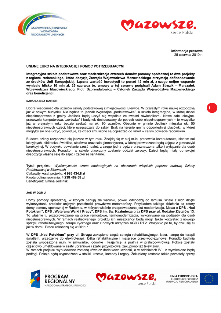 informacja prasowa 25 czerwca 2010 r. UNIJNE EURO NA INTEGRACJĘ I POMOC POTRZEBUJĄCYM Integracyjna szkoła podstawowa oraz modernizacja czterech domów pomocy społecznej to dwa projekty z regionu radomskiego, które decyzją Zarządu Województwa Mazowieckiego otrzymają dofinansowanie ze środków Unii Europejskiej. Łączna wartość inwestycji to ponad 12 mln zł, z czego unijne wsparcie wyniesie blisko 10 mln zł. 25 czerwca br. umowy w tej sprawie podpisali Adam Struzik – Marszałek Województwa Mazowieckiego, Piotr Szprendałowicz – Członek Zarządu Województwa Mazowieckiego oraz beneficjenci. SZKOŁA BEZ BARIER Dobra wiadomość dla uczniów szkoły podstawowej z miejscowości Bierwce. W przyszłym roku naukę rozpoczną już w nowym budynku. Nie będzie to jednak zwyczajna „podstawówka”, a szkoła integracyjna, w której dzieci niepełnosprawne z gminy Jedlińsk będą uczyć się wspólnie ze swoimi rówieśnikami. Nowe sale lekcyjne, pracownia komputerowa, „zerówka” i budynek dostosowany do potrzeb osób niepełnosprawnych – to wszystko już w przyszłym roku będzie czekać na ok. 90 uczniów. Obecnie w gminie Jedlińsk mieszka ok. 50 niepełnosprawnych dzieci, które uczęszczają do szkół. Brak na terenie gminy odpowiedniej placówki, w której mogłyby się one uczyć, powoduje, że dzieci zmuszone są dojeżdżać do szkół w całym powiecie radomskim. Budowa szkoły rozpocznie się jeszcze w tym roku. Znajdą się w niej m.in. pracownia komputerowa, siedem sal lekcyjnych, biblioteka, świetlica, stołówka oraz sala gimnastyczna, w której prowadzone będą zajęcia z gimnastyki korekcyjnej. W budynku powstanie sześć toalet, z czego jedna będzie przeznaczona tylko i wyłącznie dla osób niepełnosprawnych. Ponadto w szkole utworzony zostanie oddział zerowy. Dzieci będą miały do swojej dyspozycji własną salę do zajęć i zaplecze sanitarne. Tytuł projektu: Wyrównywanie szans edukacyjnych na obszarach wiejskich poprzez budowę Szkoły Podstawowej w Bierwcach Całkowity koszt projektu: 4 986 434,8 zł Kwota dofinansowania: 4 238 469,58 zł Beneficjent: Gmina Jedlińsk JAK W DOMU Domy pomocy społecznej, w których panują złe warunki, powoli odchodzą do lamusa. Wiele z nich dzięki wykorzystaniu środków unijnych przechodzi prawdziwe metamorfozy. Przykładem takiego działania są cztery domy pomocy społecznej w Radomiu, w których właśnie przeprowadzana jest modernizacja. Mowa o DPS „Nad Potokiem”, DPS „Weterana Walki i Pracy”, DPS im. Św. Kazimierza oraz DPS przy ul. Rodziny Ziętalów 13. To właśnie tu przeprowadzane są prace remontowe, termomodernizacja, wykonywane są podjazdy dla osób niepełnosprawnych. W ramach realizowanego projektu ich mieszkańcy będą mogli także korzystać z nowego sprzętu rehabilitacyjnego i terapeutycznego oraz z nowych urządzeń AGD i RTV. Wszystko po to, by czuli się tu jak w domu. Prace zakończą się w 2011 r. W DPS „Nad Potokiem” przy ul. Struga zakupiono część sprzętu rehabilitacyjnego: laser, lampę do terapii światłem, urządzenie do elektroterapii, łóżka rehabilitacyjne i materace przeciwodleżynowe. Ponadto kuchnia została wyposażona m.in. w zmywarkę, lodówkę i krajalnicę, a pralnia w pralnico-wirówkę. Pokoje zostały częściowo umeblowane w szafy ubraniowe i szafki przyłóżkowe, zakupiono też telewizory. W ramach projektu wybudowane zostaną również dodatkowe łazienki, a w oddziałach IV i V wymienione będą podłogi. Pokoje będą wyposażone w stoliki, krzesła, komody i regały. Zakupiony zostanie także pozostały sprzęt 1 rehabilitacyjny, tj.: stół, rotor, chodzik i krzyżak. W budynku zainstalowane będą: nowa centrala telefoniczna, sygnalizacja pożarowa, radiowęzeł oraz system monitoringu zewnętrznego. W DPS „Weterana Walki i Pracy” przy ul. Wyścigowej przeprowadzono już termomodernizację pawilonu D, pralni i budynku socjalnego. Zakupiono także elementy do instalacji sieci telewizyjnej, zestawy komputerowe i serwer, a pralnię wyposażono w pralnico-wirówkę, stół prasowalniczy oraz suszarkę. Kupiono łóżka rehabilitacyjne, aparat EKG. Ponadto utworzony został pokój kąpielowy, w którym zainstalowano nosidło, podnośnik i wannę. Zakupiono również niezbędny sprzęt do kuchni: zmywarkę, piec konwekcyjno-parowy, komorę chłodniczą oraz patelnię elektryczną. W ramach projektu przeprowadzona zostanie też termomodernizacja pawilonu A, a w korytarzu wymienione będą podłogi . Placówka zostanie wyposażona również w aparat do krioterapii, łóżka rehabilitacyjne czy też zestawy komputerowe. Dodatkowo zakupione będą termosy, w których gorące posiłki będą dostarczane do najbardziej chorych osób. Budynek, w którym mieści się DPS im. Św. Kazimierza przy ul. Garbarskiej, przeszedł już termomodernizację. Kuchnia została umeblowana oraz wyposażona w lodówkę na próbki żywności, chłodziarko-zamrażarkę i chłodziarkę. W łazienkach pojawiły się nowe pralki i pralko-suszarki. Zakupiono również aparat EKG i zestaw do laseroterapii. Ponadto umeblowane zostały pokoje pielęgniarek, gabinet pomocy doraźnej oraz pomieszczenia socjalne. W ramach inwestycji zmodernizowany zostanie dach budynku głównego, powstanie pokój gościnny i szatnia dla odwiedzających. Zakupione będą lodówki na leki. Pralnia zostanie wyposażona w pralnico-wirówkę, wirówkę i suszarkę. W kuchni zamontowany zostanie m.in. piec konwekcyjno-parowy, a pokoj mieszkańców zostaną całkowicie umeblowane. Przewidziana jest również termomodernizacja budynku gospodarczego, oraz wymiana podłóg na antypoślizgowe. Zakupione będą też elementy do sygnalizacji przeciwpożarowej, alarmowoprzyzywowej i monitoringu. Przebudowa i przyłączenie budynku do miejskiej sieci ciepłowniczej oraz naprawa dachu to prace przeprowadzone do tej pory w DPS przy ul. Rodziny Ziętalów 13. Zakupione zostały również meble do 