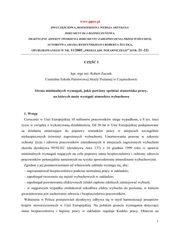 www.ppoz.pl DWUCZĘŚCIOWA, ROZSZERZONA WERSJA ARTYKUŁU DOKUMENT DLA BEZPIECZEŃSTWA. PRAKTYCZNE ASPEKTY TWORZENIA DOKUMENTU ZABEZPIECZENIA PRZED WYBUCHEM, AUTORSTWA ADAMA RYDZYŃSKIEGO I ROBERTA ŻUCZKA, OPUBLIKOWANEGO W NR. 11/2005 „PRZEGLĄDU POŻARNICZEGO” (STR. 21–22) CZĘŚĆ I kpt. mgr inż. Robert Żuczek Centralna Szkoła Państwowej Straży Pożarnej w Częstochowie Ocena minimalnych wymagań, jakie powinny spełniać stanowiska pracy, na których może wystąpić atmosfera wybuchowa 1. Wstęp Corocznie w Unii Europejskiej 10 milionów pracowników ulega wypadkom, a 8 tys. traci życie w związku z wykonywaną działalnością. Od 30 lat w Unii Europejskiej podejmowane są działania zmierzające do poprawy warunków pracy w miejscach szczególnie niebezpiecznych (również zagrożonych wybuchem). Unormowania prawne w zakresie ochrony życia i zdrowia pracowników zatrudnionych w miejscach zagrożonych wybuchem określa dyrektywa 99/92/EC (dyrektywa Atex 137) z 16 grudnia 1999 roku w sprawie minimalnych wymagań mających na celu poprawę stanu bezpieczeństwa i ochrony zdrowia pracowników potencjalnie narażonych na ryzyko spowodowane atmosferami wybuchowymi. Zgodnie z jej postanowieniami od właściciela zakładu wymaga się, aby: – zagwarantował bezpieczeństwo podczas normalnej pracy w zakładzie; – zapobiegał tworzeniu się stężeń wybuchowych w zakładzie; – zapobiegał powstawaniu efektywnych źródeł zapłonu zdolnych zainicjować wybuch; – w najgorszym wypadku zredukował szkodliwe efekty wybuchu do poziomu, w którym gwarantowane jest zachowanie zdrowia i bezpieczeństwa pracowników. Wdrażanie w Polsce postanowień dyrektywy odbywa się w myśl harmonizacji przepisów krajów stowarzyszonych w Unii Europejskiej. Na polskim gruncie wymagania dotyczące stanu bezpieczeństwa i higieny pracy w zakładzie reguluje Kodeks pracy. Obarcza on 1 odpowiedzialnością pracodawcę, który powinien chronić zdrowie i życie pracowników przez zapewnienie bezpieczeństwa i higienicznych warunków pracy. Miejsca, gdzie występują mieszaniny wybuchowe, są szczególnie groźne z punktu widzenia potencjalnych skutków dla pracownika. Dlatego rozporządzenie ministra gospodarki, pracy i polityki społecznej z 29 maja 2003 r. w sprawie minimalnych wymagań dotyczących bezpieczeństwa i higieny pracy pracowników zatrudnionych na stanowiskach pracy, na których może wystąpić atmosfera wybuchowa (Dz. U. nr 107, poz. 1004), jest odpowiedzią na zagrożenia powodowane przez stężenia wybuchowe i jednocześnie implementacją dyrektywy Atex 137. Wiele aspektów bezpieczeństwa wybuchowego wymaga spojrzenia z innej perspektywy, niż miało to miejsce do tej pory. Artykuły mają przybliżyć problematykę stawianych przez dyrektywę [1] i rozporządzenie [2] wymagań. W opracowaniu podane zostaną pewne aspekty wynikające z postanowień prawa, niezbędne do: – identyfikacji i oceny zagrożeń wybuchem stwarzanych przez urządzenia techniczne, procesy technologiczne, surowce; – identyfikacji wystąpienia atmosfer wybuchowych; – prawdopodobieństwa i częstotliwości występowania atmosfer wybuchowych; – prawdopodobieństwa występowania oraz uaktywniania się efektywnych źródeł zapłonu; – oceny skali przewidzianych niepożądanych skutków; – określenia, jakie środki zapobiegawcze należy zastosować, aby zapobiec wystąpieniu atmosfery wybuchowej lub w przypadku wybuchu zminimalizować skutki. Informacje te pozwolą na dokonanie oceny ryzyka i stworzenie dokumentu zabezpieczenia przed wybuchem, wymaganego przez rozporządzenie [2]. Wszystkie działania mają na celu zarówno zapobieganie tworzeniu się atmosfer wybuchowych, eliminowanie źródeł zapłonu, jak i zmniejszanie skutków ewentualnego wybuchu. Artykuł 11 dyrektywy 1999/92/EC wymaga od Komisji Europejskiej określenia praktycznych metod w postaci przewodnika dobrej praktyki o niewiążącej strukturze. Opracowany w UE przewodnik kierowany jest do wszystkich zakładów i działań, w których praca z materiałami łatwo palnymi może spowodować pojawienie się niebezpiecznej atmosfery wybuchowej i wywołać wybuch. Pełna nazwa przewodnika: „Minimum requirements for improving the safety and health protection of workers potentially at risk from explosive atmospheres” przetłumaczona na język polski oznacza „Minimalne wymagania dla poprawy ochrony bezpieczeństwa, zdrowia pracowników potencjalnie narażonych na ryzyko ze strony atmosfer wybuchowych”. W Polsce niestety nie doczekaliśmy się oficjalnego tłumaczenia wytycznych (przewodnika) do wdrożenia 2 dyrektywy 1999/92/EC, co do tej pory skutkuje nieporozumieniami w interpretacji niektórych jej zapisów. 2. Podstawowe pojęcia [3] Ryzyko – kombinacja częstości lub prawdopodobieństwa wystąpienia określonego zdarzenia niebezpiecznego i konsekwencji związanych z tym zdarzeniem. Analiza ryzyka – systematyczne stosowanie dostępnych informacji do zidentyfikowania zagrożenia i do oszacowania ryzyka dotyczącego osób, populacji, mienia lub środowiska. Ocena ryzyka – pełny proces analizowania ryzyka i wyznaczania dopuszczalności ryzyka. Oszacowanie ryzyka – proces stosowany do stworzenia miary poziomu analizowanego ryzyka, który składa się z następujących kroków: analizy częstości, analizy konsekwencji i ich połączenia. Wyznaczanie ryzyka – proces, w którym na podstawie analizy ryzyka przeprowadza się oceny dopuszczalności ryzyka i rozpatruje się takie czynniki, jak aspekty socjoekonomiczne i środowiskowe. Zarządzanie ryzykiem – systematyczne wprowadzanie polityki zarządzania, procedur, praktyk do zadań analizowania, wyznaczania i sterowania ryzykiem. 3. Zastosowane rozwiązania Należy zwrócić uwagę, że dyrektywa narzuca państwom członkowskim minimalne wymagania w stosunku do stanowisk pracy zagrożonych wybuchem. Jednakże każde z państw członkowskich ma prawo wprowadzić ostrze
