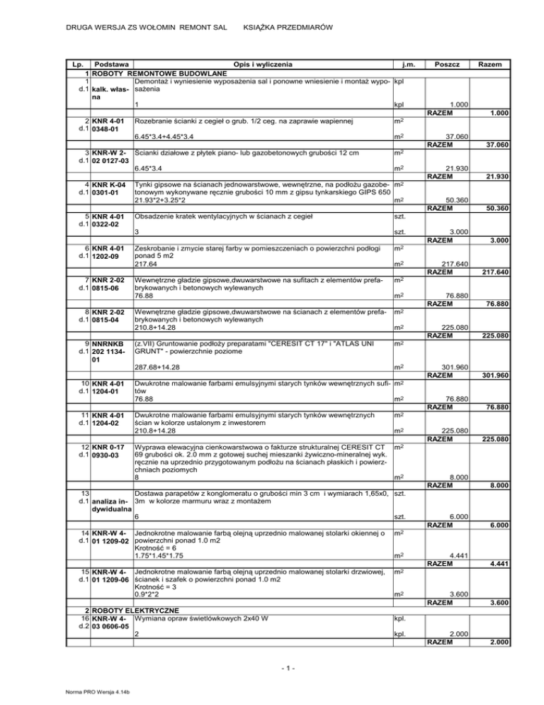 DRUGA WERSJA ZS WOŁOMIN REMONT SAL KSIĄśKA PRZEDMIARÓW Lp. Podstawa Opis i wyliczenia j.m. 1 ROBOTY REMONTOWE BUDOWLANE 1 DemontaŜ i wyniesienie wyposaŜenia sal i ponowne wniesienie i montaŜ wypo- kpl d.1 kalk. włas- saŜenia na 1 kpl 2 KNR 4-01 d.1 0348-01 Rozebranie ścianki z cegieł o grub. 1/2 ceg. na zaprawie wapiennej m2 6.45*3.4+4.45*3.4 m2 3 KNR-W 2- Ścianki działowe z płytek piano- lub gazobetonowych grubości 12 cm d.1 02 0127-03 6.45*3.4 4 KNR K-04 d.1 0301-01 5 KNR 4-01 d.1 0322-02 6 KNR 4-01 d.1 1202-09 7 KNR 2-02 d.1 0815-06 8 KNR 2-02 d.1 0815-04 9 NNRNKB d.1 202 113401 10 KNR 4-01 d.1 1204-01 11 KNR 4-01 d.1 1204-02 12 KNR 0-17 d.1 0930-03 m2 Obsadzenie kratek wentylacyjnych w ścianach z cegieł szt. 3 szt. Zeskrobanie i zmycie starej farby w pomieszczeniach o powierzchni podłogi ponad 5 m2 217.64 m2 Wewnętrzne gładzie gipsowe,dwuwarstwowe na sufitach z elementów prefabrykowanych i betonowych wylewanych 76.88 m2 Wewnętrzne gładzie gipsowe,dwuwarstwowe na ścianach z elementów prefabrykowanych i betonowych wylewanych 210.8+14.28 m2 (z.VII) Gruntowanie podłoŜy preparatami "CERESIT CT 17" i "ATLAS UNI GRUNT" - powierzchnie poziome m2 287.68+14.28 m2 m2 m2 m2 Dwukrotne malowanie farbami emulsyjnymi starych tynków wewnętrznych sufi- m2 tów 76.88 m2 m2 13 Dostawa parapetów z konglomeratu o grubości min 3 cm i wymiarach 1,65x0, szt. d.1 analiza in- 3m w kolorze marmuru wraz z montaŜem dywidualna 6 szt. 14 KNR-W 4- Jednokrotne malowanie farbą olejną uprzednio malowanej stolarki okiennej o d.1 01 1209-02 powierzchni ponad 1.0 m2 Krotność = 6 1.75*1.45*1.75 m2 15 KNR-W 4- Jednokrotne malowanie farbą olejną uprzednio malowanej stolarki drzwiowej, d.1 01 1209-06 ścianek i szafek o powierzchni ponad 1.0 m2 Krotność = 3 0.9*2*2 m2 1.000 37.060 RAZEM 37.060 21.930 RAZEM 21.930 50.360 RAZEM 50.360 3.000 RAZEM 3.000 217.640 RAZEM 217.640 76.880 RAZEM 76.880 225.080 RAZEM 225.080 301.960 RAZEM 301.960 76.880 RAZEM 76.880 225.080 RAZEM 225.080 8.000 RAZEM 8.000 6.000 RAZEM 6.000 m2 4.441 RAZEM 4.441 m2 3.600 RAZEM 3.600 2.000 RAZEM 2.000 kpl. kpl. -1- Norma PRO Wersja 4.14b 1.000 RAZEM m2 Wyprawa elewacyjna cienkowarstwowa o fakturze strukturalnej CERESIT CT m2 69 grubości ok. 2.0 mm z gotowej suchej mieszanki Ŝywiczno-mineralnej wyk. ręcznie na uprzednio przygotowanym podłoŜu na ścianach płaskich i powierzchniach poziomych 8 m2 2 ROBOTY ELEKTRYCZNE 16 KNR-W 4- Wymiana opraw świetlówkowych 2x40 W d.2 03 0606-05 2 Razem m2 Tynki gipsowe na ścianach jednowarstwowe, wewnętrzne, na podłoŜu gazobe- m2 tonowym wykonywane ręcznie grubości 10 mm z gipsu tynkarskiego GIPS 650 21.93*2+3.25*2 m2 Dwukrotne malowanie farbami emulsyjnymi starych tynków wewnętrznych ścian w kolorze ustalonym z inwestorem 210.8+14.28 Poszcz DRUGA WERSJA ZS WOŁOMIN REMONT SAL KSIĄśKA PRZEDMIARÓW Lp. Podstawa Opis i wyliczenia 17 DemontaŜ starej instalacji elektrycznej d.2 kalk. własna 1 j.m. kpl kpl 18 KNR-W 4- Mechaniczne wykucie bruzd dla przewodow wtynkowych w cegle d.2 03 1001-01 65 m 19 KNR-W 4- Zaprawianie bruzd o szerokości do 50 mm d.2 03 1012-02 65 m 20 KNNR 5 d.2 0205-01 Przewody kabelkowe o łącznym przekroju Ŝył do 7.5 mm2 układane p.t. w gotowych bruzdach w podłoŜu innym niŜ betonowe 65 m Gniazda instalacyjne wtyczkowe ze stykiem ochronnym podtynkowe 2-biegunowe końcowe o obciąŜalności do 10 A i przekroju przewodów do 2.5 mm2 podwójne 5 szt. Puszki instalacyjne podtynkowe o śr.do 80 mm o 3 wylotach szt. 20 szt. Łączniki i przyciski instalacyjne bryzgoszczelne jednobiegunowe szt. 2 szt. 21 KNNR 5 d.2 0308-01 22 KNNR 5 d.2 0302-05 23 KNNR 5 d.2 0307-01 24 KNNR 5 d.2 0307-01 m m m szt. szt. 3 ROBOTY POSADZKOWE -WERSJA Z PANELEM PODŁOGOWYM 25 KNR 4-01 Zerwanie posadzki z tworzyw sztucznych d.3 0818-05 80.7 1.000 RAZEM 1.000 65.000 RAZEM 65.000 65.000 RAZEM 65.000 65.000 RAZEM 65.000 5.000 RAZEM 5.000 20.000 RAZEM 20.000 2.000 RAZEM 2.000 2.000 RAZEM 2.000 80.700 RAZEM 80.700 80.700 RAZEM 80.700 80.700 RAZEM 80.700 80.700 RAZEM 80.700 6.000 RAZEM 6.000 6.000 RAZEM 6.000 m2 m2 26 NNRNKB WyłoŜenie podłogi płytą OSB grubości 20 mm z przybiciem d.3 202 113502 kalk. własna 80.7 m2 27 NNRNKB d.3 202 061803 analogia Warstwa wygłuszająca pod panele podłogowe (pianka, płyty z włókien drewnianych, korek). m2 80.7 m2 m2 (z.VIII) Posadzki z paneli podłogowych . Panele podłogowe muszą charaktery- m2 zować się wysoką odpornością na ścieranie AC5 na podstawie normy EN 13329 lub normy EN 438 (klasa W-5) (przeznaczone do obiektów uŜyteczności publicznej) . Łączenie paneli bezklejowe (KLIK) , polegające na wzajemnym zatrzaskiwaniu paneli , moŜliwym dzięki wyfrezowanym w kaŜdym elemencie specjalnych piór i wpustów. Kolorystykę paneli naleŜy uzgodnić z Zamawiającym. 80.7 m2 29 Usunięcie z I piętra budynku gruzu , desek z podłogi , starej wykładziny, d.3 analiza in- śmieci itp. dywidualna 6 m3 30 KNR 2-21 d.3 0101-04 analogia Wywiezienie resztek budowlanych, gruzu i śmieci , starej wyładziny, zanieczyszczeń -samochodem samopwyładowczym na odległość do 20 km m3 6 m3 -2- Norma PRO Wersja 4.14b Razem Łączniki i przyciski instalacyjne bryzgoszczelne jednobiegunowe SCHODOWE szt. 2 28 NNRNKB d.3 202 113601 Poszcz m3