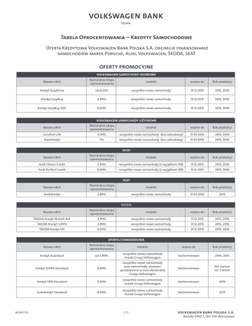 Tabela Oprocentowania – Kredyty Samochodowe Oferta Kredytowa Volkswagen Bank Polska S.A. obejmuje finansowanie samochodów marek Porsche, Audi, Volkswagen, ŠKODA, SEAT Oferty promocyjne Volkswagen SAMOCHODY osobowe Nazwa ofert Nominalna stopa oprocentowania modele ważne do Rok produkcji Kredyt EasyDrive od 0,35% wszystkie nowe samochody 31.12.2015 2015, 2016 Kredyt EasyBuy 4,99% wszystkie nowe samochody 31.12.2015 2015, 2016 Kredyt EasyBuy 50% 0,00% wszystkie nowe samochody 31.12.2015 2015, 2016 Nazwa ofert Nominalna stopa oprocentowania modele ważne do Rok produkcji CarePort Life 4,44% wszystkie nowe samochody (bez zabudowy) 31.01.2016 2015, 2016 AutoKredyt 5% wszystkie nowe samochody (bez zabudowy) 31.01.2016 2015, 2016 Volkswagen SAMOCHODY użytkowe AUDI Nazwa ofert Nominalna stopa oprocentowania modele ważne do Rok produkcji Audi Classic Credit 2,99% wszystkie nowe samochody (z wyjątkiem R8) 31.12.2015 2015, 2016 Audi Perfect Credit 0,99% wszystkie nowe samochody (z wyjątkiem R8) 31.12.2015 2015, 2016 Nazwa ofert Nominalna stopa oprocentowania modele ważne do Rok produkcji AutoKredyt 5,89% wszystkie nowe samochody 31.01.2016 2015 Nazwa ofert Nominalna stopa oprocentowania modele ważne do Rok produkcji ŠKODA Kredyt Niskich Rat 3,99% wszystkie nowe samochody 31.12.2015 2015, 2016 ŠKODA Kredyt 3,99% 3,99% wszystkie nowe samochody 31.12.2015 2015, 2016 ŠKODA Kredyt 0% 0,00% wszystkie nowe samochody 31.12.2015 2015, 2016 Nazwa ofert Nominalna stopa oprocentowania modele ważne do Rok produkcji Kredyt AutoStart od 3,99% wszystkie nowe samochody marek Grupy Volkswagen bezterminowo 2014, 2015 Kredyt 9,99% Standard 9,99% wszystkie nowe samochody oraz samochody używane sprzedawane w sieci dealerskiej Grupy Volkswagen bezterminowo Nie starsze niż 7-letnie Kredyt 50% Standard 9,99% wszystkie nowe samochody marek Grupy Volkswagen bezterminowo 2015 AutoKredyt Standard 8,99% wszystkie nowe samochody marek Grupy Volkswagen bezterminowo 2015 SEAT ŠKODA Oferta standardowa 40 04 11 15 1/2 VOLKSWAGEN BANK POLSKA S.A. Rondo ONZ 1, 00-124 Warszawa SAMOCHODY UŻYWANE Nazwa ofert Kredyt AutoStart 40 04 11 15 Nominalna stopa oprocentowania od 3,99% modele wszystkie samochody używane 2/2 ważne do Rok produkcji 31.12.2015 2008 - 2015. Samochody używane. Wiek samochodu wraz z okresem finansowania nie mogą przekroczyć 12 lat. VOLKSWAGEN BANK POLSKA S.A. Rondo ONZ 1, 00-124 Warszawa
