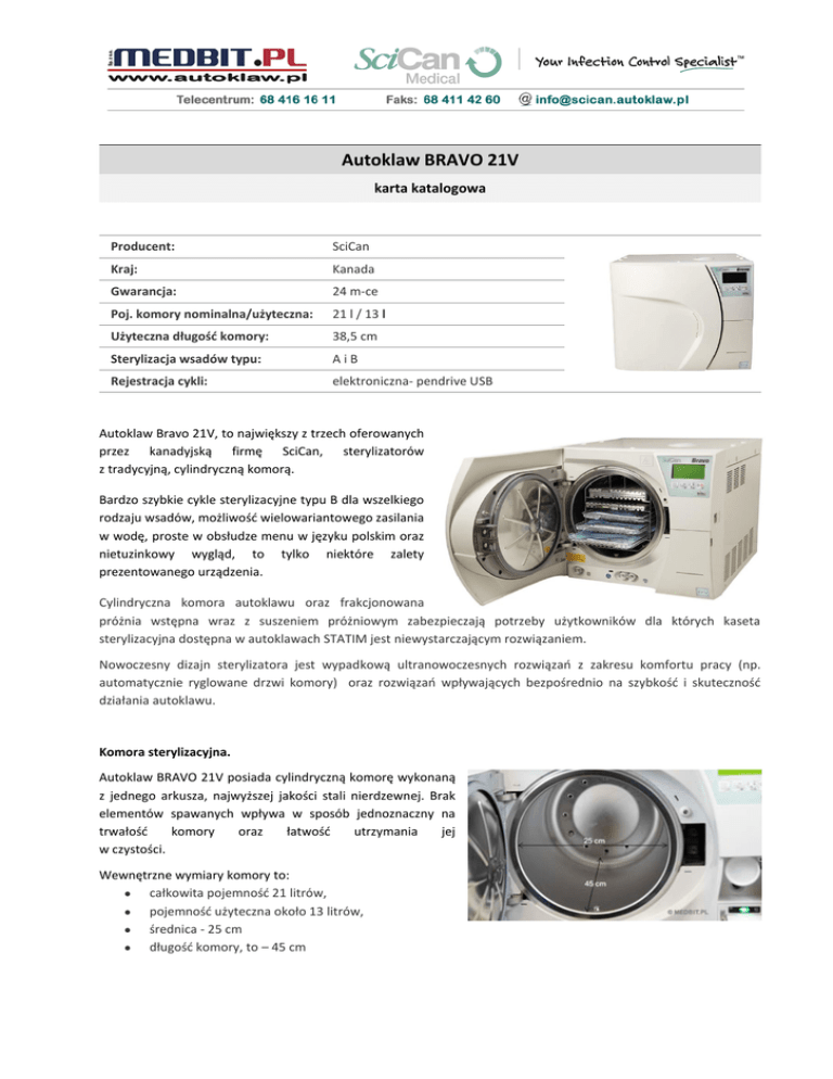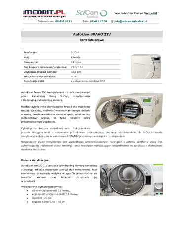 Autoklaw BRAVO 21V karta katalogowa Producent: SciCan Kraj: Kanada Gwarancja: 24 m-ce Poj. komory nominalna/użyteczna: 21 l / 13 l Użyteczna długość komory: 38,5 cm Sterylizacja wsadów typu: AiB Rejestracja cykli: elektroniczna- pendrive USB Autoklaw Bravo 21V, to największy z trzech oferowanych przez kanadyjską firmę SciCan, sterylizatorów z tradycyjną, cylindryczną komorą. Bardzo szybkie cykle sterylizacyjne typu B dla wszelkiego rodzaju wsadów, możliwość wielowariantowego zasilania w wodę, proste w obsłudze menu w języku polskim oraz nietuzinkowy wygląd, to tylko niektóre zalety prezentowanego urządzenia. Cylindryczna komora autoklawu oraz frakcjonowana próżnia wstępna wraz z suszeniem próżniowym zabezpieczają potrzeby użytkowników dla których kaseta sterylizacyjna dostępna w autoklawach STATIM jest niewystarczającym rozwiązaniem. Nowoczesny dizajn sterylizatora jest wypadkową ultranowoczesnych rozwiązań z zakresu komfortu pracy (np. automatycznie ryglowane drzwi komory) oraz rozwiązań wpływających bezpośrednio na szybkość i skuteczność działania autoklawu. Komora sterylizacyjna. Autoklaw BRAVO 21V posiada cylindryczną komorę wykonaną z jednego arkusza, najwyższej jakości stali nierdzewnej. Brak elementów spawanych wpływa w sposób jednoznaczny na trwałość komory oraz łatwość utrzymania jej w czystości. Wewnętrzne wymiary komory to: całkowita pojemność 21 litrów, pojemność użyteczna około 13 litrów, średnica - 25 cm długość komory, to – 45 cm Pojemność użyteczna komory, to około 13 litrów. Skąd bierze się pojemność użyteczna. Przestrzeń użyteczna w komorze jest ograniczona stelażem i tackami, czyli mamy do czynienia z prostopadłościanem wpisanym w cylinder. Para wodna wytwarzana jest w generatorze znajdującym się poza komorą autoklawu. Dzięki temu czas potrzebny do uruchomienia procesu sterylizacji znacznie się skraca oraz poprawiają się warunki samego procesu. W komorze znajduje się stelaż na standardowe tacki druciane. Stelaż można swobodnie obracać lub bezproblemowo usunąć z komory, tak aby najlepiej dostosować autoklaw do aktualnych potrzeb załadunku. Możliwa jest również sterylizacja narzędzi w kontenerach i kasetach. W wyposażeniu standardowym znajdują się trzy tace o wymiarach 18x38 cm. Jest, to ilość wystarczająca do standardowej sterylizacji. Stelaż może pomieścić pięć tacek lub trzy kasety. Drzwi komory otwierane i zamykane są automatycznie. Jest, to bardzo komfortowe rozwiązanie, bezpośrednio wpływające na jakość codziennej obsługi autoklawu. Panel sterowania. Autoklaw BRAVO 21V wyposażony jest w duży, graficzny wyświetlacz LCD prezentujący w języku polskim aktualny status urządzenia jak również umożliwiający jego banalnie prostą obsługę. Użytkownik ma do dyspozycji cztery, wielofunkcyjne przyciski za pomocą, których może w łatwy sposób wybierać i uruchamiać procesy sterylizacyjne jak również zmieniać ustawienia autoklawu. Programy sterylizacyjne. Cechą charakterystyczną autoklawów oferowanych przez firmę SciCan jest idea szybkiej i bezpiecznej sterylizacji wszelkiego typu narzędzi medycznych. Autoklaw BRAVO 21V umożliwia przeprowadzenie skutecznej sterylizacji opakowanych wsadów typu A już w 38 min wraz z niezwykle skutecznym suszeniem próżniowym. Dodatkowo program szybki umożliwia sterylizację wsadów nieopakowanych w niespełna 14 minut łącznie z suszeniem. Możliwa jest skuteczne i bezpieczna sterylizacja wszelkich narządzi medycznych poczynając od okulistyki, stomatologii, ginekologii i chirurgii oraz materiałów z gumy i tworzyw sztucznych. Orientacyjne czasy sterylizacji w autoklawie BRAVO 21V 134C opakowane 134C nie opakowane 121C opakowane 121C nieopakowane Cykl szybki 43 min 36 min 58 min 51 min 14 min Archiwizacja. Autoklaw BRAVO 21V jest wyposażony we wbudowany system elektronicznej rejestracji cykli sterylizacyjnych. Jeden z najbardziej przyjaznych użytkownikowi systemów. Cykle zapisywane są na podłączonej do autoklawu pamięci pendrive z interfejsem USB. Aby zarchiwizować zapisane cykle wystarczy podłączyć pamięć do komputera i skopiować na jego dysk wszystkie wpisy za pomocą dostarczonej do autoklawu prostej aplikacji Data Flash pracującej w każdym systemie Windows. Rejestry są archiwizowane w katalogach, które usystematyzowane są według lat oraz miesięcy. Każdy rejestr można bardzo łatwo wydrukować na podłączonej do komputera drukarce lub zwyczajnie przejrzeć w oknie aplikacji. Zasilanie w wodę. Autoklaw BRAVO 21V pracuje w systemie jednokrotnego obiegu wody. Oznacza, to że do każdego cyklu sterylizacyjnego używana jest świeża woda destylowana. Urządzenie posiada wbudowany zbiornik na wodę destylowaną oraz wbudowany zbiornik na skropliny. Dzięki temu autoklaw ma dużą autonomię pracy. Może zostać umieszczony niemal w dowolnym miejscu gabinetu lub kliniki. Autoklaw opcjonalnie posiada możliwość pobierania wody z sieci wodociągowej poprzez demineralizator oraz spust skroplin do kanalizacji. Podsumowanie. Autoklaw BRAVO 21V jest kolejnym, szybkim i bezpiecznym dla narzędzi autoklawem oferowanym przez kanadyjską firmę Sci Can. Tradycyjna, cylindryczna komora z mobilnym stelażem daje duże możliwości jej aranżacji przez co autoklaw staje się jeszcze bardziej uniwersalny. Szybkie cykle sterylizacyjne, łatwość obsługi oraz autonomia pracy pozwalają wykorzystać ten autoklaw do sterylizacji wszelkich typów narzędzi w każdej praktyce lekarskiej oraz klinice. Bravo 21V stanowi znakomite uzupełnienie autoklawów kasetowych STAIM, a w połączeniu z ultranowoczesnym STATIMem 7000 i myjnią termodezynfektorem Hydrim C61wd G4 jest nie do pokonania w zakresie bezpiecznej i szybkiej dezynfekcji i sterylizacji parowej narzędzi medycznych wszelkich rodzajów. Zalety: Krótkie czasy sterylizacji. Frakcjonowany system próżni wstępnej. Innowa