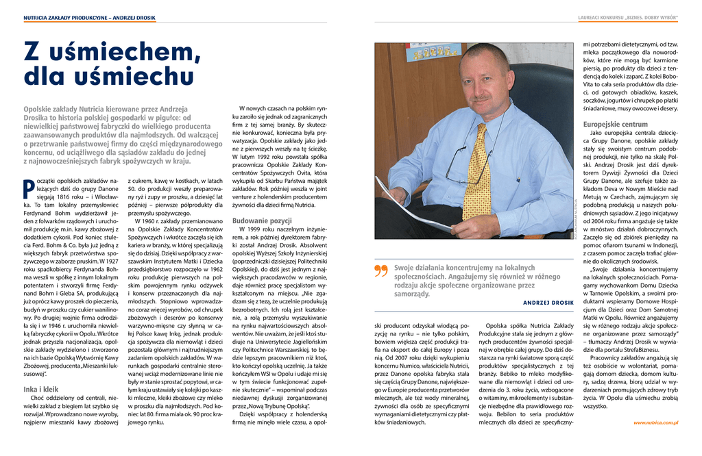 Laureaci konkursu „Biznes. Dobry wybór” Nutricia zakłady produkcyjne – Andrzej Drosik Z uśmiechem, dla uśmiechu P oczątki opolskich zakładów należących dziś do grupy Danone sięgają 1816 roku – i Włocławka. To tam lokalny przemysłowiec Ferdynand Bohm wydzierżawił jeden z folwarków rządowych i uruchomił produkcję m.in. kawy zbożowej z dodatkiem cykorii. Pod koniec stulecia Ferd. Bohm & Co. była już jedną z większych fabryk przetwórstwa spożywczego w zaborze pruskim. W 1927 roku spadkobiercy Ferdynanda Bohma weszli w spółkę z innym lokalnym potentatem i stworzyli firmę Ferdynand Bohm i Gleba SA, produkującą już oprócz kawy proszek do pieczenia, budyń w proszku czy cukier wanilinowy. Po drugiej wojnie firma odrodziła się i w 1946 r. uruchomiła niewielką fabryczkę cykorii w Opolu. Wkrótce jednak przyszła nacjonalizacja, opolskie zakłady wydzielono i stworzono na ich bazie Opolską Wytwórnię Kawy Zbożowej, producenta „Mieszanki luksusowej”. Inka i kleik Choć oddzielony od centrali, niewielki zakład z biegiem lat szybko się rozwijał. Wprowadzano nowe wyroby, najpierw mieszanki kawy zbożowej z cukrem, kawę w kostkach, w latach 50. do produkcji weszły preparowany ryż i zupy w proszku, a dziesięć lat później – pierwsze półprodukty dla przemysłu spożywczego. W 1960 r. zakłady przemianowano na Opolskie Zakłady Koncentratów Spożywczych i wkrótce zaczęła się ich kariera w branży, w której specjalizują się do dzisiaj. Dzięki współpracy z warszawskim Instytutem Matki i Dziecka przedsiębiorstwo rozpoczęło w 1962 roku produkcję pierwszych na polskim powojennym rynku odżywek i konserw przeznaczonych dla najmłodszych. Stopniowo wprowadzano coraz więcej wyrobów, od chrupek zbożowych i deserów po konserwy warzywno-mięsne czy słynną w całej Polsce kawę Inkę, jednak produkcja spożywcza dla niemowląt i dzieci pozostała głównym i najtrudniejszym zadaniem opolskich zakładów. W warunkach gospodarki centralnie sterowanej wciąż modernizowane linie nie były w stanie sprostać popytowi, w całym kraju ustawiały się kolejki po kaszki mleczne, kleiki zbożowe czy mleko w proszku dla najmłodszych. Pod koniec lat 80. firma miała ok. 90 proc krajowego rynku. W nowych czasach na polskim rynku zaroiło się jednak od zagranicznych firm z tej samej branży. By skutecznie konkurować, konieczna była prywatyzacja. Opolskie zakłady jako jedne z pierwszych weszły na tę ścieżkę. W lutym 1992 roku powstała spółka pracownicza Opolskie Zakłady Koncentratów Spożywczych Ovita, która wykupiła od Skarbu Państwa majątek zakładów. Rok później weszła w joint venture z holenderskim producentem żywności dla dzieci firmą Nutricia. Europejskie centrum FOT.archiwum nutricia Opolskie zakłady Nutricia kierowane przez Andrzeja Drosika to historia polskiej gospodarki w pigułce: od niewielkiej państwowej fabryczki do wielkiego producenta zaawansowanych produktów dla najmłodszych. Od walczącej o przetrwanie państwowej firmy do części międzynarodowego koncernu, od uciążliwego dla sąsiadów zakładu do jednej z najnowocześniejszych fabryk spożywczych w kraju. mi potrzebami dietetycznymi, od tzw. mleka początkowego dla noworodków, które nie mogą być karmione piersią, po produkty dla dzieci z tendencją do kolek i zaparć. Z kolei BoboVita to cała seria produktów dla dzieci, od gotowych obiadków, kaszek, soczków, jogurtów i chrupek po płatki śniadaniowe, musy owocowe i desery. Budowanie pozycji W 1999 roku naczelnym inżynierem, a rok później dyrektorem fabryki został Andrzej Drosik. Absolwent opolskiej Wyższej Szkoły Inżynierskiej (poprzedniczki dzisiejszej Politechniki Opolskiej), do dziś jest jednym z największych pracodawców w regionie, daje również pracę specjalistom wykształconym na miejscu. „Nie zgadzam się z tezą, że uczelnie produkują bezrobotnych. Ich rolą jest kształcenie, a rolą przemysłu wyszukiwanie na rynku najwartościowszych absolwentów. Nie uważam, że jeśli ktoś studiuje na Uniwersytecie Jagiellońskim czy Politechnice Warszawskiej, to będzie lepszym pracownikiem niż ktoś, kto kończył opolską uczelnię. Ja także kończyłem WSI w Opolu i udaje mi się w tym świecie funkcjonować zupełnie skutecznie” – wspominał podczas niedawnej dyskusji zorganizowanej przez „Nową Trybunę Opolską”. Dzięki współpracy z holenderską firmą nie minęło wiele czasu, a opol- Swoje działania koncentrujemy na lokalnych społecznościach. Angażujemy się również w różnego rodzaju akcje społeczne organizowane przez samorządy. Andrzej Drosik ski producent odzyskał wiodącą pozycję na rynku – nie tylko polskim, bowiem większa część produkcji trafia na eksport do całej Europy i poza nią. Od 2007 roku dzięki wykupieniu koncernu Numico, właściciela Nutricii, przez Danone opolska fabryka stała się częścią Grupy Danone, największego w Europie producenta przetworów mlecznych, ale też wody mineralnej, żywności dla osób ze specyficznymi wymaganiami dietetycznymi czy płatków śniadaniowych. Opolska spółka Nutricia Zakłady Produkcyjne stała się jednym z głównych producentów żywności specjalnej w obrębie całej grupy. Do dziś dostarcza na rynki światowe sporą część produktów specjalistycznych z tej branży. Bebiko to mleko modyfikowane dla niemowląt i dzieci od urodzenia do 3. roku życia, wzbogacone o witaminy, mikroelementy i substancje niezbędne dla prawidłowego rozwoju. Bebilon to seria produktów mlecznych dla dzieci ze specyficzny- Jako europejska centrala dziecięca Grupy Danone, opolskie zakłady stały się swoistym centrum podobnej produkcji, nie tylko na skalę Polski. Andrzej Drosik jest dziś dyrektorem Dywizji Żywności dla Dzieci Grupy Danone, ale szefuje także zakładom Deva w Nowym Mieście nad Metują w Czechach, zajmującym się podobną produkcją u naszych południowych sąs