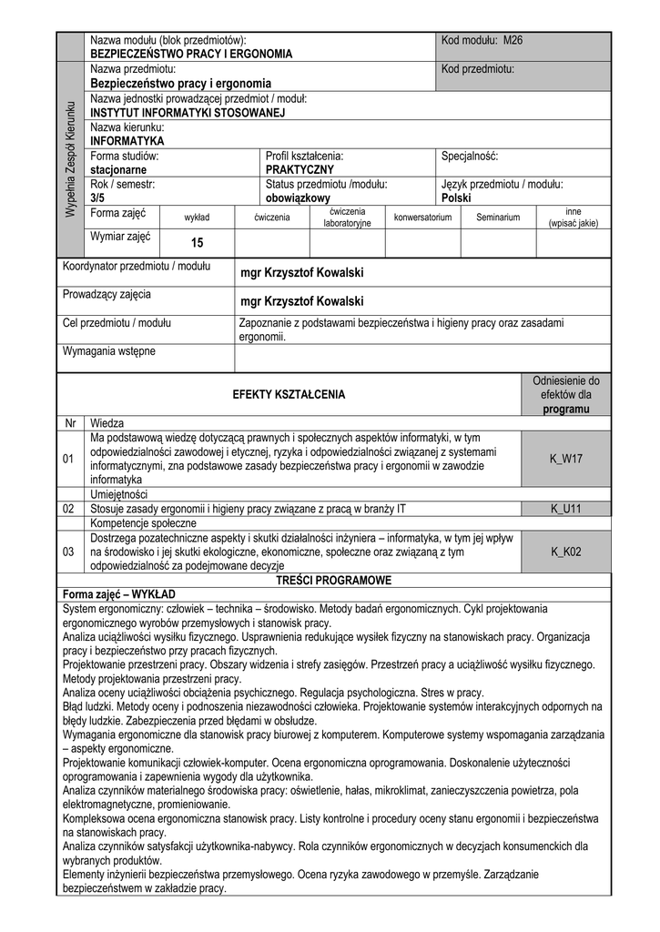 Nazwa modułu (blok przedmiotów): BEZPIECZEŃSTWO PRACY I ERGONOMIA Nazwa przedmiotu: Wypełnia Zespół Kierunku Bezpieczeństwo pracy i ergonomia Kod modułu: M26 Kod przedmiotu: Nazwa jednostki prowadzącej przedmiot / moduł: INSTYTUT INFORMATYKI STOSOWANEJ Nazwa kierunku: INFORMATYKA Forma studiów: Profil kształcenia: Specjalność: stacjonarne PRAKTYCZNY Rok / semestr: Status przedmiotu /modułu: Język przedmiotu / modułu: 3/5 obowiązkowy Polski ćwiczenia inne Forma zajęć wykład ćwiczenia konwersatorium Seminarium laboratoryjne (wpisać jakie) Wymiar zajęć 15 Koordynator przedmiotu / modułu Prowadzący zajęcia Cel przedmiotu / modułu mgr Krzysztof Kowalski mgr Krzysztof Kowalski Zapoznanie z podstawami bezpieczeństwa i higieny pracy oraz zasadami ergonomii. Wymagania wstępne EFEKTY KSZTAŁCENIA Nr Odniesienie do efektów dla programu Wiedza Ma podstawową wiedzę dotyczącą prawnych i społecznych aspektów informatyki, w tym odpowiedzialności zawodowej i etycznej, ryzyka i odpowiedzialności związanej z systemami 01 K_W17 informatycznymi, zna podstawowe zasady bezpieczeństwa pracy i ergonomii w zawodzie informatyka Umiejętności 02 Stosuje zasady ergonomii i higieny pracy związane z pracą w branży IT K_U11 Kompetencje społeczne Dostrzega pozatechniczne aspekty i skutki działalności inżyniera – informatyka, w tym jej wpływ 03 na środowisko i jej skutki ekologiczne, ekonomiczne, społeczne oraz związaną z tym K_K02 odpowiedzialność za podejmowane decyzje TREŚCI PROGRAMOWE Forma zajęć – WYKŁAD System ergonomiczny: człowiek – technika – środowisko. Metody badań ergonomicznych. Cykl projektowania ergonomicznego wyrobów przemysłowych i stanowisk pracy. Analiza uciążliwości wysiłku fizycznego. Usprawnienia redukujące wysiłek fizyczny na stanowiskach pracy. Organizacja pracy i bezpieczeństwo przy pracach fizycznych. Projektowanie przestrzeni pracy. Obszary widzenia i strefy zasięgów. Przestrzeń pracy a uciążliwość wysiłku fizycznego. Metody projektowania przestrzeni pracy. Analiza oceny uciążliwości obciążenia psychicznego. Regulacja psychologiczna. Stres w pracy. Błąd ludzki. Metody oceny i podnoszenia niezawodności człowieka. Projektowanie systemów interakcyjnych odpornych na błędy ludzkie. Zabezpieczenia przed błędami w obsłudze. Wymagania ergonomiczne dla stanowisk pracy biurowej z komputerem. Komputerowe systemy wspomagania zarządzania – aspekty ergonomiczne. Projektowanie komunikacji człowiek-komputer. Ocena ergonomiczna oprogramowania. Doskonalenie użyteczności oprogramowania i zapewnienia wygody dla użytkownika. Analiza czynników materialnego środowiska pracy: oświetlenie, hałas, mikroklimat, zanieczyszczenia powietrza, pola elektromagnetyczne, promieniowanie. Kompleksowa ocena ergonomiczna stanowisk pracy. Listy kontrolne i procedury oceny stanu ergonomii i bezpieczeństwa na stanowiskach pracy. Analiza czynników satysfakcji użytkownika-nabywcy. Rola czynników ergonomicznych w decyzjach konsumenckich dla wybranych produktów. Elementy inżynierii bezpieczeństwa przemysłowego. Ocena ryzyka zawodowego w przemyśle. Zarządzanie bezpieczeństwem w zakładzie pracy. Obowiązki pracodawcy w zakresie zapewnienia bezpiecznych warunków pracy. Wykład z prezentacją multimedialną. Metody kształcenia Dyskusja Nr efektu kształcenia z sylabusa 01, 02, 03 Metody weryfikacji efektów kształcenia Praca pisemna-referat Forma i warunki zaliczenia Literatura podstawowa Kolokwium zaliczające Lewandowski J. Ergonomia, Wyd. Markus Łódź 1996. Kamieńska-Żyła M. Ergonomia stanowiska komputerowego. Wyd. AGH Kraków, 1996. Olszewski J. Podstawy ergonomii i fizjologii pracy. AE Poznań, 1993. Literatura uzupełniająca NAKŁAD PRACY STUDENTA: Udział w wykładach Samodzielne studiowanie tematyki wykładów Udział w ćwiczeniach audytoryjnych i laboratoryjnych* Samodzielne przygotowywanie się do ćwiczeń* Przygotowanie projektu / eseju / itp. * Przygotowanie się do egzaminu / zaliczenia Udział w konsultacjach Inne ŁĄCZNY nakład pracy studenta w godz. Liczba punktów ECTS za przedmiot Obciążenie studenta związane z zajęciami praktycznymi* Obciążenie studenta na zajęciach wymagających bezpośredniego udziału nauczycieli akademickich Liczba godzin 15 5 5 25 1 ECTS 0 15 0,6 ECTS