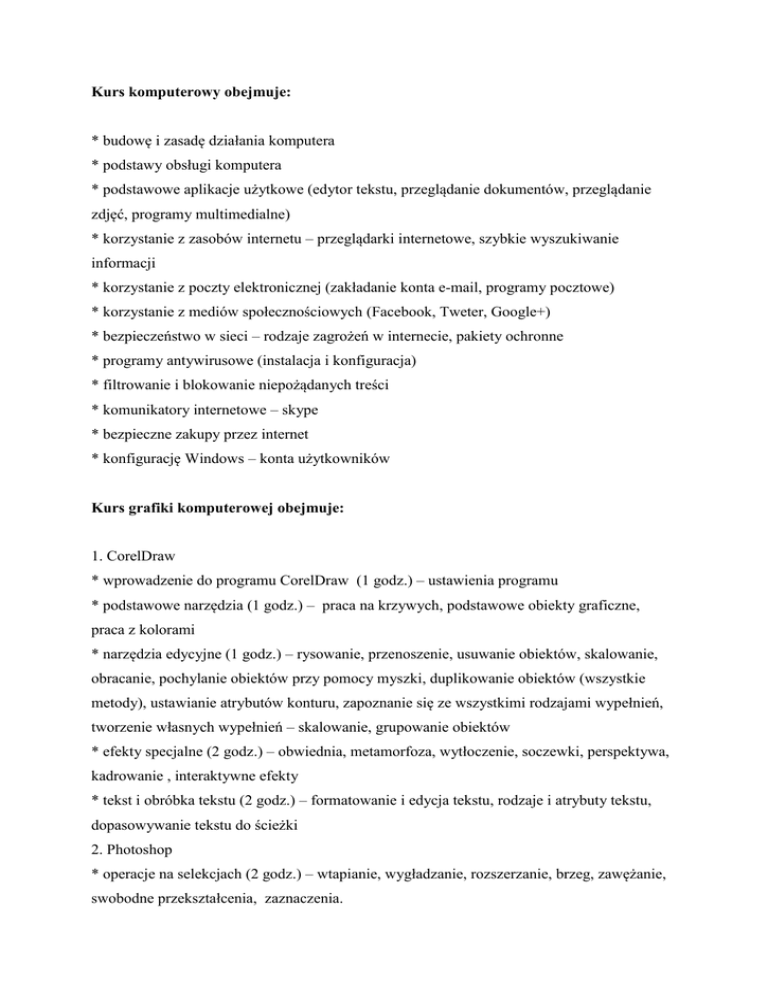 Kurs komputerowy obejmuje: * budowę i zasadę działania