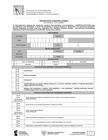 ul. Harcerska 18, 63-000 Środa Wlkp. tel./fax (61) 28 64 964, (61) 28 64 965 [email protected], www.euronauka.eu Oświadczenie uczestnika projektu „Nowe kwalifikacje - nowe perspektywy.” Ja, niżej podpisany(-a), deklaruję chęć uczestnictwa w projekcie „Nowe kwalifikacje - nowe perspektywy.”, nr RPWP.08.03.02-30-0138/16, który jest realizowany, przez Beneficjenta, w ramach Osi Priorytetowej 8: Edukacja Działania 8.3. Wzmocnienie oraz dostosowanie kształcenia i szkolenia zawodowego do potrzeb rynku pracy Poddziałania 8.3.2. Kształcenie zawodowe dorosłych – tryb konkursowy Wielkopolskiego Regionalnego Programu Operacyjnego na lata 2014-2020, zwanego dalej „projektem”. DANE OSOBOWE Imię (imiona) Nazwisko PESEL Telefon kontaktowy e-mail @ MIEJSCE ZAMIESZKANIA1 Ulica Nr domu Nr lokalu Miejscowość Kod pocztowy - Poczta WYKSZTAŁCENIE niższe niż podstawowe podstawowe zawodowe średnie gimnazjalne AKTUALNY STATUS ZAWODOWY / DODATKOWE INFORMACJE tak nie tak nie tak nie tak nie tak nie bezrobotny(-a)2 bierny(-a) zawodowo3 pracujący(-a)4 Uczestniczyłem(-am) we wsparciu lifelong learning (LLL), tj. kursach, szkoleniach, studiach, w Programie Operacyjnym Kapitał Ludzki 2007-2013 (PO KL)5. Deklaruję chęć uczestnictwa w projekcie „Nowe kwalifikacje - nowe perspektywy” i potrzebę podniesienia własnych kwalifikacji poprzez udział w kursach zawodowych. AKTUALNY STATUS SPOŁECZNY I EKONOMICZNY UCZESTNIKA tak nie odmawiam podania informacji tak nie Osoba należąca do mniejszości narodowej lub etnicznej, migrant, osoba obcego pochodzenia. /DANE WRAŻLIWE/ Osoba bezdomna lub dotknięta wykluczeniem z dostępu do mieszkań. tak nie odmawiam podania informacji tak nie tak nie tak Osoba z niepełnosprawnościami6. /DANE WRAŻLIWE/ Osoba przebywająca w gospodarstwie domowym bez osób pracujących. w tym: w gospodarstwie domowym z dziećmi pozostającymi na utrzymaniu Osoba żyjąca w gospodarstwie składającym się z jednej osoby dorosłej i dzieci pozostających na utrzymaniu. ul. Harcerska 18, 63-000 Środa Wlkp. tel./fax (61) 28 64 964, (61) 28 64 965 [email protected], www.euronauka.eu nie tak nie odmawiam podania informacji Osoba w innej niekorzystnej sytuacji społecznej (innej niż wymienione powyżej)7. /DANE WRAŻLIWE/ OŚWIADCZENIA DOTYCZĄCE PRZETWARZANIA DANYCH OSOBOWYCH tak nie W związku z przystąpieniem do projektu pn. „Nowe kwalifikacje - nowe perspektywy.”, oświadczam, że przyjmuję do wiadomości, iż: 1. Administratorem moich danych osobowych jest w odniesieniu do zbioru Wnioskodawcy WRPO 2007-2013 i 2014-2020 – Marszałek Województwa Wielkopolskiego mający siedzibę przy al. Niepodległości 34, 61-714 Poznań. Natomiast w odniesieniu do zbioru Centralny system teleinformatyczny wspierający realizację programów operacyjnych - Minister Rozwoju, mający siedzibę przy Placu Trzech Krzyży 3/5, 00-507 Warszawa. 2. Podstawę prawną przetwarzania moich danych osobowych stanowi art. 23 ust. 1 pkt 2 lub art. 27 ust. 2 pkt 2 ustawy z dnia 29 sierpnia 1997 r. o ochronie danych osobowych (Dz. U. z 2015 r. poz. 2135 z późn. zm.) – dane osobowe są niezbędne dla realizacji Wielkopolskiego Regionalnego Programu Operacyjnego na lata 2014-2020 na podstawie: 1) w odniesieniu do zbioru Wnioskodawcy WRPO 2007-2013 i 2014-2020: a) rozporządzenia 1303/2013; b) rozporządzenia 1304/2013; c) ustawy wdrożeniowej. 2) w odniesieniu do zbioru Centralny system teleinformatyczny wspierający realizację programów operacyjnych: a) rozporządzenia 1303/2013; b) rozporządzenia 1304/2013; c) ustawy wdrożeniowej; d) rozporządzenia wykonawczego Komisji (UE) nr 1011/2014 z dnia 22 września 2014 r. ustanawiającego szczegółowe przepisy wykonawcze do rozporządzenia Parlamentu Europejskiego i Rady (UE) nr 1303/2013 w odniesieniu do wzorów służących do przekazywania Komisji określonych informacji oraz szczegółowe przepisy dotyczące wymiany informacji między Beneficjentami a instytucjami zarządzającymi, certyfikującymi, audytowymi i pośredniczącymi (Dz. Urz. UE L 286 z 30.09.2014, str.1). 3. Moje dane osobowe będą przetwarzane wyłącznie w celu realizacji Projektu RPWP.08.03.02-30-0138/16, w szczególności potwierdzenia kwalifikowalności wydatków, udzielenia wsparcia, monitoringu, ewaluacji, kontroli, audytu i sprawozdawczości oraz działań informacyjno-promocyjnych w ramach Wielkopolskiego Regionalnego Programu Operacyjnego na lata 2014-2020 (WRPO 2014+). 4. Moje dane osobowe zostały powierzone do przetwarzania Instytucji Zarządzającej – Zarządowi Województwa Wielkopolskiego, al. Niepodległości 34, Beneficjentowi realizującemu Projekt - Andrzejowi Czubajowi, prowadzącemu działalność gospodarczą pod nazwą Euronauka Andrzej Czubaj, ul. Harcerska 18, 63-000 Środa Wielkopolska oraz podmiotom, które na zlecenie Beneficjenta uczestniczą w realizacji Projektu - ………………… (nazwa i adres ww. podmiotów). Moje dane osobowe mogą zostać przekazane podmiotom realizującym badania ewaluacyjne na zlecenie Instytucji Zarządzającej lub Beneficjenta. Moje dane osobowe mogą zostać również powierzone specjalistycznym firmom, realizującym na zlecenie Instytucji Zarządzającej oraz Beneficjenta kontrole i audyt w ramach WRPO 2014+. 5. Oświadczam, iż podane przeze mnie dane osobowe są prawdziwe i aktualne. 6. Podanie danych jest dobrowolne, aczkolwiek odmowa ich podania jest równoznaczna z brakiem możliwości udzielenia wsparcia w ramach Projektu. 7. W terminie 4 tygodni po zakończeniu udziału w Projekcie przekażę Beneficjentowi dane dotyczące mojego statusu na rynku pracy oraz informacje na temat udziału w kształceniu lub szkoleniu oraz uzyskania kwalifikacji lub nabycia kompetencji. 8. W ciągu trzech miesięcy po zakończeniu udziału w Projekcie udostępnię dane dotyczące mojego statusu na rynku pracy. 9. Mam prawo dostępu do treści swoich danych i ich poprawiania. INNE OŚWIADCZENIA tak nie tak ni