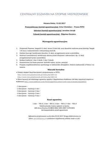 CENTRALNY EGZAMIN NA STOPNIE MISTRZOWSKIE Mszana Dolna, 12.02.2017 Przewodniczący komisji egzaminacyjnej: Artur Chmielarz – Prezes PZTO Sekretarz komisji egzaminacyjnej: Jarosław Jarząb Członek komisji egzaminacyjnej: Zbigniew Karpierz Wymagania egzaminacyjne: 1. 2. 3. 4. 5. 6. Znajomość Poomse: taeguk 8 (1 dan), koryo (2 dan) itd. oraz dowolnie wybrane przez komisję Taeguk 1-8 wraz z nazewnictwem i interpretacją technik. Hanbon-kyorugi: kombinacje dowolne 12 akcji, przygotowane przez uczestników. Hosinsul (samoobrona): kombinacje obrony przed chwytami i uderzeniami, itp. 12 akcji przygotowanych przez uczestników. Kyokpa (rozbicia) 1 dan 4 deski, 2 dan 5 desek. Nazewnictwo (na bazie poomse: techniki nożne, ręczne, pozycje). Przepisy współzawodnictwa sportowego w taekwondo olimpijskim, historia taekwondo w Polsce i na świecie. Warunki formalne: • Ostatni stopień (kup/dan/poom) zarejestrowany w PZTO; http://www.new.pztaekwondo.pl/index.php?IdM=31 http://www.new.pztaekwondo.pl/index.php?IdM=32 • Okres karencji od ostatniego egzaminu zgodny z Regulaminem Kukkiwon (od daty rejestracji stopnia w Kukkiwon) http://www.kukkiwon.or.kr/front/pageView.action?cmd=/eng/evaluate/regulations - 1 dan/poom – - 2 dan/poom – karencja 1 rok / - 3 dan/poom – karencja 2 lata / - 4 dan/poom – karencja 3 lata / - 5 dan/poom – karencja 4 lata / Koszt egzaminu: 1 dan – 700 zł, 2 dan – 850 zł, 3 dan – 900 zł, 4 dan – 950 zł Należną kwotę można wpłacić na konto: UKS Arcus Krynica 03 8802 0002 2001 0007 3378 0001 lub bezpośrednio przed egzaminem Zgłoszenia przyjmowane są do dnia 05.02.2017 drogą elektroniczną na adres: [email protected] z podaniem wypełnionej ankiety (wzór w zał.) Każdy uczestnik musi posiadać: • Zaświadczenie lekarskie o zdolności do uczestnictwa w egzaminie (wzór w zał.) • Indywidualny sprzęt ochronny do walk taekwondo • Ubezpieczenie NNW • Potwierdzenie wpłaty na konto • strój do taekwondo • odpowiednią liczbę desek • podpisane oświadczenie (wzór w zał.) zdjęcia do certyfikatu zostaną zrobione kandydatom na miejscu Adres: Mszana Dolna ul. Sienkiewicza 1 godz. 12:00-12:45 rejestracja uczestników godz. 13:00 rozpoczęcie egzaminu ZGŁOSZENIE EGZAMIN NA STOPNIE MISTRZOWSKIE W TAEKWONDO OLIMPIJSKIM 1. Imię i Nazwisko .................................................................................................................................... 2. Data i miejsce urodzenia ...................................................................................................................... 3. Adres zamieszkania:……………………………………………………………………………………………………………………. 4. e-mail……………………………………………………….tel...................................................................................... 5. Stopień …………………Nr. certyfikatu………………………Data uzyskania….................................................... 6. Klub……………………………………………………………………………………………………........................................... ...................................................................... / data i podpis/ W zał. kopia dowodu wpłaty. ZAŚWIADCZENIE LEKARSKIE Zaświadczam, że Pan/Pani............................................................................................................ / imię i nazwisko/ nie ma przeciwwskazań do przystąpienia do egzaminu na stopnie mistrzowskie w taekwondo olimpijskim. .............................................. / miejscowość, data/ …………..……………… (imię i nazwisko) ..................................................... /pieczątka i podpis/ …………………, dn. OŚWIADCZENIE Ja niżej podpisana(y), oświadczam, że zapoznałam(em) się i zobowiązuję się̨ do przestrzegania statutu i regulaminów Polskiego Związku Taekwondo Olimpijskiego z siedzibą w Warszawie (dalej jako „PZTO”). Oświadczam, że poddam się̨ odpowiedzialności dyscyplinarnej. Poświadczam zgodność́ podanych we wniosku danych. Wyrażam zgodę̨ na przetwarzanie moich danych osobowych zawartych we wniosku przez Polski Związek Taekwondo Olimpijskiego z siedzibą w Warszawie (zgodnie z Ustawą z dnia 29 sierpnia 1997 roku o ochronie danych osobowych). Przyjmuję do wiadomości, że: - podanie danych jest dobrowolne, bezterminowe i może zostać odwołane w każdym czasie przy zachowaniu formy pisemnej, - administratorem danych osobowych jest PZTO (adres siedziby: ul. Nowowiejska 5/44, 00643 Warszawa), - mam prawo dostępu do treści moich danych, informacji o źródle ich dostarczenia oraz ich poprawiania, modyfikacji, uaktualniania, uzupełnienia, usunięcia i zaprzestania ich przetwarzania; - PZTO gromadzi i przetwarza dane osobowe w celu umożliwienia: - uczestnictwa we współzawodnictwie sportowym w taekwondo olimpijskim w kraju i za granicą, - prowadzenia treningów taekwondo olimpijskiego, - sędziowania na zawodach w taekwondo olimpijskim, - nadawania stopni uczniowskich i mistrzowskich w taekwondo olimpijskim, - uczestniczenia w szkoleniach, zgrupowaniach i innych wydarzeniach organizowanych przez PZTO, - wypełnianiu obowiązków prawnych i administracyjnych związanych z funkcjonowaniem PZTO. Upoważniam PZTO do przekazywania moich danych osobowych do Światowej Federacji Taekwondo (WTF), Europejskiej Unii Taekwondo (ETU) i organizatorów zawodów w taekwondo w celu wyrobienia stopni, certyfikatów, licencji zawodniczych/trenerskich/sędziowskich oraz mojej rejestracji w zawodach/szkoleniach i innych wydarzeniach taekwondo. ……………………. (czytelny podpis składającego oświadczenie)