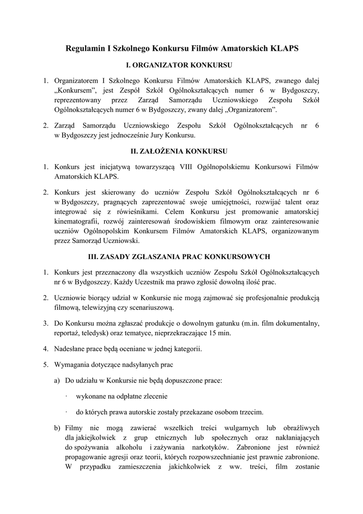 Regulamin I Szkolnego Konkursu Filmów Amatorskich KLAPS I. ORGANIZATOR KONKURSU 1. Organizatorem I Szkolnego Konkursu Filmów Amatorskich KLAPS, zwanego dalej „Konkursem”, jest Zespół Szkół Ogólnokształcących numer 6 w Bydgoszczy, reprezentowany przez Zarząd Samorządu Uczniowskiego Zespołu Szkół Ogólnokształcących numer 6 w Bydgoszczy, zwany dalej „Organizatorem”. 2. Zarząd Samorządu Uczniowskiego Zespołu w Bydgoszczy jest jednocześnie Jury Konkursu. Szkół Ogólnokształcących nr 6 II. ZAŁOŻENIA KONKURSU 1. Konkurs jest inicjatywą towarzyszącą VIII Ogólnopolskiemu Konkursowi Filmów Amatorskich KLAPS. 2. Konkurs jest skierowany do uczniów Zespołu Szkół Ogólnokształcących nr 6 w Bydgoszczy, pragnących zaprezentować swoje umiejętności, rozwijać talent oraz integrować się z rówieśnikami. Celem Konkursu jest promowanie amatorskiej kinematografii, rozwój zainteresowań środowiskiem filmowym oraz zainteresowanie uczniów Ogólnopolskim Konkursem Filmów Amatorskich KLAPS, organizowanym przez Samorząd Uczniowski. III. ZASADY ZGŁASZANIA PRAC KONKURSOWYCH 1. Konkurs jest przeznaczony dla wszystkich uczniów Zespołu Szkół Ogólnokształcących nr 6 w Bydgoszczy. Każdy Uczestnik ma prawo zgłosić dowolną ilość prac. 2. Uczniowie biorący udział w Konkursie nie mogą zajmować się profesjonalnie produkcją filmową, telewizyjną czy scenariuszową. 3. Do Konkursu można zgłaszać produkcje o dowolnym gatunku (m.in. film dokumentalny, reportaż, teledysk) oraz tematyce, nieprzekraczające 15 min. 4. Nadesłane prace będą oceniane w jednej kategorii. 5. Wymagania dotyczące nadsyłanych prac a) Do udziału w Konkursie nie będą dopuszczone prace: · wykonane na odpłatne zlecenie · do których prawa autorskie zostały przekazane osobom trzecim. b) Filmy nie mogą zawierać wszelkich treści wulgarnych lub obraźliwych dla jakiejkolwiek z grup etnicznych lub społecznych oraz nakłaniających do spożywania alkoholu i zażywania narkotyków. Zabronione jest również propagowanie agresji oraz teorii, których rozpowszechnianie jest prawnie zabronione. W przypadku zamieszczenia jakichkolwiek z ww. treści, film zostanie zdyskwalifikowany. 6. Film należy umieścić w Internecie (YouTube lub dysk internetowy) w formacie .mp4, a przy rejestracji podać link do pracy, który będzie aktywny przez cały czas trwania konkursu. W nazwie pliku należy podać tytuł pracy, imię i nazwisko autora. 7. Zgłoszenie (zawierające link do pracy) należy nadesłać na adres [email protected] w nieprzekraczalnym terminie do 15.05.2016 r. 8. W przypadku otrzymania niewystarczającej liczby zgłoszeń Organizator zastrzega możliwość wydłużenia terminu zgłaszania prac. IV. ZASADY UCZESTNICTWA 1. Uczestnik Konkursu zobowiązuje się do bezwarunkowego przestrzegania niniejszego Regulaminu. 2. W przypadku nagrodzenia produkcji, uczestnicy Konkursu wyrażają zgodę na przetwarzanie i prezentację danych osobowych na stronie internetowej: www.klaps.bydgoszcz.eu, zgodnie z Ustawą z dnia 29 sierpnia 1997 r. o ochronie danych osobowych (Dz.U. Nr. 133, poz. 833). 3. Organizator i administrator strony internetowej Konkursu nie biorą odpowiedzialności za wszelkie szkody spowodowane użytkowaniem witryny. 4. Uczestnik Konkursu zobowiązuje się stosować do harmonogramu porządkowoorganizacyjnego. 5. Organizator ma prawo usunąć pracę Uczestnika z Konkursu z powodu nieprzestrzegania zasad regulaminu. 6. Uczestnik automatycznie wyraża zgodę na wykonywanie kopii filmu, emitowanie swojego dzieła podczas pokazów filmowych w trakcie trwania Konkursu (a także oraz po jego zakończeniu) według uznania Organizatora. 7. Uczestnik wyraża zgodę na wykorzystanie zdjęć i fragmentów filmów w materiałach reklamowych oraz prezentacjach medialnych (prasa, radio, telewizja, Internet, publiczne pokazy specjalne) promujących Konkurs, filmy konkursowe i twórców biorących udział w Konkursie. 8. Obecność Uczestnika na Gali Finałowej VIII Ogólnopolskiego Konkursu Filmów Amatorskich KLAPS jest obowiązkowa. V. OCENA PRAC KONKURSOWYCH 1. Szczegółowe kryteria oceny: a. Podstawowym kryterium oceny będzie pomysłowość, kreatywność, estetyka wykonania oraz jakość nadesłanych prac. b. Komisja Kwalifikacyjna oceniać będzie zgodność prac z regulaminem, każdy projekt będzie rozpatrywany indywidualnie. c. Komisja Kwalifikacyjna porównywać będzie również jakość i oryginalność każdego nadesłanego filmu. 3. Zgłoszone prace oceni Jury Konkursu. 4. Decyzje Jury są ostateczne i niepodważalne i podejmowane większością głosów. 5. Zwycięzca Konkursu zostanie ogłoszony podczas Gali Finałowej VIII Ogólnopolskiego Konkursu Filmów Amatorskich KLAPS. VI. NAGRODY 1. Zwycięzca otrzyma nagrodę rzeczową. 2. Najlepsza praca konkursowa zostanie wyświetlona podczas Gali Finałowej VIII Ogólnopolskiego Konkursu Filmów Amatorskich KLAPS w Miejskim Centrum Kultury w Bydgoszczy. VII. KONTAKT Z ORGANIZATOREM 1. Wszystkie zapytania można kierować na adres: [email protected] 2. Sprawami związanymi z przygotowaniem i przebiegiem Konkursu zajmują się: a) Agnieszka Grochocka – Opiekun Samorządu Uczniowskiego Zespołu Szkół Ogólnokształcących nr 6 w Bydgoszczy nr tel. 607 377 681 b) Krzysztof Hyżyk – Opiekun Samorządu Uczniowskiego Zespołu Szkół Ogólnokształcących nr 6 w Bydgoszczy nr tel. 880 576 282 c) Błażej Karczmarczyk – Przewodniczący Samorządu Uczniowskiego Zespołu Szkół Ogólnokształcących nr 6 w Bydgoszczy nr tel. 600 613 399 d) Michał Dondajewski – Przewodniczący Samorządu Uczniowskiego Zespołu Szkół Ogólnokształcących nr 6 w Bydgoszczy ds. Gimnazjum e) Alicja Partyka - Zastępca Przewodniczącego Samorządu Uczniowskiego Zespołu Szkół Ogólnokształcących nr 6 w Bydgoszczy 3. Osoby te posiadają decydujący głos w kwestiach spornych, nieobjętych Regulaminem lub wymagających dodatkowych 