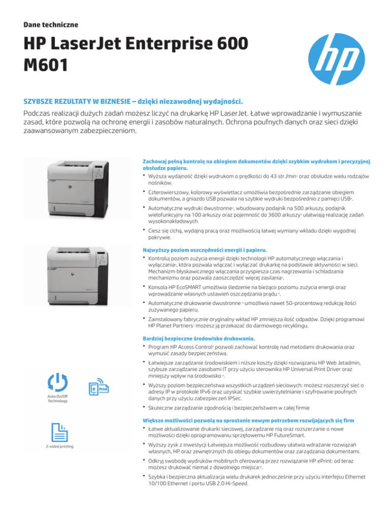 Dane techniczne HP LaserJet Enterprise 600 M601 SZYBSZE REZULTATY W BIZNESIE – dzięki niezawodnej wydajności. Podczas realizacji dużych zadań możesz liczyć na drukarkę HP LaserJet. Łatwe wprowadzanie i wymuszanie zasad, które pozwolą na ochronę energii i zasobów naturalnych. Ochrona poufnych danych oraz sieci dzięki zaawansowanym zabezpieczeniom. Zachowaj pełną kontrolę na obiegiem dokumentów dzięki szybkim wydrukom i precyzyjnej obsłudze papieru. ● Wyższa wydajność dzięki wydrukom o prędkości do 43 str./min1 oraz obsłudze wielu rodzajów nośników. ● Czterowierszowy, kolorowy wyświetlacz umożliwia bezpośrednie zarządzanie obiegiem dokumentów, a gniazdo USB pozwala na szybkie wydruki bezpośrednio z pamięci USB4. ● Automatyczne wydruki dwustronne2, wbudowany podajnik na 500 arkuszy, podajnik wielofunkcyjny na 100 arkuszy oraz pojemność do 3600 arkuszy3 ułatwiają realizację zadań wysokonakładowych. ● Ciesz się cichą, wydajną pracą oraz możliwością łatwej wymiany wkładu dzięki wygodnej pokrywie. Najwyższy poziom oszczędności energii i papieru. ● Kontroluj poziom zużycia energii dzięki technologii HP automatycznego włączania i wyłączania4, która pozwala włączać i wyłączać drukarkę na podstawie aktywności w sieci. Mechanizm błyskawicznego włączania przyspiesza czas nagrzewania i schładzania mechanizmu oraz pozwala zaoszczędzić więcej zasilania5. ● Konsola HP EcoSMART umożliwia śledzenie na bieżąco poziomu zużycia energii oraz wprowadzanie własnych ustawień oszczędzania prądu 6. ● Automatyczne drukowanie dwustronne 2 umożliwia nawet 50-procentową redukcję ilości zużywanego papieru. ● Zainstalowany fabrycznie oryginalny wkład HP zmniejsza ilość odpadów. Dzięki programowi HP Planet Partners7 możesz ją przekazać do darmowego recyklingu. Bardziej bezpieczne środowisko drukowania. ● Program HP Access Control8 pozwoli zachować kontrolę nad metodami drukowania oraz wymusić zasady bezpieczeństwa. ● Łatwiejsze zarządzanie środowiskiem i niższe koszty dzięki rozwiązaniu HP Web Jetadmin, szybsze zarządzanie zasobami IT przy użyciu sterownika HP Universal Print Driver oraz mniejszy wpływ na środowisko 9. ● Wyższy poziom bezpieczeństwa wszystkich urządzeń sieciowych: możesz rozszerzyć sieć o adresy IP w protokole IPv6 oraz uzyskać szybkie uwierzytelnianie i szyfrowanie poufnych danych przy użyciu zabezpieczeń IPSec. ● Skuteczne zarządzanie zgodnością i bezpieczeństwem w całej firmie Większe możliwości pozwolą na sprostanie nowym potrzebom rozwijających się firm ● Łatwe aktualizowanie drukarki sieciowej, zarządzanie nią oraz rozszerzanie o nowe możliwości dzięki oprogramowaniu sprzętowemu HP FutureSmart. ● Wyższy zysk z inwestycji Łatwiejsza możliwość rozbudowy ułatwia wdrażanie rozwiązań własnych, HP oraz zewnętrznych do obiegu dokumentów oraz zarządzania dokumentami. ● Odkryj swobodę wydruków mobilnych oferowaną przez rozwiązanie HP ePrint: od teraz możesz drukować niemal z dowolnego miejsca10. ● Szybka i bezpieczna aktualizacja wielu drukarek jednocześnie przy użyciu interfejsu Ethernet 10/100 Ethernet i portu USB 2.0 Hi-Speed. Przegląd produktu Na ilustracji przedstawiono model HP LaserJet Enterprise 600 M601dn: 1. Intuicyjny 4-wierszowy kolorowy wyświetlacz 2. Port USB do bezpośredniego drukowania 3. Wbudowany moduł automatycznego druku dwustronnego 4. Wygodny włącznik z przodu 5. Odbiornik na 500 arkuszy 6. Łatwy dostęp do komory na potrzeby instalowania zintegrowanych wkładów laserowych 7. Uniwersalny podajnik nr 1 na 100 arkuszy obsługuje grube i nietypowe nośniki o gramaturze do 200 g/m² 8. Podajnik nr 2 na 500 arkuszy, zwiększa łączną pojemność podajników do 600 arkuszy 9. Wbudowany serwer druku HP Jetdirect 10/100/1000Base-TX Ethernet 10. 512 MB łącznej pamięci oraz procesor 800 MHz umożliwiają szybkie wykonanie złożonych zadań drukowania 11. Port Hi-Speed USB 2.0 Krótka charakterystyka Model HP LaserJet Enterprise 600 M601n HP LaserJet Enterprise 600 M601dn Drukarka HP LaserJet Enterprise 600 M601m Numer produktu CE989A CE990A F3J55A Prędkość drukowania Do 45 str./min (letter) Do 45 str./min (letter) Do 45 str./min (letter) Panel sterowania 4-wierszowy kolorowy wyświetlacz 4-wierszowy kolorowy wyświetlacz 4-wierszowy kolorowy wyświetlacz Podajnik uniwersalny 1 na 100 arkuszy Tak Tak Tak Podajnik 2 na 500 arkuszy Tak Tak Tak Podajnik 3 na 500 arkuszy Opcjonalne Opcjonalne Opcjonalne Odbiornik na 500 arkuszy Tak Tak Tak Automatyczne drukowanie dwustronne Ręczny (z obsługą przez sterownik) Tak Tak Odbiornik na 500 arkuszy z 5 pojemnikami Opcjonalne Opcjonalne Tak Certyfikat Blue Angel UZ 171 Niedostępny Niedostępny Tak Akcesoria, materiały eksploatacyjne i biurowe Materiały eksploatacyjne CE390A HP 90A oryginalny wkład z czarnym tonerem LaserJet 10 000 stron CF065A HP CF065A zestaw konserwacyjny LaserJet 220 V 225 000 stron Akcesoria CF062A Automatyczny moduł druku dwustronnego do drukarek HP LaserJet CE998A Moduł podajnika HP LaserJet 500 ark. CE398A Podajnik na 1500 ark. do drukarek HP LaserJet CE405A Zszywacz/układarka na 500 arkuszy do drukarek HP LaserJet CE399A Podajnik kopert na 75 arkuszy do drukarek HP LaserJet CE997A Zestaw 5 tac odbiorczych na 500 arkuszy do drukarek HP LaserJet CE404A Układarka na 500 arkuszy do drukarek HP LaserJet CB525A Stojak dla drukarek HP LaserJet serii P4010/P4510/600 CB527A Podajnik na 400 ark. nośn. niestand. do drukarek HP LaserJet Q3216A Pojemnik zawierający 1000 zszywek HP CE483A Pamięć HP 512 MB, 144-stykowa x32 DDR2 DIMM Sieci i łączność J8026A Bezprzewodowy serwer druku USB HP Jetdirect 2700w Serwis i pomoc techniczna HZ466E Pomoc techniczna HP przez 3 lata z serwisem w następnym dniu roboczym i zachowaniem wadliwych nośników dla drukarki LaserJet M601 HY583E Pomoc techniczna HP przez 3 lata z serwisem w 