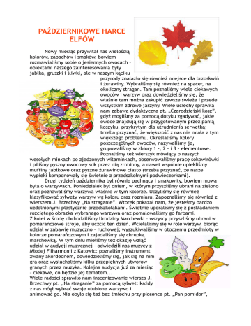 PAŹDZIERNIKOWE HARCE ELFÓW Nowy miesiąc przywitał nas wielością kolorów, zapachów i smaków, bowiem rozmawialiśmy sobie o jesiennych owocach – obiektami naszego zainteresowania były jabłka, gruszki i śliwki, ale w naszym kąciku przyrody znalazło się również miejsce dla brzoskwiń i żurawiny. Wybraliśmy się również na spacer, na okoliczny stragan. Tam poznaliśmy wiele ciekawych owoców i warzyw oraz dowiedzieliśmy się, że właśnie tam można zakupić zawsze świeże i przede wszystkim zdrowe jarzyny. Wiele uciechy sprawiła nam zabawa dydaktyczna pt. „Czarodziejski kosz”, gdyż mogliśmy za pomocą dotyku zgadywać, jakie owoce znajdują się w przygotowanym przez panią koszyku, przykrytym dla utrudnienia serwetką; trzeba przyznać, że większość z nas nie miała z tym większego problemu. Określaliśmy kolory poszczególnych owoców, nazywaliśmy je, grupowaliśmy w zbiory 1 -, 2 - i 3 - elementowe. Poznaliśmy też wierszyk mówiący o naszych wesołych minkach po zjedzonych witaminkach, obserwowaliśmy pracę sokowirówki i piliśmy pyszny owocowy sok przez nią zrobiony, a nawet wspólnie upiekliśmy muffiny jabłkowe oraz pyszne żurawinowe ciasto (trzeba przyznać, że nasze wypieki komponowały się świetnie z przedszkolnymi podwieczorkami). Drugi tydzień października był równie pachnący i smakowity, bowiem mowa była o warzywach. Poniedziałek był dniem, w którym przyszliśmy ubrani na zielono oraz poznawaliśmy warzywa właśnie w tym kolorze. Uczyliśmy się również klasyfikować sylwety warzyw wg koloru oraz rozmiaru. Zapoznaliśmy się również z wierszem J. Brzechwy „Na straganie”. Wtorek pokazał nam, że jesteśmy bardzo uzdolnionymi plastycznie przedszkolakami. Świetnie uporaliśmy się z poskładaniem rozciętego obrazka wybranego warzywa oraz pomalowaliśmy go farbami. Z kolei w środę obchodziliśmy Urodziny Marchewki – wszyscy przyszliśmy ubrani w pomarańczowe stroje, aby uczcić ten dzień. Wcielaliśmy się w role warzyw, biorąc udział w zabawie muzyczno – ruchowej; wyszukiwaliśmy w otoczeniu przedmioty w kolorze pomarańczowym i zajadaliśmy się chrupką marchewką. W tym dniu mieliśmy też okazję wziąć udział w audycji muzycznej – odwiedzili nas muzycy z Młodej Filharmonii z Katowic: poznaliśmy instrument zwany akordeonem, dowiedzieliśmy się, jak się na nim gra oraz wysłuchaliśmy kilku przepięknych utworów granych przez muzyka. Kolejna audycja już za miesiąc – ciekawe, co będzie jej tematem... Wiele radości sprawiło nam inscenizowanie wiersza J. Brzechwy pt. „Na straganie” za pomocą sylwet: każdy z nas mógł wybrać swoje ulubione warzywo i animować go. Nie obyło się też bez śmiechu przy piosence pt. „Pan pomidor”, kiedy to wyczynialiśmy rozmaite hołubce według własnych upodobań:) Kolejny tydzień rozpoczęliśmy poszukiwaniem jesieni w parku i w lesie: chodziliśmy na spacery w te miejsca, starając się zaobserwować jak najwięcej zmian zachodzących w przyrodzie o tej porze roku; zbieraliśmy kasztany, żołędzie oraz liście, z których zrobiliśmy potem piękny i ogromny bukiet; poznaliśmy wiersz A. Chodorowskiej pt. „Jarzębina”, który pięknie ilustrujemy gestem. W tych dniach nasze przedszkole odwiedził niecodzienny gość – pan policjant z Wydziału Ruchu Drogowego: wyjaśnił nam najważniejsze zasady dotyczące bezpieczeństwa dzieci w ruchu drogowym i przedstawił krótki filmik przedstawiający pozytywne zachowania na drodze. Na koniec każde chętne dziecko mogło usiąść w prawdziwym policyjnym radiowozie, choć niektórzy z nas nie chcieli zająć w nim miejsca:) Uwieńczeniem tego spotkania była prezentacja sygnałów dźwiękowych wydawanych przez radiowóz:) Później – wspólnie z grupą Skrzaty - świętowaliśmy Dzień Pieczonego Ziemniaka: najpierw wysłuchaliśmy krótkiej historyjki o jego pochodzeniu, a później wzięliśmy udział w różnych wesołych zabawach (szukanie ziemniaków ukrytych w sali, rzucanie nimi do celu, podawanie ich z rąk do rąk w kole, odbijanie ziemniaczanych stempli w farbie). Wspólnie przygotowywaliśmy ziemniaki do pieczenia – pokrojone na małe kawałki mieszaliśmy z olejem i przyprawami, po czym rozłożyliśmy je na blasze, która trafiła do piekarnika. Po spędzeniu w nim odpowiedniego czasu nasze kartofelki pięknie się zrumieniły i uzyskały chrupiącą skórkę – nic dziwnego, że w mig zniknęły w naszych brzuchach. A na pamiątkę tego dnia zostały nam pamiątkowe medale, które wzięliśmy do domu:) W następnym tygodniu zastanawialiśmy się, jakie dary przynosi nam jesień (m. in. kasztany, żołędzie, orzechy, jarzębinę, kolorowe liście, grzyby itd.), a nawet rozpoznawaliśmy je za pomocą dotyku. Udało nam się nawet po raz pierwszy wyjść na spacer bez węża Leona, który troszkę w tych dniach niedomagał – Panie bardzo nas pochwaliły, bo wykazaliśmy się dużym zdyscyplinowaniem podczas przechadzki, dzielnie maszerując parami. Ostatni tydzień października poświęcony był rozważaniom na temat zwierząt przygotowujących się do zimy – dzięki temu już wiemy, które zwierzęta zapadają w sen zimowy (niedźwiedź, jeż), a które gromadzą zapasy, by zimą nie cierpieć głodu (wiewiórka, mysz). Nauczyliśmy się też na pamięć wierszyka pt. „Kolczasty jeżyk” i potrafimy go zilustrować gestem. I tak dotarliśmy do końca października, tym samym kończąc drugi miesiąc naszej przygody z przedszkolem. Czekamy na więcej! Poznaliśmy piosenki: „Owocowe przysmaki” 1. Mamy dziś apetyt wielki na śliweczki słodkie, nazbieramy do koszyka w sadzie za tym płotkiem. Ref. Mniam, mniam, mniam, tralala, jesień nam śliweczki da. (bis) 2. Już złociste gruszki błyszczą na wysokiej gruszy. Zaraz wpadną w nasze ręce, gdy wiatr je poruszy. Ref. Mniam, mniam, mniam, tralala, jesień nam gruszeczki da. (bis) 3.Na jabłoni ładnie rosną 