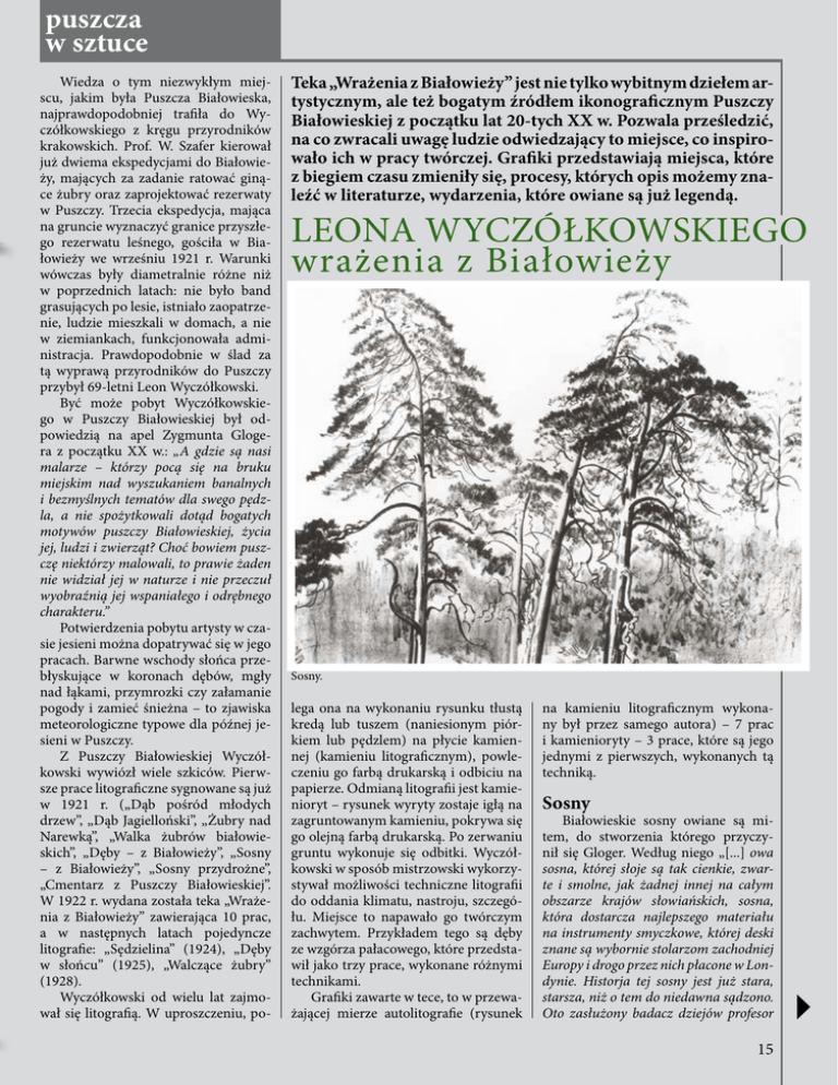 puszcza w sztuce Wiedza o tym niezwykłym miejscu, jakim była Puszcza Białowieska, najprawdopodobniej trafiła do Wyczółkowskiego z kręgu przyrodników krakowskich. Prof. W. Szafer kierował już dwiema ekspedycjami do Białowieży, mających za zadanie ratować ginące żubry oraz zaprojektować rezerwaty w Puszczy. Trzecia ekspedycja, mająca na gruncie wyznaczyć granice przyszłego rezerwatu leśnego, gościła w Białowieży we wrześniu 1921 r. Warunki wówczas były diametralnie różne niż w poprzednich latach: nie było band grasujących po lesie, istniało zaopatrzenie, ludzie mieszkali w domach, a nie w ziemiankach, funkcjonowała administracja. Prawdopodobnie w ślad za tą wyprawą przyrodników do Puszczy przybył 69-letni Leon Wyczółkowski. Być może pobyt Wyczółkowskiego w Puszczy Białowieskiej był odpowiedzią na apel Zygmunta Glogera z początku XX w.: „A gdzie są nasi malarze – którzy pocą się na bruku miejskim nad wyszukaniem banalnych i bezmyślnych tematów dla swego pędzla, a nie spożytkowali dotąd bogatych motywów puszczy Białowieskiej, życia jej, ludzi i zwierząt? Choć bowiem puszczę niektórzy malowali, to prawie żaden nie widział jej w naturze i nie przeczuł wyobraźnią jej wspaniałego i odrębnego charakteru.” Potwierdzenia pobytu artysty w czasie jesieni można dopatrywać się w jego pracach. Barwne wschody słońca przebłyskujące w koronach dębów, mgły nad łąkami, przymrozki czy załamanie pogody i zamieć śnieżna – to zjawiska meteorologiczne typowe dla późnej jesieni w Puszczy. Z Puszczy Białowieskiej Wyczółkowski wywiózł wiele szkiców. Pierwsze prace litograficzne sygnowane są już w 1921 r. („Dąb pośród młodych drzew”, „Dąb Jagielloński”, „Żubry nad Narewką”, „Walka żubrów białowieskich”, „Dęby – z Białowieży”, „Sosny – z Białowieży”, „Sosny przydrożne”, „Cmentarz z Puszczy Białowieskiej”. W 1922 r. wydana została teka „Wrażenia z Białowieży” zawierająca 10 prac, a w następnych latach pojedyncze litografie: „Sędzielina” (1924), „Dęby w słońcu” (1925), „Walczące żubry” (1928). Wyczółkowski od wielu lat zajmował się litografią. W uproszczeniu, po- Teka „Wrażenia z Białowieży” jest nie tylko wybitnym dziełem artystycznym, ale też bogatym źródłem ikonograficznym Puszczy Białowieskiej z początku lat 20-tych XX w. Pozwala prześledzić, na co zwracali uwagę ludzie odwiedzający to miejsce, co inspirowało ich w pracy twórczej. Grafiki przedstawiają miejsca, które z biegiem czasu zmieniły się, procesy, których opis możemy znaleźć w literaturze, wydarzenia, które owiane są już legendą. leona Wyczółkowskiego wrażenia z Białowieży Sosny. lega ona na wykonaniu rysunku tłustą kredą lub tuszem (naniesionym piórkiem lub pędzlem) na płycie kamiennej (kamieniu litograficznym), powleczeniu go farbą drukarską i odbiciu na papierze. Odmianą litografii jest kamienioryt – rysunek wyryty zostaje igłą na zagruntowanym kamieniu, pokrywa się go olejną farbą drukarską. Po zerwaniu gruntu wykonuje się odbitki. Wyczółkowski w sposób mistrzowski wykorzystywał możliwości techniczne litografii do oddania klimatu, nastroju, szczegółu. Miejsce to napawało go twórczym zachwytem. Przykładem tego są dęby ze wzgórza pałacowego, które przedstawił jako trzy prace, wykonane różnymi technikami. Grafiki zawarte w tece, to w przeważającej mierze autolitografie (rysunek na kamieniu litograficznym wykonany był przez samego autora) – 7 prac i kamienioryty – 3 prace, które są jego jednymi z pierwszych, wykonanych tą techniką. Sosny Białowieskie sosny owiane są mitem, do stworzenia którego przyczynił się Gloger. Według niego „[...] owa sosna, której słoje są tak cienkie, zwarte i smolne, jak żadnej innej na całym obszarze krajów słowiańskich, sosna, która dostarcza najlepszego materiału na instrumenty smyczkowe, której deski znane są wybornie stolarzom zachodniej Europy i drogo przez nich płacone w Londynie. Historja tej sosny jest już stara, starsza, niż o tem do niedawna sądzono. Oto zasłużony badacz dziejów profesor 15 „A gdzie są nasi malarze – którzy pocą się na bruku miejskim nad wyszukaniem banalnych i bezmyślnych tematów dla swego pędzla, a nie spożytkowali dotąd bogatych motywów puszczy Białowieskiej, życia jej, ludzi i zwierząt? Choć bowiem puszczę niektórzy malowali, to prawie żaden nie widział jej w naturze i nie przeczuł wyobraźnią jej wspaniałego i odrębnego charakteru.” ZYGMUNT GLOGER, pocz. XX w. Adolf Pawiński, robiąc poszukiwania archiwalne w Madrycie i Lizbonie, natrafił niespodziewanie na relacje kupców tamtejszych z pierwszych lat piętnastego stulecia o handlu drzewem na budowę okrętów i na maszty i o drodze wodnej do spławu tychże Narwią, Wisłą i morzem. Jakkolwiek nie ma tam wzmianki o Białowieży, ale gdy w Madrycie i Lizbonie mowa o masztach spławianych Narwią, to już jest dowodem dostatecznym, że były to maszty białowieskie, te właśnie, na których rozpięte żagle parły odważnych marynarzy za oceany do zdobywania dla cywilizacyi europejskiej nieznanych części świata i nieprzebranych skarbów ziemi.” Nad Narwią było wiele puszcz, z których było łatwiej spławiać drewno do Gdańska. Wytrzebione zostały w XVI i XVII w., tak że pod koniec XVIII w. zainteresowano się zasobami Puszczy Białowieskiej. W XIX w. część Puszczy uznano za „lasy okrętowe” stanowiące rezerwę budulca floty rosyjskiej. Jednak z powodu trudności spławu – nie pozyskiwano drewna na wielką skalę. Z sosnami białowieskimi związane jest archaiczne zajęcie, jakim było barnictwo. W Puszczy Białowieskiej przetrwało ono do końca XIX w., a pozostałości jego są dzisiaj jeszcze dość liczne. Droga w lesie W Puszczy występowały trzy rodzaje dróg: lokalne – służące do wywozu