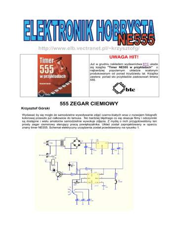 http://www.elb.vectranet.pl/~krzysztofg/ UWAGA HIT! Już w grudniu nakładem wydawnictwa BTC ukaże się książka "Timer NE555 w przykładach" o najbardziej popularnym układzie scalonym produkowanym od ponad trzydziestu lat. Książka zawiera ponad sto przykładów zastosowań timera 555. 555 ZEGAR CIEMIOWY Krzysztof Górski Wydawać by się mogło że samodzielne wywoływanie zdjęć czarno-białych wraz z rozwojem fotografii kolorowej przeszło już całkowicie do lamusa. Nic bardziej błędnego co się okazuje filmy i odczynniki są dostępne i wielu amatorów samodzielnie wywołuje zdjęcia. Z myślą o nich przygotowaliśmy ten prosty zegar ciemniowy sterujący pracą powiększalnika. Układ został zaprojektowany w oparciu znany timer NE555. Schemat elektryczny urządzenia został przedstawiony na rysunku 1. Sercem układu zegara jest timer NE555 pracujący jako generator monostabilny generujący pojedynczy impuls wyzwalany przyciskiem P1. Czas trwania impulsów podzielony jest na trzy podzakresy zmieniane przełącznikiem P2 i zależy od pojemności kondensatorów C6,C7,C8 oraz ustawienia potencjometru POT1. Elementem wykonawczym jest przekaźnik typu RM83P sterowany z wyjścia NE555 poprzez tranzystor T1. Stan pracy sygnalizowany jest zapaleniem diody D1 LED. Układ został dostosowany do zasilania jest z sieci prądu przemiennego 230V/50Hz. Na rysunku 2 przedstawiono wzór płytki drukowanej na której umieszczone są wszystkie elementy układu. Wykonanie płytki i montaż układu nie powinien zająć zbyt wiele czasu. Praktycznie po zmontowaniu układu i włączeniu zasilania urządzenie działa od razu. Regulacja urządzenia polega na dobraniu stosownie do potrzeb wartości kondensatorów C6,C7,C8. Całość urządzenia najlepiej umieścić w plastykowej obudowie z wyprowadzonymi na zewnątrz przełącznikami, potencjometrem i gniazdkiem sieciowym do podłączenia powiększalnika. Ze względu na zasilanie urządzenia z sieci 230V/50Hz należy zachować daleko idącą ostrożność aby nie zostać porażonym. Myślę że pomimo swej prostoty układ może być doskonałym uzupełnieniem warsztatu fotografika amatora. Krzysztof Górski [email protected] Wykaz elementów R1 820 R2,R3 3K9 R4 10K Pot1 100K C1 1000uF/25V C2,C3 100nF C4,C6 470uF/25V C5 10nF C7 220uF C8 100uF US1 NE555 US2 7805 D1 LED D2 1N4007 T1 BC237 PK1 RM83P 12V TR1 TS2/15 http://www.elb.vectranet.pl/~krzysztofg/