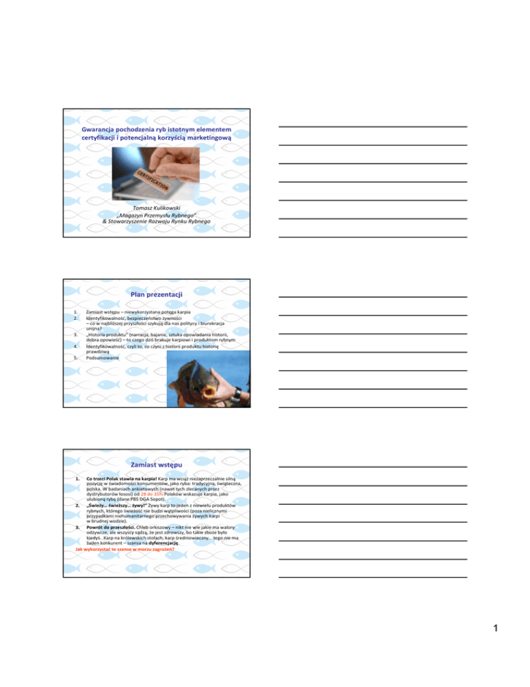 Gwarancja pochodzenia ryb istotnym elementem certyfikacji i potencjalną korzyścią marketingową Tomasz Kulikowski „Magazyn Przemysłu Rybnego” & Stowarzyszenie Rozwoju Rynku Rybnego Plan prezentacji 1. 2. 3. 4. 5. Zamiast wstępu – niewykorzystana potęga karpia Identyfikowalność, bezpieczeństwo żywności – co w najbliższej przyszłości szykują dla nas politycy i biurokracja unijna? „Historia produktu” (narracja, bajanie, sztuka opowiadania historii, dobra opowieść) – to czego dziś brakuje karpiowi i produktom rybnym Identyfikowalność, czyli to, co czyni z historii produktu historię prawdziwą Podsumowanie Zamiast wstępu Co trzeci Polak stawia na karpia! Karp ma wciąż niezaprzeczalnie silną pozycję w świadomości konsumentów, jako ryba: tradycyjna, świąteczna, polska. W badaniach ankietowych (nawet tych zlecanych przez dystrybutorów łososi) od 28 do 35% Polaków wskazuje karpia, jako ulubioną rybę (dane PBS DGA Sopot). 2. „Świeży… świeższy… żywy!” Żywy karp to jeden z niewielu produktów rybnych, którego świeżość nie budzi wątpliwości (poza nielicznymi przypadkami niehumanitarnego przechowywania żywych karpi w brudnej wodzie). 3. Powrót do przeszłości. Chleb orkiszowy – nikt nie wie jakie ma walory odżywcze, ale wszyscy sądzą, że jest zdrowszy, bo takie zboże było kiedyś. Karp na królewskich stołach, karp średniowieczny… tego nie ma żaden konkurent – szansa na dyferencjację. Jak wykorzystać te szanse w morzu zagrożeń? 1. 1 Identyfikowalność – biurokratyczny koszmar producenta? Identyfikowalność jest z pewnością obowiązkiem prawnym, wynikającym z prawa żywnościowego, a konkretniej z zasad dotyczących bezpieczeństwa żywności. Identyfikowalność będzie wkrótce dotyczyła producentów ryb słodkowodnych. Identyfikowalność wymaga dodatkowych szaf na dokumenty, a niebawem także wdrożenia systemów elektronicznego znakowania, czyli powoduje wzrost kosztów produkcji. Nad czym jeszcze pracują politycy? • Proces tworzenia prawa żywnościowego nie zakończył się. Unijna biurokracja potrzebuje uzasadnienia dla swojego istnienia, a więc nigdy nie skończy produkcji nowych aktów prawnych. • Aktualnie najważniejszym aktem prawnym „w produkcji” ROZPORZĄDZENIE PARLAMENTU EUROPEJSKIEGO I RADY w sprawie wspólnej organizacji rynków produktów rybołówstwa i akwakultury (2011/0194 (COD)) Organizacja wspólnego rynku produktów rybołówstwa i akwakultury • Co zaproponowała Komisja Europejska? (z preambuły) (15) Stosowanie wspólnych norm handlowych powinno umożliwić zaopatrzenie rynków w zrównoważone produkty, zrealizowanie pełnego potencjału wewnętrznych rynków produktów rybołówstwa i akwakultury oraz ułatwienie funkcjonowania handlu opartego na zasadach uczciwej konkurencji, aby w ten sposób poprawić rentowność produkcji. (16) Rozszerzający się asortyment produktów rybołówstwa i akwakultury powoduje konieczność zapewnienia konsumentom minimalnej ilości obowiązkowych informacji o głównych cechach produktów. W celu promowania zróżnicowania produktów konieczne jest także uwzględnienie dodatkowych informacji, które mogą być udzielane dobrowolnie. 2 Organizacja wspólnego rynku produktów rybołówstwa i akwakultury Propozycja Komisji Europejskiej: Produkty rybołówstwa i akwakultury, które są wprowadzane do obrotu na terytorium Unii, niezależnie od ich pochodzenia, mogą być oferowane w sprzedaży detalicznej konsumentowi końcowemu wyłącznie wówczas, gdy na odpowiednim oznakowaniu lub etykiecie podane są następujące informacje: a) handlowe oznaczenie gatunku (także przetwory rybne!) b) metoda produkcji, w szczególności określona słowami: „...złowione...” lub „...złowione w wodach śródlądowych...” bądź „...wyhodowane...”; (także przetwory rybne!) c) obszar, na którym produkt został złowiony lub wyhodowany (także przetwory rybne!) d) data złowienia produktów rybołówstwa lub zbioru produktów akwakultury; e) czy produkt jest świeży, czy został rozmrożony; Poza informacjami obowiązkowymi wymaganymi, następujące informacje mogą zostać przekazane na zasadzie dobrowolności: a) informacje o ochronie środowiska; b) informacje dotyczące zagadnień etycznych lub społecznych; c) informacje o technologii produkcji; d) informacje o praktykach produkcyjnych; e) informacje o zawartości składników żywieniowych w produkcie. Organizacja wspólnego rynku produktów rybołówstwa i akwakultury • Decyzja Parlamentu Europejskiego (brzmienie oryginalne): Odnośnie obligatoryjnego oznakowania produktów rybnych: (a) the commercial designation of the species; (b) the production method, in particular by the following words ‘...caught...’ or ‘...caught in freshwater ...’ or ‘...farmed...’, including, for capture fisheries, the gear type used, as defined in Annex XI to Commission Implementing Regulation (EU) No 404/2011 ; (c) specific fish stock and the area where the product was caught or farmed ; (d) for products which are to be sold fresh , the date of landing of fishery products or harvest of aquaculture products; (e) the words ‘defrosted product’ for frozen products directly placed on sale as fresh goods, as attested by a quality control grading, without prejudice to Annexes V and VI to Regulation (EU) No 1169/2011 and Article 68(3) and (4) of Implementing Regulation (EU) No 404/2011 ; Usunięto obowiązek analogicznego oznakowania przetworów rybnych. Organizacja wspólnego rynku produktów rybołówstwa i akwakultury Decyzja Parlamentu Europejskiego: Znakowanie c.d.: • in the case of fishery products caught at sea, the name of one of the areas, subareas or divisions listed in the FAO Fishing Areas, including its coastal and geographical denomination, expressed in terms understandable to consumers • (aa) in the case of fishery products caught at sea, details of whether the product