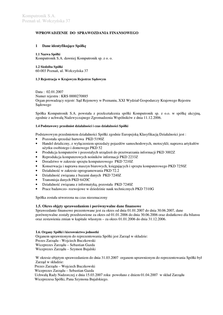 Komputronik S.A. Poznań ul. Wołczyńska 37 WPROWADZENIE DO SPRAWOZDANIA FINANSOWEGO 1 Dane identyfikujące Spółkę 1.1 Nazwa Spółki Komputronik S.A. dawniej Komputronik sp. z o. o. 1.2 Siedziba Spółki 60-003 Poznań, ul. Wołczyńska 37 1.3 Rejestracja w Krajowym Rejestrze Sądowym Data : 02.01.2007 Numer rejestru : KRS 0000270885 Organ prowadzący rejestr: Sąd Rejonowy w Poznaniu, XXI Wydział Gospodarczy Krajowego Rejestru Sądowego Spółka Komputronik S.A. powstała z przekształcenia spółki Komputronik sp. z o.o. w spółkę akcyjną, zgodnie z uchwałą Nadzwyczajnego Zgromadzenia Wspólników z dnia 11.12.2006. 1.4 Podstawowy przedmiot działalności i czas działalności Spółki Podstawowym przedmiotem działalności Spółki zgodnie Europejską Klasyfikacją Działalności jest : • Pozostała sprzedaż hurtowa PKD 5190Z • Handel detaliczny, z wyłączeniem sprzedaży pojazdów samochodowych, motocykli; naprawa artykułów użytku osobistego i domowego PKD 52 • Produkcja komputerów i pozostałych urządzeń do przetwarzania informacji PKD 3002Z • Reprodukcja komputerowych nośników informacji PKD 2233Z • Doradztwo w zakresie sprzętu komputerowego PKD 7210Z • Konserwacja i naprawa maszyn biurowych, księgujących i sprzętu komputerowego PKD 7250Z • Działalność w zakresie oprogramowania PKD 72.2 • Działalność związana z bazami danych PKD 7240Z • Transmisja danych PKD 6420C • Działalność związana z informatyką, pozostała PKD 7240Z • Prace badawczo- rozwojowe w dziedzinie nauk technicznych PKD 7310G Spółka została utworzona na czas nieoznaczony 1.5. Okres objęty sprawozdaniem i porównywalne dane finansowe Sprawozdanie finansowe prezentowane jest za okres od dnia 01.01.2007 do dnia 30.06.2007, dane porównywalne zostały przedstawione za okres od 01.01.2006 do dnia 30.06.2006 oraz dodatkowo dla bilansu oraz zestawienia zmian w kapitale własnym – za okres 01.01.2006 do dnia 31.12.2006. 1.6. Organy Spółki i kierownictwo jednostki Organem uprawnionym do reprezentowania Spółki jest Zarząd w składzie: Prezes Zarządu - Wojciech Buczkowski Wiceprezes Zarządu – Sebastian Gazda Wiceprezes Zarządu – Szymon Bujalski W okresie objętym sprawozdaniem do dnia 31.03.2007 organem uprawnionym do reprezentowania Spółki był Zarząd w składzie: Prezes Zarządu – Wojciech Buczkowski Wiceprezes Zarządu – Sebastian Gazda Uchwałą Rady Nadzorczej z dnia 15.03.2007 roku powołano z dniem 01.04.2007 w skład Zarządu Wiceprezesa Spółki, Pana Szymona Bujalskiego. Komputronik S.A. Poznań ul. Wołczyńska 37 Organem nadzorującym Spółkę jest Rada Nadzorcza w składzie: 1. Krzysztof Buczkowski – Przewodniczący Rady Nadzorczej, 2. Tomasz Buczkowski. – Członek Rady Nadzorczej, 3. Bogna Pilarczyk – Członek Rady Nadzorczej, 4. Ryszard Plichta – Członek Rady Nadzorczej, 5. Tomasz Grzybowski – Członek Rady Nadzorczej, 6. Małgorzata Zandecka – Członek Rady Nadzorczej. Członkami Rady Nadzorczej w okresie objętym sprawozdaniem do dnia 11.04.2007 byli 1. Krzysztof Buczkowski – Przewodniczący Rady Nadzorczej, 2. Tomasz Buczkowski. – Członek Rady Nadzorczej, 3. Bogna Pilarczyk – Członek Rady Nadzorczej, 4. Ryszard Plichta – Członek Rady Nadzorczej, 5. Tomasz Grzybowski – Członek Rady Nadzorczej, 6. Małgorzata Zandecka – Członek Rady Nadzorczej. Uchwałą nr 1 Nadzwyczajnego WZA z dnia 11.04.2004 określono liczebność Rady Nadzorczej na 5 członków oraz odwołano pana Ryszarda Plichtę z pełnienia funkcji członka Rady Nadzorczej Uchwałą nr 1 Nadzwyczajnego WZA z dnia 28.06.2007 określono liczebność Rady Nadzorczej na 6 członków i powołano pana Ryszarda Plichtę do pełnienia funkcji członka Rady Nadzorczej. 1.7. Sprawozdanie finansowe zawierające dane łączne W skład przedsiębiorstwa nie wchodzą wewnętrzne jednostki organizacyjne sporządzające samodzielnie sprawozdania finansowe. Prezentowane sprawozdania finansowe nie zawierają danych łącznych. 1.8. Skonsolidowane sprawozdanie finansowe Emitent jest jednostką dominującą w stosunku do podmiotu zależnego Komputronik Biznes S.A. z siedzibą w Poznaniu, w którym posiada 100% kapitału zakładowego i 100% głosów WZA. Emitent sporządza skonsolidowane sprawozdanie finansowe począwszy od 30.06.2007 roku. 1.9. Sprawozdanie finansowe sporządzone po połączeniu spółek. W okresach prezentowanych nie nastąpiło połączenie spółek. 1.10. Założenie kontynuacji działalności gospodarczej Sprawozdanie finansowe zostało sporządzone przy założeniu kontynuowania działalności gospodarczej w dającej się przewidzieć przyszłości. Nie istnieją żadne okoliczności wskazujące na zagrożenie kontynuowania działalności. 1.11. Porównywalność sprawozdań finansowych Sprawozdania finansowe nie wymagały i nie podlegały przekształceniu w celu zapewnienia porównywalności danych. 1.12. Korekty wynikające z zastrzeżeń w opiniach podmiotów uprawnionych do badania Opinie podmiotu uprawnionego do badania o sprawozdaniach finansowych za okresy, za które sprawozdanie finansowe lub dane porównywalne zostały zamieszczone w raporcie półrocznym, nie zawierały zastrzeżeń. 2 Opis przyjętych zasad (polityki) rachunkowości w tym metod wyceny aktywów i pasywów oraz przychodów i kosztów, pomiaru wyniku finansowego oraz sposobu sporządzenia sprawozdania finansowego i danych porównywalnych Sprawozdanie finansowe sporządzone zostało zgodnie z praktyką stosowaną przez jednostki działające w Polsce, w oparciu o zasady rachunkowości wynikające z przepisów ustawy z dnia 29 września 1994 r. o rachunkowości (tekst jednolity Dz.U.z 2002 r. nr 76 poz. 694 z późniejszymi zmianami). 2 Komputronik S.A. Poznań ul. Wołczyńska 37 2.1. Metody wyceny aktywów i pasywów z założeniem kontynuacji działalności Spółki Wartości niematerialne i prawne Wartości niematerialne i prawne wyceniane są wg ceny nabycia lu