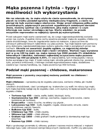 Mąka pszenna i żytnia – typy i możliwości ich wykorzystania Nie raz zdarzyło się, że mąka użyta do ciasta spowodowała, że otrzymany placek na środku posiadał ogromny niedopieczony fragment, a ciasto na pierogi nie było wystarczająco elastyczne. Stojąc przed sklepową półką pełną prostokątnych, papierowych paczuszek wypełnionych zmielonymi ziarnami zboża, możemy spotkać się z problemem, jaką mąkę wybrać i o czym informuje nas numer określający jej typ. Warto wiedzieć, że przede wszystkim naprowadza na najlepszy sposób jej wykorzystania. Przed zakupem mąki warto zastanowić się, do czego najprawdopodobniej zostanie przez nas zużyta. Zupełnie różne cechy powinna posiadać mąka do wypieku chleba czy ciasta drożdżowego, inne do zagniecenia ciasta na makaron, a jeszcze inne do zdrowych pełnoziarnistych naleśników czy placuszków. Typ mąki będzie nam pomocny przy dokonaniu najodpowiedniejszego wyboru gatunku mąki o pożądanych przez nas cechach. Określa on zawartość popiołu ogółem, co najprościej mówiąc oznacza stopień oczyszczenia mąki z łuski i otrębów. Wartość typu wyrażona jest w g na 100 kg mąki, np. mąka razowa typ 2000 posiada 2% składników mineralnych i błonnika, natomiast najbardziej oczyszczona mąka pszenna tortowa typ 450 już jedynie 0,45%. Im więcej bielma, tym mniej popiołu i niższa liczba wyrażająca typ mąki. Z kolei rodzaj mąki, określa gatunek zboża (np. pszenica, żyto, pszenica orkiszowa), z którego została wyprodukowana mąka, dodatkowo zawiera typ i nazwę handlową, np. mąka pszenna typ 450 tortowa. Podział mąki pszennej – chlebowa, makaronowa Mąki pszenne z pszenicy zwyczajnej możemy podzielić na chlebowe i makaronowe. Mąki chlebowe – sprawdzą się do wypieku pieczywa, zarówno chleba, jak i bułek słonych i słodkich drożdżówek, ciast i przekąsek np. krakersów czy wafli. Im niższy typ mąki, tym mąka bardziej nadaje się do wypieku ciast, a im wyższy to lepiej sprawdzi się przy wypieku chleba. Tortowa typ 450 – ciasta, wafle, babki, biszkopt, torty, Szymanowska typ 480 – pierogi, zasmażka, zagęszczanie sosów, ciasta (podobnie jak tortowa), Krupczatka – ciasto kruche, na eklery czy ptysie , Luksusowa typ 550 – bułki, bagietki, rogale, obwarzanki, strucle, ciasto drożdżowe, pączki, faworki, Bułkowa typ 650 – bułki, Chlebowa typ 750 – chleb zwykły, Sitkowa typ 1400 – chleb sitkowy, Graham typ 1850 – chleb graham i bułki grahamki (z domieszką mąki typ 650/750) Razowa typ 2000 – chleb razowy. Mąki z grubszego przemiału tj. sitkowa, graham i razowa można mieszać z mąkami niższego typu i piec zdrowsze wersje klasycznych ciasteczek, muffin czy pieczywa. Mąka makaronowa, wykonana jest z przemiału pszenicy szklistej typu durum. To gatunek najszlachetniejszy. Mąka makaronowa cechuje się grubszym przemiałem, w porównaniu z chlebową. Należą do niej typy 950, semolina oraz typ 1750. Warto wykorzystać ją do wyrobu ciasta na swój własny makaron. Z pewnością okaże się zupełnie inny w smaku od zakupionego w pobliskim sklepie spożywczym czy markecie. Podział mąki żytniej Mąka żytnia również posiada różne typy, w zależności od stopnia oczyszczenia ziarna. Wykorzystujemy ją głównie do produkcji pieczywa, ciast słonych oraz do wzbogacenia ciast słodkich, o cenniejsze składniki odżywcze. Wyróżniamy mąki: jasna typ 580 i 650, żytnia typ 800 i 950, sitkowa 1400, starogradzka (graham) 1850, razowa 2000. Decydując się na zakup mąki warto wziąć pod uwagę do czego chcemy ja wykorzystać. Dzięki temu Twoje zbożowe wypieki okażą się smaczniejsze, a ich smak i konsystencja o wiele przyjemniejsze. Znajomość typów mąki przyda się również podczas zakupów – czytając etykietę umieszczoną na bochenku chleba czy foliowej torebce makaronu, dowiesz się czy wybór, którego dokonałeś jest dobry czy warto poszukać innego, bardziej wartościowego produktu. Jest wiele argumentów przemawiających za tym, aby zwykłą mąkę zastąpić mąką pełnowartościową. Author: Martyna Jaros Link do artykułu: http://bonavita.pl/maka-pszenna-i-zytnia-typy-i-mozliwosci-ichwykorzystania