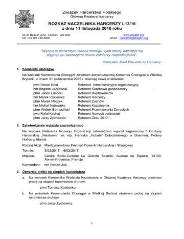 Związek Harcerstwa Polskiego Główna Kwatera Harcerzy ROZKAZ NACZELNIKA HARCERZY L13/16 z dnia 11 listopada 2016 roku 23-31 Beavor Lane, London, W6 9AR. Tel: +44 208 748 8006 www.zhpgkh.org email: [email protected] "Wyście w pierwszym stanęli szeregu, tych którzy odważyli się sięgnąć po zaszczytne miano żołnierzy niepodległości". Marszałek Józef Piłsudski do Harcerzy. 1. Komenda Chorągwi Na wniosek Komendanta Chorągwi zwalniam dotychczasową Komendę Chorągwi w Wielkiej Brytanii i z dniem 31 października 2016 r. mianuję nową w składzie: pwd Daniel Best hm Bogdan Jackowski phm Janek Lasocki hm Marek Iczkiewicz phm Marek Mrozek hm Michał Nalewajko phm Wojtek Bernasiński pwd Rafał Kochaj phm Jerzy Zychowicz Referent. Administracyjno-organizacyjny Referent Skarbowo-gospodarczy Referent Wędrowników Referent Harcerzy Referent Zuchów Referent Kształcenia Referent Przyjmowania Dorosłych Referent Nowych Jednostek Referent Zlotu 2017. . 2. Zatwierdzenie wyjazdu zagranicznego Na wniosek Referenta Rozwoju Organizacji zatwierdzam wyjazd zagraniczny 5 Drużyny Harcerskiej „Niezłomni” im. mjr. Henryka „Hubala” Dobrzańskiego w Shannon, Próbny Hufiec w Irlandii. Rodzaj Akcji: Międzynarodowy Festival Piosenki Harcerskiej i Skautowej Termin: 3/02/2017 – 6/02/2017. Miejsce: Centre Socio-Culturel La Grande Bastide, Avenue du Square, 13100, Aix-en-Provence, Francja Komendant: hm Robert Juś. 3. Otwarcie próby na stopień harcmistrza a. Na wniosek Kierownika Wydziału Kształcenia w Głównej Kwaterze Harcerzy otwieram próbę na stopień harcmistrza druhowi phm Tomasz Kostienko. b. Na wnioskek Komendanta Chorągwi w Wielkiej Brytanii otwieram próbę na stopień harcmistrza druhowi phm Jerzy Zychowicz. 1 4. Roczna rejestracja instruktorów i jednostek harcerskich Regulaminy naszej Organizacji wymagają, że każdy instruktor i każda jednostka musi się zarejestrować na początku każdego roku. We wszystkich Okręgach ubezpieczenie harcerskie pokrywa tylko zarejestrowanych instruktorów oraz uczestników w zarejestrowanych jednostkach. Tylko zarejestrowani instruktorzy mogą pełnić funkcje i działać w naszej Organizacji. Ci którzy nie przestrzegają punktualnie rocznej rejestracji narażają siebie na poważne konsekwencje prawne w razie wypadków itp. 5. Rejestracja starszyzny. a. Zarządzam roczną rejestrację członków starszyzny naszej Organizacji na dzień 1 stycznia 2017 r. b. Wszyscy czynni członkowie starszyzny składają arkusze rejestracyjne wraz z opłatami organizacyjnymi do Komendanta Chorągwi. Przewodnicy czynią to przez hufcowych, którzy opiniują arkusze przewodników przed przesłaniem ich do Komendanta Chorągwi. Pozostali członkowie starszyzny wysyłają swoje arkusze bezpośrednio do Komendanta Chorągwi. c. Instruktorzy, którzy wracają do czynnej pracy, wypełniają arkusz rejestracyjny i wysyłają, wraz ze składką, do Komendanta Chorągwi. d. Arkusze rejestracyjne harcmistrzów, podharcmistrzów, instruktorek zuchowych i działaczy harcerskich, z opinią i wnioskiem Komendanta Chorągwi o zaliczenie służby albo nie, wraz z należytymi składkami przesyłane są do Głównej Kwatery Harcerzy w Londynie. e. Arkusze rejestracyjne przewodników pozostają u Komendantów Chorągwi. 6. Roczna rejestracja jednostek organizacyjnych. a. Zarządzam złożenie rocznych raportów rejestracyjnych chorągwi, hufców, drużyn i gromad oraz jednostek samodzielnych do dnia 31 grudnia 2016 r. b. Raporty roczne jednostek składane są drogą służbową na odpowiednich kartach rejestracyjnych, których wzory są dostępne na witrynie Głównej Kwatery Harcerzy www.zhpgkh.org/dokumenty/administracja/ c. Na podstawie otrzymanych arkuszy jednostek Komendanci Chorągwi sporządzają zestawienie statystyczne i Roczny Raport Chorągwi, który przesyłają do GKH. 7. Terminy. Ustalam termin przesłania do GKH arkuszy rejestracyjnych instruktorów, Rocznych Raportów Chorągwi oraz opłat organizacyjnych do dnia 31 stycznia 2017 r. UWAGA: Spóźnione rejestracje członków starszyzny, które wpłyną do GKH po 28.02.2017 r będą przyjmowane jedynie w wyjątkowych wypadkach. 8. Konkurs fotografi na stronie Facebooku Konkurs pod tytułem: „Najciekawsze zdjęcie harcerskie ZHP działającego poza granicami Kraju” został ogłoszony na stronie https://www.facebook.com/ZHP.Organizacja.Harcerzy 2 Zasady konkursu: Każda gromada/drużyna/samodzielny zastęp może przysłać do konkursu jedno swoje zdjęcie (pojedyncze zdjęcie, nie kompozyt kilku). Mogą być na nim osoby, ale nie muszą. Ważne jest by był na nim element kojarzony ściśle z harcerstwem. Termin przysyłania zgłoszeń do 24:00 15/12/2016; Termin oceniania do 24:00 20/12/2016. O zwycięstwie i zajętym miejscu decyduję liczba polubień pod danym zdjęciem. Zdjęcia prosimy wysłać tylko w dobrej jakości (wyższa rozdzielczość zdjęcia) na adres mailowy: [email protected] (nie przez Facebooka - niższa rozdzielczość). Prosimy dołączyć krótki opis zdjęcia (np. gdzie, kiedy zostało zrobione, okoliczności itp) Czuwaj ! Marek Szablewski,hm Naczelnik Harcerzy. 3