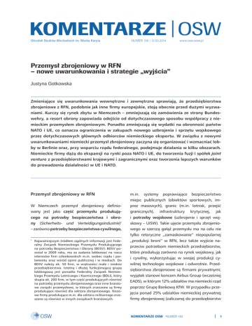 Ośrodek Studiów Wschodnich im. Marka Karpia NUMER 130 | 12.03.2014 www.osw.waw.pl Przemysł zbrojeniowy w RFN – nowe uwarunkowania i strategie „wyjścia” Justyna Gotkowska Zmieniające się uwarunkowania wewnętrzne i zewnętrzne sprawiają, że przedsiębiorstwa zbrojeniowe z RFN, podobnie jak inne firmy europejskie, stoją obecnie przed dużymi wyzwaniami. Kurczy się rynek zbytu w Niemczech – zmniejszają się zamówienia ze strony Bundeswehry, a resort obrony zapowiada odejście od dotychczasowego sposobu współpracy z niemieckim przemysłem zbrojeniowym. Ponadto zmniejszają się wydatki na obronność państw NATO i UE, co oznacza ograniczenia w zakupach nowego uzbrojenia i sprzętu wojskowego przez dotychczasowych głównych odbiorców niemieckiego eksportu. W związku z nowymi uwarunkowaniami niemiecki przemysł zbrojeniowy zaczyna się organizować i wzmacniać lobby w Berlinie oraz, przy wsparciu rządu federalnego, podejmuje działania w kilku obszarach. Niemieckie firmy dążą do ekspansji na rynki poza NATO i UE, do tworzenia fuzji i spółek joint venture z przedsiębiorstwami krajowymi i zagranicznymi oraz tworzenia lepszych warunków do prowadzenia działalności w UE i NATO. Przemysł zbrojeniowy w RFN W Niemczech przemysł zbrojeniowy definiowany jest jako część przemysłu produkującego na potrzeby bezpieczeństwa i obrony (Sicherheits- und Verteidigungsindustrie)1 – zarówno potrzeby bezpieczeństwa cywilnego, Najważniejszym źródłem ogólnych informacji jest Federalny Związek Niemieckiego Przemysłu Produkującego na potrzeby Bezpieczeństwa i Obrony (BDSV). BDSV powstał w 2009 roku, ma za zadanie lobbować na rzecz interesów firm członkowskich m.in. wobec rządu i parlamentu oraz wśród opinii publicznej i w mediach. Do BDSV należy ok. 50 firm, w większości małe i średnie przedsiębiorstwa. Istotną i dłużej funkcjonującą grupą lobbingową jest ponadto Federalny Związek Niemieckiego Przemysłu Lotniczego i Kosmicznego (BDLI), który skupia ok. 200 firm, w tym część produkujących również na potrzeby przemysłu zbrojeniowego oraz inne branżowe związki przemysłowe, w których zrzeszone są firmy produkujące również dla sektora zbrojeniowego. Niszowe firmy produkujące m.in. dla sektora militarnego zrzeszone są również w innych związkach branżowych. 1 m.in. systemy poprawiające bezpieczeństwo miejsc publicznych (obiektów sportowych, imprez masowych), granic (m.in. lotnisk, przejść granicznych), infrastruktury krytycznej, jak i potrzeby wojskowe (uzbrojenie i sprzęt wojskowy – UiSW). Takie ujęcie przemysłu zbrojeniowego w szerszą gałąź przemysłu ma na celu nie tylko retoryczne „zamaskowanie” niepopularnej „produkcji broni” w RFN, lecz także wyjście naprzeciw potrzebom niemieckich przedsiębiorstw, które produkują zarówno na rynek wojskowy, jak i cywilny, wykorzystując w swojej produkcji cywilnej technologie wojskowe i odwrotnie. Przedsiębiorstwa zbrojeniowe są firmami prywatnymi; wyjątek stanowi koncern Airbus Group (wcześniej EADS), w którym 12% udziałów ma niemiecki rząd poprzez Grupę Bankową KfW. W przypadku przejęcia ponad 25% udziałów niemieckiej prywatnej firmy zbrojeniowej (zaliczanej do przedsiębiorstw KOMENTARZE OSW NUMER 130 1 strategicznych) przez inwestora z państw trzecich (spoza UE i EFTA) rząd federalny ma możliwość skontrolowania takiej transakcji i zgłoszenia wobec niej weta. Niemiecki przemysł zbrojeniowy charakteryzuje się dużą różnorodnością. Do największych firm zbrojeniowych, które produkują kompleksowe systemy, zaliczyć należy firmy widniejące na liście SIPRI stu największych firm zbrojeniowych w 2012 roku2. Są to niemieckie spółki córki europejskich koncernów Airbus Group (spółki Airbus, Airbus Defence & Space i Airbus Helicopters)3 i MBDA (spółka MBDA Deutschland) oraz przedsiębiorstwa niemieckie: Rheinmetall Defence, ThyssenKrupp Marine Systems (TKMS), Krauss-Maffei Wegmann (KMW) oraz Diehl Defence. Do grupy największych niemieckich firm z sektora zbrojeniowego należy również zaliczyć Niemiecki przemysł zbrojeniowy charakteryzuje gęsta sieć powiązań z przedsiębiorstwami zagranicznymi w NATO i UE. producentów silników i zespołów napędowych MTU Aero Engines i MTU Friedrichshafen, znanego producenta broni palnej Heckler & Koch czy producenta kutrów i okrętów Lürssen Defence, którym niewiele zabrakło do znalezienia się na liście SIPRI. Warto też wyróżnić niemieckie małe i średnie przedsiębiorstwa zajmujące czołowe pozycje w niszowych technologiach wojskowych (produkujące również na rynek cywilny), jak np. OHB-System (projektowanie, produkcja i montaż satelitów), Carl Zeiss (urządzenia optyczne), Rhode-Schwarz (urządzenia pomiarowe, telekomunikacyjne, detektory), Plath (urządzenia radiolokacyjne, rozpoznania radioelektronicznego), ESG (systemy informatyczne, komunika- SIPRI, The SIPRI Top 100 arms-producing and military services companies in the world, 2012, http://www.sipri. org/research/armaments/production/Top100 3 Przed reorganizacją, tj. do 1 stycznia 2014 roku, koncern nosił nazwę EADS; ze spółkami córkami w RFN: Cassidian, Eurocopter, Astrium i Airbus Operations. 2 cyjne i nawigacyjne), Atlas Elektronik (systemy dla okrętów). O ich znaczeniu świadczy uzgodniona przez kilka branżowych związków przemysłowych koncepcja polityki wobec małych i średnich firm w omawianym sektorze z marca 2013 roku4. Na potrzeby wojskowe produkują również największe „cywilne” koncerny w RFN, jak np. Mercedes Benz (podwozia), Daimler (podwozia, ciężarówki, większościowy udziałowiec MTU Friedrichshafen), SAP i IBM (software, bazy danych), Kärcher (systemy dekontaminacyjne, kuchnie polowe) czy Siemens (m.in. systemy telekomunikacyjne i informatyczne)5. Niemiecki przemysł zbrojeniowy charakteryzuje również gęsta sieć powiązań z przedsiębiorstwami zagranicznymi w pańs