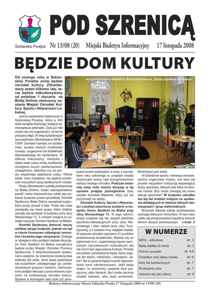 POD SZRENICą Szklarska Poręba Nr 13/08 (20) Miejski Biuletyn Informacyjny 17 listopada 2008 BĘDZIE DOM KULTURY Od nowego roku w Szklarskiej Porębie znów będzie ośrodek kultury. Zlikwidowany przed kilkoma laty, teraz będzie odbudowywany od podstaw. 1 stycznia na Białej Dolinie utworzony zostanie Miejski Ośrodek Kultury, Sportu i Aktywności Lokalnej. Jest to wydarzenie historyczne w Szklarskiej Porębie, która w XXI wiek wstąpiła likwidując kolejne samorządowe jednostki. Dziś już nikt chyba nie ma wątpliwości, że był to poważny błąd. W imię budżetowych oszczędności zlikwidowano MOK i OSiR. Zamiast rozwijać ich działalność, szukać nowych możliwości rozwoju, wygaszano ich działalność doprowadzając do zamknięcia. W efekcie mieszkańcy, młodzież i dzieci mieli coraz mniej możliwości rozwijania swych zainteresowań, umiejętności, talentów czy po prostu wspólnego spędzania czasu. Oferta szkół, choć rozwijana, nie spełnia oczekiwań wszystkich grup społecznych miasta. Kiedy zlikwidowano szkołę podstawową na Białej Dolinie, dzięki zaangażowaniu parafii i wielu mieszkańców, udało się uratować budynek przed sprzedażą. Komitet Społeczny Biała Dolina zarządzał budynkiem przez ponad 2 lata. Przez ten czas zawiązały się nowe grupy, które chętnie zaczęły się spotykać w budynku przy ulicy Słowackiego 13. Z czasem miejsce to zaczęto nazywać Domem Spotkań na Białce. Komitet Społeczny dokonał rzeczy wielkiej ratując budynek, jednak nie był w stanie finansowo udźwignąć remontów i kosztów jego utrzymania. Dlatego w ubiegłym roku podjęta została decyzja, że Dom Spotkań na Białce zarządzany będzie przez Miejski Ośrodek Pomocy Społecznej. Z dotychczasowymi opiekunami ustalono, że utworzone zostaną dwa półetaty dla osób, które będą opiekować się budynkiem udostępniając go zainteresowanym grupom i osobom. Jednocześnie podjęto decyzje o poszukiwaniu sposobu na reaktywację ośrodka kultury. Sprawa w komisjach rady była już poru- wyremontowana Świetlica Środowiskowa w „Domu Spotkań na Białce” szana przed wakacjami, a wraz z początkiem roku szkolnego w urzędzie miasta rozpoczęto pracę nad przygotowaniem statutu nowego ośrodka. Podczas ostatniej sesji rada miasta decyzję w tej sprawie podjęła jednogłośnie (bez udziału Konrada Makówki, który już nie przychodzi na sesje). Ośrodek Kultury, Sportu i Aktywności Lokalnej utworzony zostanie w budynku Domu Spotkań na Białce przy ulicy Słowackiego 13. W jego administracji znajdzie się też zespół obiektów sportowo-rekreacyjnych przy ulicy Waryńskiego i plac zabaw przy ulicy Turystycznej, a z czasem inny majątek miasta. W statucie ośrodka zapisano 21 punktów podstawowej działalności. Będzie się on zajmować m.in. organizacją imprez sportowych, rozrywkowych i kulturalnych, ale nie ma to być jego jedyna funkcja. Przede wszystkim prowadzone będą różne zajęcia dla dzieci, młodzieży i dorosłych. Jakie? Na to pytanie będą musieli odpowiedzieć sami zainteresowani. Jeśli będą chętni, to utworzony zostanie klub plastyczny, albo literacki. Być może zacznie działać kabaret, albo teatr amatorski. Możliwości jest wiele. W dziedzinie sportu i rekreacji ośrodek, oprócz organizacji imprez, ma stać się przede wszystkim instytucją wspierającą kluby sportowe, których jest kilka na terenie miasta. Być może zawiążą się nowe sekcje sportowe? W budynku ośrodka ma się też znaleźć miejsce na spotkania działających w mieście różnych stowarzyszeń i grup nieformalnych. Budynek dawnej szkoły podstawowej wymaga dalszych remontów. W tym roku udało się przeprowadzić kapitalny remont dwóch dużych pomieszczeń. c.d.str. 2 w nUMERZE MZGL - odbudowa str. 3 Będą dopłaty do wody str. 3 Robimy porządki str. 4-5 Cmentarz (nie) sławy miasta str. 6 Kary dla budowniczych str. 7 Rozkopane ulice str. 7 Jeszcze się tyle zdarzy str. 8 Biuletyn Informacyjny Miasta Szklarska Poręba 17 listopada 2008 nr 13/08 (20) c.D. BĘDZIE DOM KULTURY budynek wymaga dalszych remontów W jednym z nich działa świetlica środowiskowa. Wykonano też ogrom pracy przy odwodnieniach budynku, który po raz pierwszy od kilkudziesięciu lat nie jest już zalewany wodami gruntowymi. Władze miasta chcą, aby w przyszłym roku zakończony został remont lewostronnej części budynku, która posiada niezależną klatkę schodową. Są tam m.in. toalety i łazienki. Program termoizolacji, do którego przystępuje Szklarska Poręba pozwoli za unijne pieniądze ocieplić budynek. Jest też planowany remont przebudowy instalacji grzewczej, która w tej chwili wykorzystuje wiele metrów sześciennych wody. Choć piec CO jest w dobrym stanie i ma wysoki współczynnik sprawności, to ilość podgrzewanej wody jest ogromna. Prace te na pewno wpłyną w przyszłości na obniżenie rachunków i kosztów eksploatacji. Jednocześnie z pracami remontowymi rozpocznie się merytoryczna praca ośrodka. Utworzenie Miejskiego Ośrodka Kultury, Sportu i Aktywności Lokalnej możliwe jest dzięki prowadzonej polityce finansowej miasta. Wydatki budżetowe planowane są na podstawie przy- chodów z podatków, opłat i dochodów z dzierżaw majątku gminnego. Pieniądze, które przez lata wyciekały, teraz trafiają do budżetu. Przykładem niech będzie Park Linowy. Teren na którym powstał (część parku Esplanada) przez poprzednie władze miasta wydzierżawiony został za 2 złote rocznie. Dzisiaj umowa jest o tysiąckroć wyższa za połowę mniejszy teren. Oczywiście, za te pieniądze nie sposób stworzyć domu kultury. Jednak do budżetu miasta zaczynają spływać pieniądze z miejskiego majątku, z którego dotychczas nie było żadnych dochodów. Doskonałym przykładem jest tu las w Szklarskiej Porębie Średniej, w którym powstaje Park Dinozaurów. Teren który leżał odłogiem i na którym nie można było budować hotelu, da teraz budże