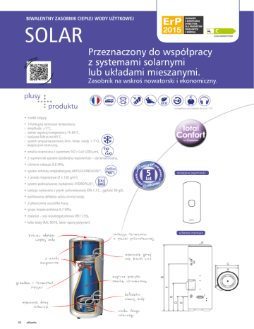 BIWALENTNY ZASOBNIK CIEPŁEJ WODY UŻYTKOWEJ SOLAR a c ji więc ej i orm nf ErP 2015 ZGODNOŚĆ Z EUROPEJSKĄ DYREKTYWĄ DLA PRODUKTÓW ZWIĄZANYCH Z ENERGIĄ C KLASA ENERGETYCZNA Przeznaczony do współpracy z systemami solarnymi lub układami mieszanymi. Zasobnik na wskroś nowatorski i ekonomiczny. szczegółowy opis znajduje się na str. 119 • model stojący, • 3-funkcyjny termostat temperatury: – amplituda ±5°C, – zakres regulacji temperatury 15-65°C, – nastawa fabryczna 65°C, – system antyzamarzaniowy (min. temp. wody +7°C), – bezpiecznik termiczny, • emalia ceramiczna z systemem TiO+CuO (200 µm), • 2 wymienniki spiralne (podwójna wężownica) – stal emaliowana, • ciśnienie robocze 0,6 MPa, • system ochrony antybakteryjnej ANTILEGIONELLOSE®, dostępna pojemność • 2 anody magnezowe (2 x 130 g/m²), • system podwyższonej wydajności HYDROPLUS®, • izolacja wykonana z pianki poliuretanowej (0% C.F.C., gęstość 40 g/l), • profilowany deflektor wlotu zimnej wody, • 2-płaszczowa uszczelka kryzy, • grupa bezpieczeństwa 0,7 MPa, • materiał – stal wysokogatunkowa (RST 235), 300 L • kolor biały (RAL 9016, lakier epoxy-polyester). króciec odpływu ciepłej wody 2 anody magnezowe schemat montażu izolacja termiczna z pianki poliuretanowej K wymiennik górny (np. Kocioł c.o.) J C 84 atlantic sonda obiegu solarnego I E G deflektor zimnej wody D wymiennik dolny (solarny) F grzałka + termostat (opcja) wnętrze pokryte emalią ceramiczną B A charakterystyka techniczna pojemność (l) moc wymiennika (kW)1 powierzchnia wymiennika (m2) pojemność wymiennika (l) przepływ godzinowy (l/h)2 przepływ minutowy (l/10 min) realny czas nagrzewania (min) strata energii (kWh/24 h)4 waga (kg) moc grzałki (W) * zasilanie grzałki (V) * pojemność ogrzewana (l)3 * realny czas nagrzewania (h)3 * cena netto (zł) cena brutto (zł) referencja 300 34/24,6 1,07/0,66 6,3/4,9 600/937 200/415 26 3,17 105 2400 230 107 3 h 05 2 705 3 327 237 301 cena netto (zł) cena brutto (zł) referencja 250 308 900 336 (1) - o bieg pierwotny - 2 m3/h, temperatura wody 90°C (2) - obieg wtórny - 2 m3/h, temperatura wody 90°C, ΔT=35°C (3) - ogrzewanie przy użyciu grzałki elektrycznej (ΔT=50°C) (4) - temperatura wody magazynowanej 65°C (temp.otoczenia 20°C) * - opcja opcja ZASOBNIKI C.W.U. grzałka elektryczna 2400 W + termostat SOLAR biwalentny zasobnik ciepłej wody użytkowej model 300 l dostępne są również większe pojemności 500-750-1000-1500-2000 L Więcej szczegółów znajdziesz na naszej stronie internetowej www.atlantic-polska.pl, szukając produktu o nazwie CORSUN 2. a c ji :/ /w w wymiary (mm) A B C D E F G I J K SOLAR 300 575 1735 620 390 365 1230 725 3/4” 1” 3/4” un tp _2 ht / więc ej i orm nf w. at lan tic- pols ka.pl/ nasze_produkty/z aso bni k w i_c u/ co rs atlantic 85