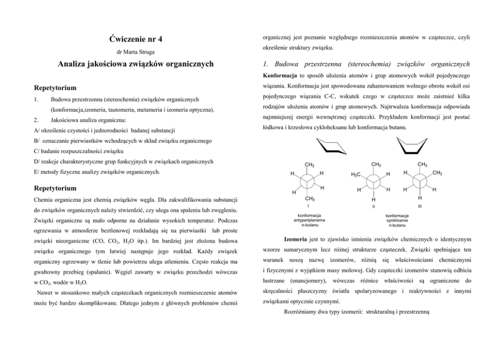 organicznej jest poznanie względnego rozmieszczenia atomów w cząsteczce, czyli Ćwiczenie nr 4 określenie struktury związku. dr Marta Struga Analiza jakościowa związków organicznych 1. Budowa przestrzenna (stereochemia) związków organicznych Konformacja to sposób ułożenia atomów i grup atomowych wokół pojedynczego wiązania. Konformacja jest spowodowana zahamowaniem wolnego obrotu wokół osi Repetytorium 1. pojedynczego wiązania C-C, wskutek czego w cząsteczce może zaistnieć kilka Budowa przestrzenna (stereochemia) związków organicznych (konformacja,izomeria, tautomeria, metameria i izomeria optyczna). 2. rodzajów ułożenia atomów i grup atomowych. Najtrwalsza konformacja odpowiada najmniejszej energii wewnętrznej cząsteczki. Przykładem konformacji jest postać Jakościowa analiza organiczna: łódkowa i krzesłowa cykloheksanu lub konformacja butanu. A/ określenie czystości i jednorodności badanej substancji B/ oznaczanie pierwiastków wchodzących w skład związku organicznego C/ badanie rozpuszczalności związku D/ reakcje charakterystyczne grup funkcyjnych w związkach organicznych H Repetytorium H3C H H CH3 I do związków organicznych należy stwierdzić, czy ulega ona spaleniu lub zwęgleniu. H H CH3 H H H H H II III konformacja antyperiplanarna n-butanu Związki organiczne są mało odporne na działanie wysokich temperatur. Podczas ogrzewania w atmosferze beztlenowej rozkładają się na pierwiastki H H Chemia organiczna jest chemią związków węgla. Dla zakwalifikowania substancji CH3 CH3 CH3 E/ metody fizyczne analizy związków organicznych. konformacje synklinarne n-butanu lub proste związki nieorganiczne (CO, CO2, H2O itp.). Im bardziej jest złożona budowa Izomeria jest to zjawisko istnienia związków chemicznych o identycznym związku organicznego tym łatwiej następuje jego rozkład. Każdy związek wzorze sumarycznym lecz różnej strukturze cząsteczek. Związki spełniające ten organiczny ogrzewany w tlenie lub powietrzu ulega utlenieniu. Często reakcja ma warunek noszą gwałtowny przebieg (spalanie). Węgiel zawarty w związku przechodzi wówczas i fizycznymi z wyjątkiem masy molowej. Gdy cząsteczki izomerów stanowią odbicia w CO2, wodór w H2O. lustrzane Nawet w stosunkowo małych cząsteczkach organicznych rozmieszczenie atomów może być bardzo skomplikowane. Dlatego jednym z głównych problemów chemii nazwę (enancjomery), izomerów, różnią wówczas różnice się właściwościami chemicznymi właściwości są ograniczone do skręcalności płaszczyzny światła spolaryzowanego i reaktywności z innymi związkami optycznie czynnymi. Rozróżniamy dwa typy izomerii: strukturalną i przestrzenną Izomeria strukturalna Izomeria przestrzenna (stereoizomeria): lub np. propyloamina i N-metlylo-etyloamina (konstytucyjna): izomeria łańcuchowa izomeria geometryczna (cis-trans) izomeria podstawienia (położenia) izomeria optyczna CH3CH2CH2 NH2 CH3CH2 CH3 N-metylo-etyloamina propyloamina izomeria funkcyjna (metameria) NH tautomeria Izomeria łańcuchowa – polegająca na odmiennej konstytucji łańcucha, CH2 H3 C CH3 CH2 podwójnego tego samego związku. np. tautomeria keto-enolowa kwasu w obrębie H O H polegająca (grupę na funkcyjną C COOH H CH2 CH2 CH3 pozycji Cl CH CH2 wodór), enol Tautomeria amino-iminowa występuje m.in. w zasadach pirymidynowychNH NH2 CH3 HN HN O 2-chlorobutan OH N którego sztywność wyklucza obrót wokół niego. Izomery geometryczne charakteryzują C3 H6O funkcyjnych , np. aldehyd i keton H Aldehyd propionowy się O H3C C forma iminowa Izomeria geometryczna jest następstwem występowania wiązania podwójnego Izomeria funkcyjna (metameria) – spowodowana obecnością różnych grup H3C C C H2 N cytozyna forma aminowa O COOH dwie formy kwasu pirogronowego Cl 1-chlorobutan C H zajmowanej atom inny niż H3C C keton różnej lub C np. 1-chlorobutan i 2-chlorobutan: CH2 wiązania OH H izobutan Izomeria podstawienia – podstawnik przemieszczania się protonu i CH CH3 H3 C n-butan przez wzajemnego pirogronowego. np. n-butan i izobutan H3 C Tautomeria – zjawisko identyczną strukturą, różnią się konfiguracją (rozmieszczeniem przestrzennym atomów), co jest przyczyną różnych właściwości fizykochemicznych. Atomy węgla CH3 połączone wiązaniem podwójnym wraz ze związanymi z nimi bezpośrednio podstawnikami leżą w jednej płaszczyźnie, zaś płaszczyzna wiązania Π jest do niej Aceton 2 prostopadła. Izomer cis zawiera jednakowe podstawniki po jednej stronie płaszczyzny COOH wiązania Π, zaś izomer trans po przeciwnych. Cl Cl Cl H H OH COOH HO CH3 H H H CH3 Cl Odmiany enancjomeryczne kwasu mlekowego (wzory Fischera). izomer trans izomer cis H Wszystkie związki o cząsteczkach chiralnych wykazują czynność optyczną Szczególnym przypadkiem izomerii cis-trans jest izomeria syn-anti i dotyczy (aktywność optyczną) – cechę polegającą na skręcaniu płaszczyzny polaryzacji wiązań typu –C=N- lub też -N=N-, np. dwuazany: światła przechodzącego przez tę substancję. Każdy z enancjomerów skręca płaszczyznę polaryzacji w przeciwnym kierunku, ale o taki sam kąt. Oprócz C RO N C N N izomer syn skręcalności optycznej, enancjomery różnią się szybkością reakcji ze związkami N optycznie czynnymi. Inne właściwości chemiczne i fizyczne są identyczne. OR Równomolowa mieszanina enancjomerów nosi nazwę racematu. Maksymalna liczba stereoizomerów wynosi 2n, gdzie n jest to liczba asymetrycznych izomer anti atomów węgla. Jeżeli w cząsteczce są 2 asymetryczne atomy węgla mogą istnieć 4 Izomeria optyczna izomery. Jest to rodzaj stereoizomerii spowodowany chiralną budową cząsteczki. Chiralność jest to nieidentyczność z własnym odbiciem w płaskim zwierciadle. Warunkiem c c koniecznym i wystarczającym do wystąpienia izomerii optycznej związków c c chemicznych jest obecność centrum chiralności w cząsteczce. Najczęściej centrum 