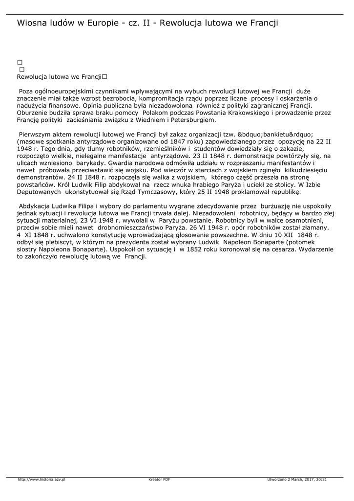 Wiosna ludów w Europie - cz. II - Rewolucja lutowa we Francji Rewolucja lutowa we Francji Poza ogólnoeuropejskimi czynnikami wpływającymi na wybuch rewolucji lutowej we Francji duże znaczenie miał także wzrost bezrobocia, kompromitacja rządu poprzez liczne procesy i oskarżenia o nadużycia finansowe. Opinia publiczna była niezadowolona również z polityki zagranicznej Francji. Oburzenie budziła sprawa braku pomocy Polakom podczas Powstania Krakowskiego i prowadzenie przez Francję polityki zacieśniania związku z Wiedniem i Petersburgiem. Pierwszym aktem rewolucji lutowej we Francji był zakaz organizacji tzw. „bankietu” (masowe spotkania antyrządowe organizowane od 1847 roku) zapowiedzianego przez opozycję na 22 II 1948 r. Tego dnia, gdy tłumy robotników, rzemieślników i studentów dowiedziały się o zakazie, rozpoczęto wielkie, nielegalne manifestacje antyrządowe. 23 II 1848 r. demonstracje powtórzyły się, na ulicach wzniesiono barykady. Gwardia narodowa odmówiła udziału w rozpraszaniu manifestantów i nawet próbowała przeciwstawić się wojsku. Pod wieczór w starciach z wojskiem zginęło kilkudziesięciu demonstrantów. 24 II 1848 r. rozpoczęła się walka z wojskiem, którego część przeszła na stronę powstańców. Król Ludwik Filip abdykował na rzecz wnuka hrabiego Paryża i uciekł ze stolicy. W Izbie Deputowanych ukonstytuował się Rząd Tymczasowy, który 25 II 1948 proklamował republikę. Abdykacja Ludwika Filipa i wybory do parlamentu wygrane zdecydowanie przez burżuazję nie uspokoiły jednak sytuacji i rewolucja lutowa we Francji trwała dalej. Niezadowoleni robotnicy, będący w bardzo złej sytuacji materialnej, 23 VI 1948 r. wywołali w Paryżu powstanie. Robotnicy byli w walce osamotnieni, przeciw sobie mieli nawet drobnomieszczaństwo Paryża. 26 VI 1948 r. opór robotników został złamany. 4 XI 1848 r. uchwalono konstytucję wprowadzającą głosowanie powszechne. W dniu 10 XII 1848 r. odbył się plebiscyt, w którym na prezydenta został wybrany Ludwik Napoleon Bonaparte (potomek siostry Napoleona Bonaparte). Uspokoił on sytuację i w 1852 roku koronował się na cesarza. Wydarzenie to zakończyło rewolucję lutową we Francji. http://www.historia.azv.pl Kreator PDF Utworzono 2 March, 2017, 20:31