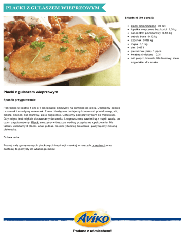 PLACKI Z GULASZEM WIEPRZOWYM Składniki (10 porcji): placki ziemniaczane 30 szt. łopatka wieprzowa bez kości 1,3 kg koncentrat pomidorowy 0,15 kg cebula biała 0,12 kg czosnek 0,06 kg mąka 0,1 kg olej 0,07 l pietruszka (nać) 1 pęcz. kwaśna śmietana 0,3 l sól, pieprz, kminek, liść laurowy, ziele angielskie do smaku Placki z gulaszem wieprzowym Sposób przygotowania: Pokrojoną w kostkę 1 cm x 1 cm łopatkę smażymy na rumiano na oleju. Dodajemy cebulę i czosnek i smażymy razem ok. 2 min. Następnie dodajemy koncentrat pomidorowy, sól, pieprz, kminek, liść laurowy, ziele angielskie. Gotujemy pod przykryciem do miękkości. Gdy mięso jest miękkie doprawiamy do smaku i zagęszczamy zawiesiną z mąki i wody, po czym zagotowujemy. Placki smażymy w tłuszczu według przepisu na opakowaniu. Na talerzu układamy 3 placki, obok gulasz, na nim łyżeczkę śmietanki i posypujemy zieloną pietruszką. Dobra rada: Poznaj całą gamę naszych plackowych inspiracji szukaj w naszych przepisach oraz dostosuj te pomysły do własnego menu! Podane z uśmiechem!