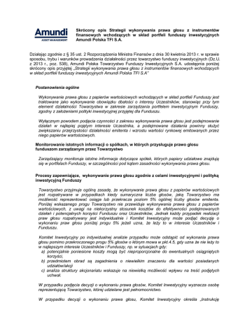 Skrócony opis Strategii wykonywania prawa głosu z instrumentów finansowych wchodzących w skład portfeli funduszy inwestycyjnych Amundi Polska TFI S.A. Działając zgodnie z § 35 ust. 2 Rozporządzenia Ministra Finansów z dnia 30 kwietnia 2013 r. w sprawie sposobu, trybu i warunków prowadzenia działalności przez towarzystwo funduszy inwestycyjnych (Dz.U. z 2013 r., poz. 538), Amundi Polska Towarzystwo Funduszy Inwestycyjnych S.A. udostępnia poniżej skrócony opis przyjętej „Strategii wykonywania prawa głosu z instrumentów finansowych wchodzących w skład portfeli funduszy inwestycyjnych Amundi Polska TFI S.A” Postanowienia ogólne Wykonywanie prawa głosu z papierów wartościowych wchodzących w skład portfeli Funduszy jest traktowane jako wykonywanie obowiązku dbałości o interesy Uczestników, stanowiąc przy tym element działalności Towarzystwa w zakresie zarządzania portfelem inwestycyjnym Funduszy, zgodny z założeniami polityki inwestycyjnej przyjętej dla Funduszu. Wyłącznym powodem podjęcia czynności z zakresu wykonywania prawa głosu jest podejmowanie działań w najlepiej pojętym interesie Uczestnika, a podejmowane działania powinny służyć zwiększaniu przejrzystości działalności emitenta i wzrostu wartości rynkowej emitowanych przez niego papierów wartościowych. Monitorowanie istotnych informacji o spółkach, w których przysługuje prawo głosu funduszom zarządzanym przez Towarzystwo Zarządzający monitoruje istotne informacje dotyczące spółek, których papiery udziałowe znajdują się w portfelach Funduszy, w szczególności pod kątem zasadności wykonywania prawa głosu. Procesy zapewniające, wykonywanie prawa głosu zgodnie z celami inwestycyjnymi i polityką inwestycyjną Funduszy Towarzystwo przyjmuje ogólną zasadę, że wykonywanie prawa głosu z papierów wartościowych jest rozpatrywane w przypadkach kiedy sumaryczna liczba głosów, jaką Towarzystwo ma możliwość reprezentować osiąga lub przekracza poziom 5% ogólnej liczby głosów emitenta. Poniżej wskazanego progu Towarzystwo nie przewiduje wykonywania prawa głosu z papierów wartościowych, z uwagi na niekorzystny stosunek kosztów do efektywności podejmowanych działań i potencjalnych korzyści Funduszu oraz Uczestników, Jednak każdy przypadek realizacji praw głosu rozpatrywany jest indywidualnie i Komitet Inwestycyjny może podjąć decyzję o wykonaniu praw głosu poniżej progu 5% jeżeli uzna, że leży to w interesie Uczestników i Funduszu. Komitet Inwestycyjny po indywidualnej analizie przypadku może odstąpić od wykonania prawa głosu pomimo przekroczonego progu 5% głosów o którym mowa w pkt.4.5, gdy uzna że nie leży to w najlepszym interesie Uczestników i Funduszy, np. w sytuacjach gdy: a) potencjalnie poniesione koszty mogą być nieproporcjonalne do ewentualnych osiągniętych korzyści, b) przedmiotem obrad są zagadnienia o niewielkim znaczeniu dla wartości posiadanych udziałów/akcji c) analiza struktury akcjonariatu wskazuje na niewielką możliwość wpływu na treść podjętych uchwał. W przypadku podjęcia decyzji o wykonaniu prawa głosów, Komitet Inwestycyjny wyznacza osobę reprezentującą Towarzystwo, której udzielane jest pełnomocnictwo. W przypadku decyzji o wykonaniu prawa głosu, Komitet Inwestycyjny określa „Instrukcję głosowania” stanowiącą dla osoby reprezentującej Towarzystwo wiążący dokument określający sposób reprezentowania Towarzystwa i Funduszy. Zapobieganie konfliktom interesów wynikającym z wykonywania prawa głosu oraz zarządzanie zidentyfikowanymi konfliktami interesów Towarzystwo dąży do zapobiegania ewentualnym konfliktom interesów przedkładając jako priorytet działanie w celu ochrony interesów Uczestników. W celu zapobiegania konfliktom interesów, Towarzystwo wprowadza zakaz wykonywania prawa głosu przez pełnomocnika, będącego osobą lub podmiotem, któremu osobiście przysługują prawa głosu tego samego emitenta, lub w stosunku do którego istnieje prawdopodobieństwo zaistnienia powiązań z emitentem mogących budzić konflikt interesów. Towarzystwo dołoży starań w celu nieudzielania takim osobom pełnomocnictw lub odwoływania już udzielonych pełnomocnictw. Postanowienia końcowe Towarzystwo udostępnia Uczestnikowi bezpłatnie, na jego żądanie, szczegółowe informacje na temat sposobu wykonania prawa głosu przysługującemu Funduszowi, którego jest Uczestnikiem, zgodnie z § 35 ust.3 Rozporządzenia.