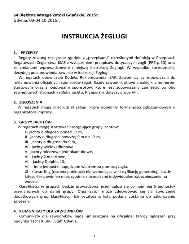 64 Błękitna Wstęga Zatoki Gdańskiej 2015r. Gdynia, 03-04.10.2015r. INSTRUKCJA ŻEGLUGI 1. PRZEPISY Regaty zostaną rozegrane zgodnie z „przepisami” określonymi definicją w Przepisach Regatowych Żeglarstwa ISAF z wyłączeniem przepisów dotyczących żagli (PRŻ p.50) oraz ze zmianami wprowadzonymi niniejszą Instrukcją Żeglugi. W wypadku sprzeczności, decydują postanowienia zawarte w Instrukcji Żeglugi. W regatach obowiązuje Kodeks Reklamowania ISAF. Zawodnicy są zobowiązani do reklamowania oficjalnych sponsorów regat. Każdy zawodnik otrzyma naklejki z numerem startowym oraz z logotypami sponsorów, które jest zobowiązany zamieścić po obu zewnętrznych stronach kadłuba jachtu. Przepis nie dotyczy grupy VIII. 2. ZGŁOSZENIA W regatach mogą brać udział załogi, które dopełniły formalności zgłoszeniowych u organizatora imprezy. 3. GRUPY JACHTÓW W regatach mogą startować następujące grupy jachtów: I - jachty o długości ponad 12 m, II - jachty o długości powyżej 9 m do 12 m, III - jachty o długości do 9 m, IV - jachty wielokadłubowe, V - jachty mieczowe jednokadłubowe, VI - jachty 2 masztowe, VII - jachty Delphia 40, VIII - inne jednostki napędzane wiatrem za pomocą żagla, XI - kitesurfing (osobna punktacja nie wchodząca w klasyfikację generalną), każdy kitesurfer powinien mieć zgodnie z przepisami indywidualne zabezpieczenie na wodzie. Klasyfikacja w grupach będzie prowadzona, jeżeli zgłosi się co najmniej 5 jednostek przynależnych do danej grupy. Organizator może zdecydować się na stworzenie dodatkowych grup klasyfikacji. Ich ostateczna lista podana zostanie po zakończeniu zgłoszeń. 4. KOMUNIKATY DLA ZAWODNIKÓW Komunikaty dla zawodników będą umieszczane na oficjalnej tablicy ogłoszeń przy budynku Yacht Klubu „Stal” Gdynia. 1 5. ZMIANY INSTRUKCJI ŻEGLUGI 5.1 Wszelkie zmiany w instrukcji żeglugi będą wywieszane najpóźniej na jedną godzinę przed startem do wyścigu na oficjalnej tablicy ogłoszeń przy budynku Yacht Klubu „Stal” Gdynia i traktowane będą jako pisemne powiadomienie zawodników. 5.2 Termin rezerwowy (niedziela) zostanie wykorzystany w przypadku ekstremalnie niekorzystnych warunków żeglugi w sobotę. 6. SYGNAŁY PODAWANE NA BRZEGU Flaga „AP” z towarzyszeniem dwóch sygnałów dźwiękowych oznacza: „Wyścig jest odroczony. Sygnał ostrzeżenia będzie podany nie wcześniej niż 45 minut po opuszczeniu flagi „AP”. 7. TRASA 7.1 Trasę regat przedstawia załącznik nr 1 do niniejszej Instrukcji Żeglugi. Pława N-7 na trasie regat, stanowi element toru podejściowego do portu w Gdańsku. Wszyscy uczestnicy regat mają obowiązek przestrzegania przepisów prawa morskiego, w razie konieczności ustępować statkom handlowym i innym jednostkom przemierzającym drogę wzdłuż toru wodnego. 7.2 Jeśli na statku komisji regatowej wywieszona zostanie flaga „O” MKS wraz z sygnałem ostrzeżenia (na 5 minut przed startem), oznacza to, że obowiązywać będzie krótszy wariant trasy (Gdynia-Sopot-Gdynia), bez omijania pławy N-7. Szczegółowy opis skróconego wariantu trasy przedstawia załącznik nr 1 do Instrukcji Żeglugi. 8. SKRÓCENIE TRASY PO STARCIE Przepis 32 PRŻ ISAF, odnośnie skrócenia, stosuje się jak następuje: Komisja Regatowa może skrócić trasę przez wystawienie flagi „S” MKS przy dowolnym znaku kursowym zanim pierwszy jacht okrąży znak, co oznacza: „Ukończ wyścig pomiędzy znakiem trasy a statkiem KS, na którym umieszczona jest flaga „S” MKS”. 9. ZMIANA TRASY PO STARCIE Nie przewiduje się zmiany trasy po starcie, nie stosuje się przepisu 33 PRŻ ISAF. 10. START 10.1 Start do wyścigu, wspólny dla wszystkich grup jachtów nastąpi w dniu 03.10.2015r. (sobota) o godz. 11.00 na redzie Basenu Jachtowego w Gdyni, wg. następującej procedury: - 5 minut do startu - flaga błękitna wstęga w górę (1 sygnał dźwiękowy) - 4 minuty do startu - flaga ‘P’ MKS w górę (1 sygnał dźwiękowy) - Start - flaga ‘YK Stal’ Gdynia w górę (1 sygnał dźwiękowy) Niniejszy punkt zmienia przepis 26 PRŻ. 2 10.2 Sekwencja startu podawana będzie na kanale 77 VHF. 10.3 Jacht musi wystartować nie później niż 20 minut po sygnale startu. 10.4 Linia startu ustawiona będzie prostopadle do linii wiatru i wyznaczona pomiędzy boją pneumatyczną – piramidą koloru żółtoczerwonego po lewej stronie i statkiem KR po prawej stronie. Kierunek wiatru Linia startu Statek KR m/y Demon Kierunek żeglugi po sygnale startu 11. META Linia mety poprowadzona będzie pomiędzy pławą „GS” na jej lewym końcu, a dalbą dewiacyjną na jej prawym końcu. Linia mety zostanie zamknięta o zachodzie słońca, który na dzień 3 października przewidziany jest na godz. 18:18. Jednostki, posiadające radiostacje proszone są o podawanie komisji regatowej na kanale 77 VHF numeru identyfikacyjnego jednostki bezpośrednio przed wejściem na linię mety. Dalba Dewiacyjna Zielona latarnia wejścia południowego Linia mety Marina Gdynia Czerwona pława GS Kierunek żeglowania od boi piramidy w Sopocie do linii mety 12. SYSTEM KAR Za przekroczenie Części 2 PRŻ („Gdy jachty spotykają się”) stosowana będzie kara polegająca na wykonaniu jednego obrotu jachtu (360º), włączając jeden zwrot na wiatr i jeden zwrot z wiatrem. 3 13. PROTESTY 13.1 Jacht zamierzający protestować musi poinformować o tym drugi jacht przy pierwszej nadarzającej się okazji. Gdy protest dotyczy incydentu na akwenie regatowym, w który jacht jest zamieszany lub który widzi musi on krzyknąć "protest" przy pierwszej nadarzającej się okazji. Jeżeli drugi jacht jest poza zasięgiem okrzyku, jacht protestujący nie musi wołać, ale zobowiązany jest poinformować drugi jacht przy pierwszej nadarzającej się okazji. 13.2 Protesty muszą być składane w formie pisemnej na formularzach dostępnych w Biurze Regat i dostarczone tam (wypełnione) w ciągu 40 minut po czasie ukończenia 