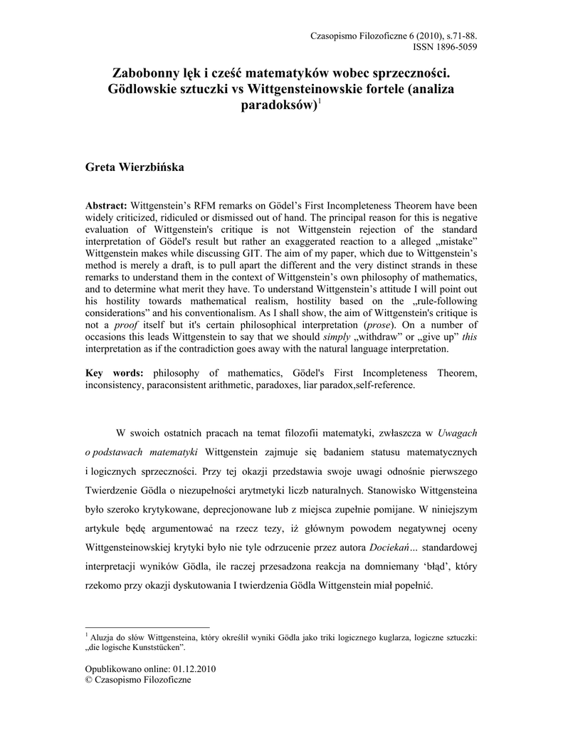 Czasopismo Filozoficzne 6 (2010), s.71-88. ISSN 1896-5059 Zabobonny lęk i cześć matematyków wobec sprzeczności. Gödlowskie sztuczki vs Wittgensteinowskie fortele (analiza paradoksów)1 Greta Wierzbińska Abstract: Wittgenstein’s RFM remarks on Gödel’s First Incompleteness Theorem have been widely criticized, ridiculed or dismissed out of hand. The principal reason for this is negative evaluation of Wittgenstein's critique is not Wittgenstein rejection of the standard interpretation of Gödel's result but rather an exaggerated reaction to a alleged „mistake” Wittgenstein makes while discussing GIT. The aim of my paper, which due to Wittgenstein’s method is merely a draft, is to pull apart the different and the very distinct strands in these remarks to understand them in the context of Wittgenstein’s own philosophy of mathematics, and to determine what merit they have. To understand Wittgenstein’s attitude I will point out his hostility towards mathematical realism, hostility based on the „rule-following considerations” and his conventionalism. As I shall show, the aim of Wittgenstein's critique is not a proof itself but it's certain philosophical interpretation (prose). On a number of occasions this leads Wittgenstein to say that we should simply „withdraw” or „give up” this interpretation as if the contradiction goes away with the natural language interpretation. Key words: philosophy of mathematics, Gödel's First Incompleteness Theorem, inconsistency, paraconsistent arithmetic, paradoxes, liar paradox,self-reference. W swoich ostatnich pracach na temat filozofii matematyki, zwłaszcza w Uwagach o podstawach matematyki Wittgenstein zajmuje się badaniem statusu matematycznych i logicznych sprzeczności. Przy tej okazji przedstawia swoje uwagi odnośnie pierwszego Twierdzenie Gödla o niezupełności arytmetyki liczb naturalnych. Stanowisko Wittgensteina było szeroko krytykowane, deprecjonowane lub z miejsca zupełnie pomijane. W niniejszym artykule będę argumentować na rzecz tezy, iż głównym powodem negatywnej oceny Wittgensteinowskiej krytyki było nie tyle odrzucenie przez autora Dociekań… standardowej interpretacji wyników Gödla, ile raczej przesadzona reakcja na domniemany ‘błąd’, który rzekomo przy okazji dyskutowania I twierdzenia Gödla Wittgenstein miał popełnić. 1 Aluzja do słów Wittgensteina, który określił wyniki Gödla jako triki logicznego kuglarza, logiczne sztuczki: „die logische Kunststücken”. Opublikowano online: 01.12.2010 © Czasopismo Filozoficzne Greta Wierzbińska 72 Celem mojego artykułu, który, zgodnie z zamysłem filozofii Wittgensteina, ma pełnić jedynie rolę szkicu, zestawu ‘przypomnień gromadzonych dla określonego celu’ jest próba analizy znaczenia różnych odrębnych aspektów Wittgensteinowskiego stanowiska, przeprowadzona w kontekście jego filozofii matematyki. W toku rozważań będę próbowała wykazać ścisły związek awersji autora Traktatu… wobec matematycznego platonizmu z rozważaniami na temat ‘kierowania się regułą’. Spróbuję w jakimś stopniu zbadać kwestię dość łagodnego stanowiska Wittgensteina w sprawie sprzeczności jako możliwej konsekwencji radykalnego konwencjonalizmu Wittgensteina w sprawie prawd logiki i matematyki. Postaram się również pokazać, iż to nie tyle sam dowód ile jego pewna interpretacja (prose) stanowiły cel Wittgensteinowskiej krytyki. Pokrótce omówię także Wittgensteinowskie stanowisko z pozycji paradygmatu logik parakonsystentnych oraz postaram się wykazać, iż uznanie zdania Gödla za standardowy paradoks (w rodzaju zdania kłamcy), stanowiło niejako naturalną konsekwencję odrzucenia przez Wittgensteina rozróżnienia między teorią a metateorią. Na koniec przedyskutuję filozoficzne i historyczne znaczenie Wittgensteinowskiego stanowiska w sprawie twierdzenia Gödla porównując je z koncepcjami zaproponowanymi przez Tarskiego, Heijenoorta, Floyd czy Putnama. Są w dziejach filozofii myśli przepastne, a więc z jednej strony do dziś zadziwiające, z drugiej takie, iż czuje się, że „coś w nich jest” – nawet jeśli nie potrafi się powiedzieć co. Uznanie myśli za przepastną, nie zaś za mętną wymaga przyjęcia przez interpretatora sformułowanej przez Ajdukiewicza-Davidsona dyrektywy życzliwości interpretacyjnej, w myśl której należy przyglądać się cudzym myślom w sposób możliwie wolny od stereotypów. Pojawiające się w Uwagach o podstawach matematyki wypowiedzi Wittgensteina negujące znaczenie pierwszego twierdzenia Gödla (o nierozstrzygalności arytmetyki liczb naturalnych) na gruncie filozofii matematyki są przez większość podejmujących ten temat autorów bagatelizowane2. Kreisel, Dummett, czy Bernays traktują je jako niefortunny epizod w karierze wielkiego filozofa, który padł ofiarą błędnej interpretacji zasadniczej idei leżącej u podstaw Gödlowskiego programu, lub, jak kto, woli fatalnego nieporozumienia. Komentatorzy ci zwracali uwagę na fakt, iż ową należącą do systemu formalnego nierozstrzygalną Gödlowską formułę G1 traktował Wittgenstein jako zdanie 2 Nawet tak gorący zwolennik filozofii Wittgensteina jak M. Dummett wyraża w jednej ze swych prac opinię, że jego (Wittgensteina) uwagi na temat twierdzenia Gödla i pojęcia niesprzeczności są „kiepskiej jakości i zawierają błędy”. Zabobonny lęk i cześć matematyków wobec sprzeczności 73 antynomialne, nie różniące się z grubsza od zdania kłamcy, zaś przeprowadzony przez Gödla dowód jako prostą dedukcję sprzeczności3. Wyjątkami są tu m.in. (życzliwie objaśniająca stanowisko autora Traktatu, jedna z najbardziej skrupulatnie napisanych prac) rozprawa Stuarta Shankera. „Wittgenstein remarks on Gödel’s theorem” zamieszczona w pracy Gödel’s theorem in focus (1988) oraz artykuł Juliet Floyd „On Saying What You Really Want To say: Wittgenstein, Gödel, and 