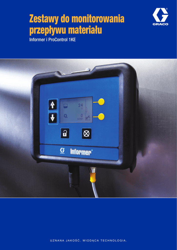 Zestawy do monitorowania przepływu materiału Informer i ProControl 1KE UZNANA JAKOŚĆ. WIODĄCA TECHNOLOGIA. Ekonomiczne rozwiązanie do pomiaru materiałów zmniejszające ilość marnowanej farby Systemy Informer i ProControl 1KE to łatwe w użyciu zestawy do monitorowania materiału, które pozwalają na dokładny pomiar natężenia przepływu i jego regulację, a także na monitorowanie ilości materiału przepływającego przez przewody materiałowe, znacznie usprawniając proces wykańczenia. Niezawodne informacje i sterowanie Konstrukcja wewnętrznych systemów monitorowania materiału firmy Graco pozwala oszczędzić czas i pieniądze. System Informer służy do monitorowania materiałów, a system ProControl 1KE umożliwia zarządzanie nimi. Najważniejsze elementy obu produktów charakteryzują się sprawdzoną niezawodnością firmy Graco. Czytelny wyświetlacz Alarm dotyczący konserwacji Umożliwia śledzenie i monitorowanie natężenia przepływu oraz dziennego, tygodniowego, miesięcznego lub rocznego zużycia farby. Informuje użytkownika o konieczności przeprowadzenia konserwacji urządzenia. Ochrona przy użyciu numeru PIN Suma zbiorcza Informacje o łącznej ilości materiału na potrzeby śledzenia zadania. Zapobiega wprowadzaniu nieautoryzowanych zmian w ustawieniach. Główne zastosowania •Ręczna obróbka wykończeniowa •Automatyczna obróbka wykończeniowa • Mierzenie rozpuszczalnika •Dozowanie pojedynczego materiału 2 Kluczowe branże • Automatyczne podajniki •Samochody ciężarowe i autobusy • Branża motoryzacyjna • Rolnictwo i budownictwo • Lotnictwo • Branża meblarska Monitorowanie materiałów i ulepszone procesy wykańczania Informer Dokładne monitorowanie użycia materiału oraz gromadzenie ważnych informacji operacyjnych na potrzeby analizy kosztów, raportowania i ulepszania procesów. Łatwa obsługa, wydajność i oszczędność pieniędzy dzięki zmniejszeniu ilości marnowanej farby. Łatwość Wydajność Produktywność Dokładne raportowanie Łatwe gromadzenie dokładnych danych o zużyciu materiału na potrzeby tworzenia raportów zgodności z wymogami środowiskowymi. Mniejsza ilość zmarnowanej farby Monitorowanie natężeń przepływu umożliwia zidentyfikowanie zużytych dysz pistoletów natryskowych lub wykrycie problemów z kalibracją, dzięki czemu marnuje się mniej farby, a koszty są mniejsze. Oszczędność czasu i pieniędzy Szybka i skuteczna kalibracja pistoletów natryskowych pozwala uniknąć strat podczas natrysku lub sytuacji, w której natryskiwanie jest niewystarczające, dzięki czemu można oszczędzić czas i pieniądze. Dostęp w biurze lub dostęp zdalny Opcjonalny zaawansowany interfejs sieciowy (Advanced Web Interface, AWI) umożliwia gromadzenie danych w biurze i poza nim. Osłona odporna na rozpuszczalniki Trwała osłona jest odporna na działanie rozpuszczalników Dotykowe przyciski sterowania Można wybrać odczyt lub tempo programu, limity oraz inne funkcje zarządzania Światłowodowy port komunikacyjny Umożliwia przesyłanie danych między systemami Informer oraz interfejsem AWI lub sterownikiem PLC Przepływomierz precyzyjny G3000 Umożliwia pomiar ilości oraz przepływu materiałów (dostępne są także inne modele) 3 Zarządzanie materiałami zapewnia większą wydajność natryskiwania ProControl 1KE Aktywne zarządzanie materiałem i ciśnieniem powietrza umożliwia precyzyjne ustawianie parametrów natryskiwania. System ProControl 1KE przypomina system Informer, jednak nie tylko monitoruje materiały, ale także pozwala na zarządzanie nimi oraz zwiększenie wydajności natryskiwania. Precyzyjne sterowanie Łatwa regulacja Dokładne raportowanie Ciecz Zarządzenie ciśnieniem lub natężeniem przepływu materiału wykończenia zapobiega stratom podczas natrysku oraz marnowaniu materiału. Ciśnienie i natężenie przepływu Ciśnieniem natryskiwania lub natężeniem przepływu można zarządzać, zwiększając lub zmniejszając otwór regulatora materiału. Rozpylające powietrze Zarządzenie powietrzem strumienia pozwala uzyskać równe wykończenie wysokiej jakości. Wstępnie ustawiony limit górny i dolny umożliwiają operatorowi regulację wydajności w granicach tych limitów lub całkowite zablokowanie tego ustawienia. Zużycie materiału Łatwe gromadzenie danych o zużyciu materiału na potrzeby tworzenia raportów zgodności z wymogami środowiskowymi przy użyciu urządzeń sterujących cieczą. Wyświetlacz do zarządzania materiałem Łatwe przeglądanie oraz ustawianie dokładnych informacji dotyczących ciśnienia i natężenia przepływu Precyzyjne I/P Służy do ustawiania regulatora materiału lub sterowania ciśnieniem powietrza rozpylającego Regulator materiału Wybierz regulator małych przepływów firmy Graco lub inny regulator materiału sterowany powietrzem odpowiedni do wymagań natryskiwania Przetwornik ciśnienia Udostępnia dokładne informacje o wychodzącym ciśnieniu materiału 4 Zdalne monitorowanie wszystkich materiałów w sieci firmowej Zaawansowany interfejs sieciowy (AWI) Łatwy dostęp i raportowanie Interfejs przeglądarki internetowej pozwala na szybkie gromadzenie informacji na potrzeby tworzenia raportów zgodności z wymogami środowiskowymi oraz na dostęp z biura lub lokalizacji zdalnej. Mniej błędów operatora Wstępnie ustawione górne i dolne limity natężenia przepływu i ciśnienia materiału umożliwiają operatorowi odpowiednie ustawienie wydajności. Śledzenie danych Możliwość skonfigurowania i śledzenia użycia z biura lub po zalogowaniu się ze zdalnej lokalizacji • Możliwość śledzenia systemów ProMix 2KS znajdujących się w tej samej sieci • Ekran konfiguracji zaawansowanego interfejsu sieciowego (AWI) Interfejs sterownika PLC protokołu ModBus Wysyłanie informacji o ilości materiału i jego przepływie do sterownika PLC • Integracja informacji o materiale ze zautomatyzowanym procesem • Ster