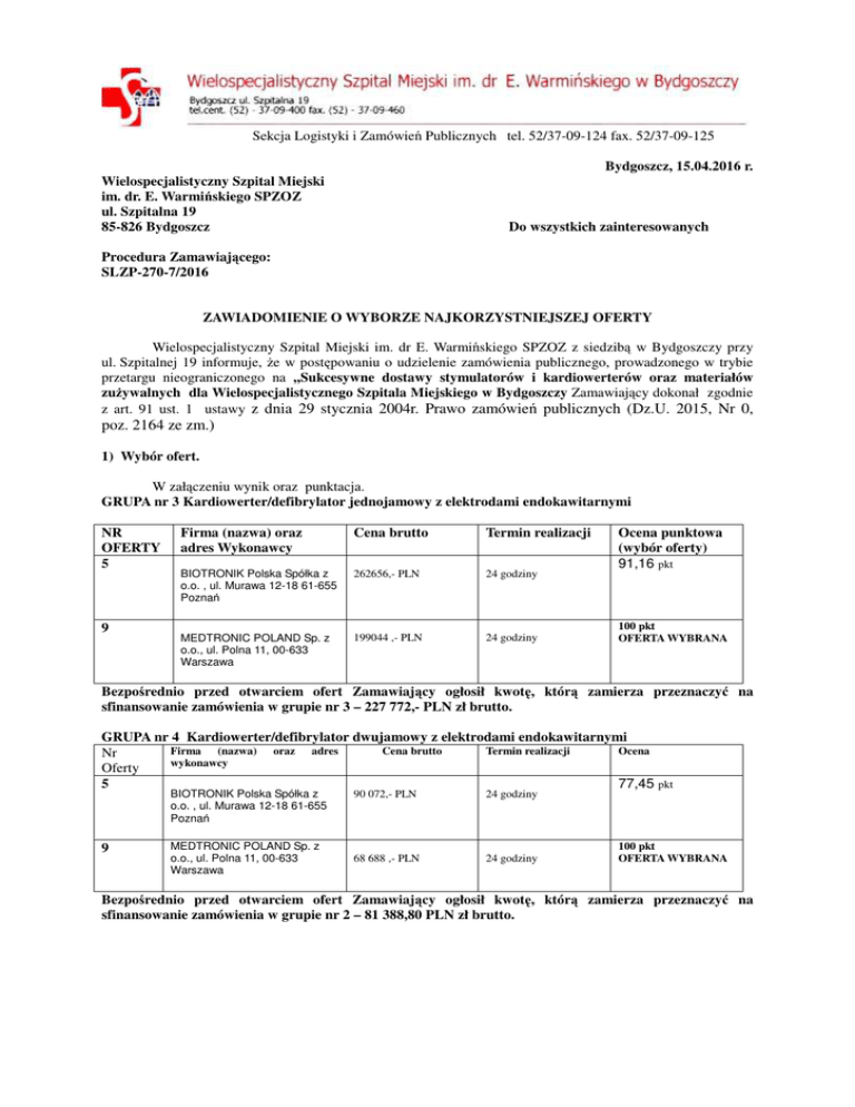 Sekcja Logistyki i Zamówień Publicznych tel. 52/37-09-124 fax. 52/37-09-125 Bydgoszcz, 15.04.2016 r. Wielospecjalistyczny Szpital Miejski im. dr. E. Warmińskiego SPZOZ ul. Szpitalna 19 85-826 Bydgoszcz Do wszystkich zainteresowanych Procedura Zamawiającego: SLZP-270-7/2016 ZAWIADOMIENIE O WYBORZE NAJKORZYSTNIEJSZEJ OFERTY Wielospecjalistyczny Szpital Miejski im. dr E. Warmińskiego SPZOZ z siedzibą w Bydgoszczy przy ul. Szpitalnej 19 informuje, że w postępowaniu o udzielenie zamówienia publicznego, prowadzonego w trybie przetargu nieograniczonego na ,,Sukcesywne dostawy stymulatorów i kardiowerterów oraz materiałów zużywalnych dla Wielospecjalistycznego Szpitala Miejskiego w Bydgoszczy Zamawiający dokonał zgodnie z art. 91 ust. 1 ustawy z dnia 29 stycznia 2004r. Prawo zamówień publicznych (Dz.U. 2015, Nr 0, poz. 2164 ze zm.) 1) Wybór ofert. W załączeniu wynik oraz punktacja. GRUPA nr 3 Kardiowerter/defibrylator jednojamowy z elektrodami endokawitarnymi NR OFERTY 5 9 Firma (nazwa) oraz adres Wykonawcy Cena brutto Termin realizacji BIOTRONIK Polska Spółka z o.o. , ul. Murawa 12-18 61-655 Poznań 262656,- PLN 24 godziny MEDTRONIC POLAND Sp. z o.o., ul. Polna 11, 00-633 Warszawa 199044 ,- PLN 24 godziny Ocena punktowa (wybór oferty) 91,16 pkt 100 pkt OFERTA WYBRANA Bezpośrednio przed otwarciem ofert Zamawiający ogłosił kwotę, którą zamierza przeznaczyć na sfinansowanie zamówienia w grupie nr 3 – 227 772,- PLN zł brutto. GRUPA nr 4 Kardiowerter/defibrylator dwujamowy z elektrodami endokawitarnymi Firma (nazwa) oraz adres Cena brutto Termin realizacji Ocena Nr wykonawcy Oferty 5 77,45 pkt BIOTRONIK Polska Spółka z o.o. , ul. Murawa 12-18 61-655 Poznań 9 MEDTRONIC POLAND Sp. z o.o., ul. Polna 11, 00-633 Warszawa 90 072,- PLN 24 godziny 68 688 ,- PLN 24 godziny 100 pkt OFERTA WYBRANA Bezpośrednio przed otwarciem ofert Zamawiający ogłosił kwotę, którą zamierza przeznaczyć na sfinansowanie zamówienia w grupie nr 2 – 81 388,80 PLN zł brutto. GRUPA nr 5 Zestaw do nakłucia naczyń żylnych i wprowadzania elektrod endokawitarnych Nr Oferty Firma (nazwa) oraz adres wykonawcy 4 Zakład Tworzyw Sztucznych "HAGMED" Zając i Tomaszewski sp.j. ul. Tomaszowska 32 96-200 Rawa Mazowiecka 5 8 BIOTRONIK Polska Spółka z o.o. , ul. Murawa 12-18 61-655 Poznań Cena brutto Termin realizacji Ocena 8 391,60 PLN 24 godziny 100 pkt OFERTA WYBRANA 10 206,- PLN Agencja Naukowo-Techniczna Symico sp. z o.o. ul. Powstanców Śląskich 54a/2 53-333 Wrocław 10 382,90 PLN 83,11 pkt 24 godziny 81,78 pkt 24 godziny Bezpośrednio przed otwarciem ofert Zamawiający ogłosił kwotę, którą zamierza przeznaczyć na sfinansowanie zamówienia w Grupie nr 5 - 8 618,40PLN zł brutto. Grupa 8 Mikrocewniki przedłużające Firma (nazwa) oraz Nr Oferty 8 adres wykonawcy Comesa Poland ul. Wolińska 4 03-699 Warszawa Cena brutto 3 456,- PLN Termin realizacji Ocena 2 dni 100 pkt OFERTA WYBRANA Bezpośrednio przed otwarciem ofert Zamawiający ogłosił kwotę, którą zamierza przeznaczyć na sfinansowanie zamówienia w Grupie nr 8 - 3 456,- zł brutto. Grupa 10 Cewniki do aspiracji skrzeplin Firma (nazwa) oraz adres wykonawcy Nr Oferty 3 5 9 BILLMED Sp. z o.o. , ul. Krypska 24 , 04082 Warszawa BIOTRONIK Polska Spółka z o.o. , ul. Murawa 12-18 61-655 Poznań MEDTRONIC POLAND Sp. z o.o., ul. Polna 11, 00-633 Warszawa Cena brutto 10 860,48 PLN 14.256,- PLN Termin realizacji Ocena 1 dzień 100 pkt OFERTA WYBRANA 2 dni 74,87 pkt 3 dni 63,96 pkt 16 562,88 PLN Bezpośrednio przed otwarciem ofert Zamawiający ogłosił kwotę, którą zamierza przeznaczyć na sfinansowanie zamówienia w Grupie nr 10 - 10 860,48 zł brutto. GRUPA 11 Cewniki do kontrapulsacji wewnątrzaortalnej Firma (nazwa) oraz adres wykonawcy Cena brutto Nr Oferty 10 MAQUET Polska Sp. z o.o. ul. Osmańska 14 02-823 Warszawa Termin realizacji Ocena 3 dni 100 pkt Oferta wybrana 4320 PLN Bezpośrednio przed otwarciem ofert Zamawiający ogłosił kwotę, którą zamierza przeznaczyć na sfinansowanie zamówienia w Grupie nr 11 - 4320 zł brutto. Grupa nr 13 Prowadniki do badań FFR Firma (nazwa) oraz adres wykonawcy Nr Oferty 1 VOLCANO Europe BVBA/SPRL Excelsiorlaan, 41 1930 Zaventem, Belgia Cena brutto 125.120 ,-PLN Termin realizacji Ocena 3 dni 100 pkt OFERTA WYBRANA Bezpośrednio przed otwarciem ofert Zamawiający ogłosił kwotę, którą zamierza przeznaczyć na sfinansowanie zamówienia w Grupie nr 13 – 135 129,60 zł brutto. Wybrani Wykonawcy w poszczególnych grupach złożyli najkorzystniejszą ofertę i uzyskał maksymalną liczbę punktów w kryterium cena i termin dostawy. 2) Unieważnienie postępowania. Zamawiający informuje o unieważnieniu postępowania w grupie : GRUPIE 2,6,7,9,12,14,15 – art. 93 ust. 1 pkt 5 ustawy Prawo zamówień publicznych -cena najkorzystniejszej oferty lub oferta z najniższą ceną przewyższa kwotę, którą zamawiający zamierza przeznaczyć na sfinansowanie zamówienia, chyba że zamawiający może zwiększyć tę kwotę do ceny najkorzystniejszej oferty GRUPIE 1 – art. 93 ust. 1 pkt 1 ustawy Prawo zamówień publicznych nie złożono żadnej oferty niepodlegającej odrzuceniu albo nie wpłynął żaden wniosek o dopuszczenie do udziału w postępowaniu od wykonawcy niepodlegającego wykluczeniu Umowa w Grupie 3,4,5,10 zostanie zawarta na podstawie art. 94 ust.1 pkt 1 ustawy z dnia 29 stycznia 2004r. Prawo zamówień publicznych (Dz.U. 2015, Nr 0, poz 2164 ze zm.). Umowa w Grupie 8,11,13 zostanie zawarta niezwłocznie na podstawie art. 94 ust.2 pkt 1 litera a ustawy z dnia 29 stycznia 2004r. Prawo zamówień publicznych (Dz.U. 2015, Nr 0, poz 2164 ze zm.) Dziękujemy za udział w postępowaniu. Zamawiający
