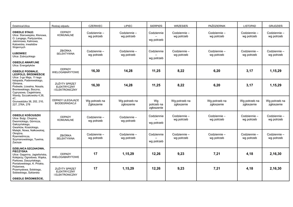 Dzielnica/Ulica OSIEDLE STAŁE: Ulice: Starowiejska, Klonowa, O. Langego, Partyzantów, Jaśminowa, Kalinowa, Katowicka, inwalidów Wojennych ŁUBOWIEC Ulica: Zubrzyckiego Rodzaj odpadu CZERWIEC LIPIEC SIERPIEŃ WRZESIEŃ PAŹDZIERNIK LISTOPAD GRUDZIEŃ ODPADY KOMUNALNE Codziennie – wg potrzeb Codziennie – wg potrzeb Codziennie – wg potrzeb Codziennie – wg potrzeb Codziennie – wg potrzeb Codziennie – wg potrzeb Codziennie – wg potrzeb ZBIÓRKA SELEKTYWNA Codziennie – wg potrzeb Codziennie – wg potrzeb Codziennie – wg potrzeb Codziennie – wg potrzeb Codziennie – wg potrzeb Codziennie – wg potrzeb Codziennie – wg potrzeb ODPADY WIELOGABARYTOWE 16,30 14,28 11,25 8,22 6,20 3,17 1,15,29 ZUŻYTY SPRZĘT ELEKTRYCZNY I ELEKTRONICZNY 16,30 14,28 11,25 8,22 6,20 3,17 1,15,29 ODPADY ULEGAJĄCE BIODEGRADACJI Wg potrzeb na Zgłoszenie Wg potrzeb na zgłoszenie Wg potrzeb na zgłoszenie Wg potrzeb na zgłoszenie Wg potrzeb na zgłoszenie Wg potrzeb na zgłoszenie Wg potrzeb na zgłoszenie ODPADY KOMUNALNE Codziennie – wg potrzeb Codziennie – wg potrzeb Codziennie – wg potrzeb Codziennie – wg potrzeb Codziennie – wg potrzeb Codziennie – wg potrzeb Codziennie – wg potrzeb ZBIÓRKA SELEKTYWNA Codziennie – wg potrzeb Codziennie – wg potrzeb Codziennie – wg potrzeb Codziennie – wg potrzeb Codziennie – wg potrzeb Codziennie – wg potrzeb Codziennie – wg potrzeb ODPADY WIELOGABARYTOWE 17 1,15,29 12,26 9,23 7,21 4,18 2,16,30 ZUŻYTY SPRZĘT ELEKTRYCZNY I ELEKTRONICZNY 17 1,15,29 12,26 9,23 7,21 4,18 2,16,30 OSIEDLE AWARYJNE Ulica: Energetyków OSIEDLE PODWALE, LEOPOLD, ŚRÓDMIEŚCIE Ulice: 3-go Maja, 11-tego listopada, Paderewskiego, Gliniana, Podwale, Licealna, Nosala, Broniewskiego, Boczna, Cyprysowa, Cegielniana, Wandy, Szczakowska 4,38, 47, Grunwaldzka 38, 202, 210, 227, 276A, 278 OSIEDLE KOŚCIUSZKI Ulice: Bulgi, Chopina, Dwornickiego, Górnicza, Gałczyńskiego, Gwarków, Krasickiego, Matejki, Nowa, Nałkowskiej, Okrężna, Rzemieślnicza, Szymanowskiego, Tuwima, Zacisze DZIELNICA SZCZAKOWA, PIECZYSKA Ulice: Gagarina, Jagiellońska, Kolejarzy, Ogrodowa, Wąska, Parkowa, Daszyńskiego, Poniatowskiego, K. Pniaka, Pożarowa, Przemysłowa, Solskiego, Sobieskiego, Szklarska OSIEDLE ŚRÓDMIEŚCIE, WARPIE, AZOT Ulice: Św. Wojciecha, Północna, Chełmońskiego, Mickiewicza, Zalipie, Skowronków, Urzędnicza, Olszewskiego, Insurekcji Kościuszkowskiej, Partyki, Sportowa, Różana, Wrzosowa, Azot, Młyńska 2-4, Chopina 97, Sulińskiego ODPADY ULEGAJĄCE BIODEGRADACJI Wg potrzeb na Zgłoszenie Wg potrzeb na Zgłoszenie Wg potrzeb na Zgłoszenie Wg potrzeb na Zgłoszenie Wg potrzeb na Zgłoszenie Wg potrzeb na Zgłoszenie Wg potrzeb na Zgłoszenie OSIEDLE PODŁĘŻE Ulice: Al. Piłsudskiego, Brodzińskiego, Fredry, Leśna, Ławczana, Grunwaldzka 215, 229, Towarowa, Wilcza OSIEDLE GIGANT Ulice: Bursztynowa, Granitowa, Piekarska, Złota, Tęczowa ODPADY KOMUNALNE Codziennie – wg potrzeb Codziennie – wg potrzeb Codziennie – wg potrzeb Codziennie – wg potrzeb Codziennie – wg potrzeb Codziennie – wg potrzeb Codziennie – wg potrzeb ZBIÓRKA SELEKTYWNA Codziennie – wg potrzeb Codziennie – wg potrzeb Codziennie – wg potrzeb Codziennie – wg potrzeb Codziennie – wg potrzeb Codziennie – wg potrzeb Codziennie – wg potrzeb ODPADY WIELOGABARYTO WE 23 7,21 4,18 1,15,29 13,27 10,24 8,22 ZUŻYTY SPRZĘT ELEKTRYCZNY I ELEKTRONICZNY 23 7,21 4,18 1,15,29 13,27 10,24 8,22 ODPADY ULEGAJĄCE BIODEGRADACJI Wg potrzeb na Zgłoszenie Wg potrzeb na Zgłoszenie Wg potrzeb na Zgłoszenie Wg potrzeb na Zgłoszenie Wg potrzeb na Zgłoszenie Wg potrzeb na Zgłoszenie Wg potrzeb na Zgłoszenie