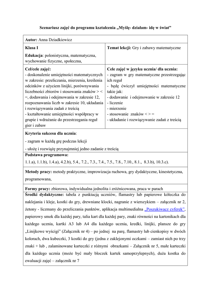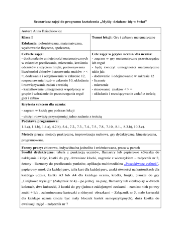 Scenariusz zajęć do programu kształcenia „Myślę- działam- idę w świat” Autor: Anna Dziadkiewicz Klasa I Temat lekcji: Gry i zabawy matematyczne Edukacja: polonistyczna, matematyczna, wychowanie fizyczne, społeczna, Cel/cele zajęć: - doskonalenie umiejętności matematycznych w zakresie: przeliczania, mierzenia, kreślenia odcinków z użyciem linijki, porównywania liczebności zbiorów i stosowania znaków > < =, dodawania i odejmowania w zakresie 12, rozpoznawania liczb w zakresie 10, układania i rozwiązywania zadań z treścią - kształtowanie umiejętności współpracy w grupie i wdrażanie do przestrzegania reguł gier i zabaw Cele zajęć w języku ucznia/ dla ucznia: - zagram w gry matematyczne przestrzegając ich reguł - będę ćwiczył umiejętności matematyczne takie jak: - dodawanie i odejmowanie w zakresie 12 - liczenie - mierzenie - stosowanie znaków < > = - układanie i rozwiązywanie zadań z treścią Kryteria sukcesu dla ucznia: - zagram w każdą grę podczas lekcji - ułożę i rozwiążę przynajmniej jedno zadanie z treścią Podstawa programowa: 1.1.a), 1.1.b), 1.4.a), 4.2.b), 5.4., 7.2., 7.3., 7.4., 7.5., 7.8., 7.10., 8.1., 8.3.b), 10.3.c). Metody pracy: metody praktyczne, improwizacja ruchowa, gry dydaktyczne, kinestetyczna, programowana, Formy pracy: zbiorowa, indywidualna jednolita i zróżnicowana, praca w parach Środki dydaktyczne: tabela z punktacją uczniów, flamastry lub papierowe kółeczka do naklejania i kleje, kostki do gry, drewniane klocki, nagranie z wierszykiem – załącznik nr 2, żetony - liczmany do przeliczania punktów, aplikacja multimedialna „Poszukiwacz cyferek”, papierowy smok dla każdej pary, talia kart dla każdej pary, znaki równości na kartonikach dla każdego ucznia, kartki A3 lub A4 dla każdego ucznia, kredki, linijki, plansze do gry „Linijkowe wyścigi” (Załącznik nr 4) – po jednej na parę, flamastry lub cienkopisy w dwóch kolorach, dwa kubeczki, 3 kostki do gry (jedna z zaklejonymi oczkami – zamiast nich po trzy znaki + lub , zalaminowane karteczki z różnymi obrazkami – Załącznik nr 5, małe karteczki dla każdego ucznia (może być mały bloczek kartek samoprzylepnych), duża kostka do ewaluacji zajęć – załącznik nr 7 Przebieg zajęć Działania uczniów 1. Witają się i poznają zasady turnieju Matematycznego. „Drogowskazy” -wskazówki i uwagi o realizacji Nauczyciel wita się z uczniami i informuje, że w tym dniu odbędzie się turniej matematyczny. Będą w nim brali udział wszyscy uczniowie. Aby otrzymać trofeum SUPER MATEMATYKA będą musieli zdobyć minimum (najmniej) 5 punktów. Po jednym za udział w każdej z zabaw matematycznych. Najwięcej będzie można zdobyć 8 punktów, wtedy gdy w 3 z zabaw dany uczeń zwycięży. Wyniki po każdej zabawie uczniowie będą przyznawać sobie sami na klasowej tabeli wyników w postaci przyklejanych lub malowanych kropek, które na koniec zostaną zliczone – załącznik nr 1 Centra Aktywnej Edukacji matematycznoprzyrodnicze Każda konkurencja będzie dotyczyła innej umiejętności matematycznej. Nauczyciel zaznajamia uczniów z celami lekcji poprzez ujawnienie maksymalnej liczby punktów do zdobycia i umiejętności, które będą wykorzystywane podczas kolejnych gier i zabaw. Zwraca również uwagę na to, by uczniowie grali uczciwie i pamiętali, że podczas gier doskonalą umiejętności matematyczne, a nie rywalizują o lepszą ocenę – nagrodą jest odznaka SUPER MATEMATYKA. 2. Przelicza oczka na kostce i ustawia taką samą liczbę klocków. matematycznoGra nr 1 Nauczyciel dobiera uczniów w pary na przyrodnicze zasadzie losowania. Może to być losowanie patyczków z imionami uczniów lub par kartoników z takimi samymi obrazkami. Każda para otrzymuje kostkę do gry i ok 30 klocków drewnianych. Zadaniem uczniów jest naprzemienne rzucanie kostką, przeliczanie oczek i ustawianie wieży o takiej samej liczbie klocków. W następnych kolejkach klocki są ustawiane na poprzednio ustawionych klockach. Runda trwa do momentu, gdy jedna z wież upadnie. Zwycięża uczeń, którego wieże trzy razy najdłużej się utrzymają. Maksymalna liczba punktów uzyskania w tej grze – 2 pkt. do artystyczno-ruchowe 3. Mówią wierszyk i Przed przystąpieniem do kolejnej zabawy inscenizują go nauczyciel uczy dzieci wierszyka. według własnego Załącznik nr 2 pomysłu. Dzieci powtarzają za nauczycielem i nagraniem, a następnie próbują interpretować tekst wymyślonymi przez siebie gestami i ruchami. 4. Przeliczają elementy i porównują liczebność zbiorów stosując znak większości, mniejszości lub równości. matematycznoGra nr 2 Do tej zabawy uczniowie również są dobrani przyrodnicze w pary. Warto jednak zmienić pary. Każda para otrzymuje wykonanego wcześniej smoka (można wykonać takie smoki z dziećmi podczas zajęć plastycznych) – przykład wykonania smoka – załącznik nr 3, talię kart (z talii należy wyjąć wszystkie figury, asy i dżokery) oraz dwa kartoniki ze znakiem równości. Przed rozpoczęciem gry każdy gracz otrzymuje kartę ze znakiem równości. Karty należy rozdzielić równo pomiędzy dwóch uczniów. Będą oni jednocześnie wykładać na stolik po jednej karcie. Głównym zadaniem jest skierowanie otwartej paszczy smoka w tą stronę, z której znajduje się karta z większą liczbą. Smoka zaczyna ustawiać ten gracz, który przed rozpoczęciem gry wyłoży kartę z większą liczbą. Uczniowie na przemian układają smoka w odpowiednią stronę. Za każde prawidłowe ułożenie smoka uczeń otrzymuje punkt - żeton. Jeżeli zaistnieje sytuacja, w której po obu stronach smoka znajdą się karty z tą samą liczbą, punkt – żeton zdobywa uczeń, który jako pierwszy położy pomiędzy tymi kartami znak równości. Gra kończy się gdy gracze pozbędą się wszystkich kart. Wówczas następuje zliczanie punktów- żetonów. Do tabeli uczniowie wpisują 1 punkt za uczest