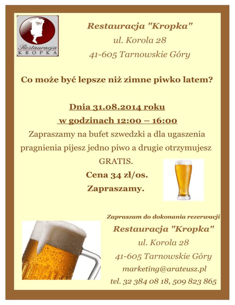 Restauracja "Kropka" ul. Korola 28 41-605 Tarnowskie Góry Co może być lepsze niż zimne piwko latem? Dnia 31.08.2014 roku w godzinach 12:00 – 16:00 Zapraszamy na bufet szwedzki a dla ugaszenia pragnienia pijesz jedno piwo a drugie otrzymujesz GRATIS. Cena 34 zł/os. Zapraszamy. Zapraszam do dokonania rezerwacji Restauracja "Kropka" ul. Korola 28 41-605 Tarnowskie Góry [email protected] tel. 32 384 08 18, 509 823 865