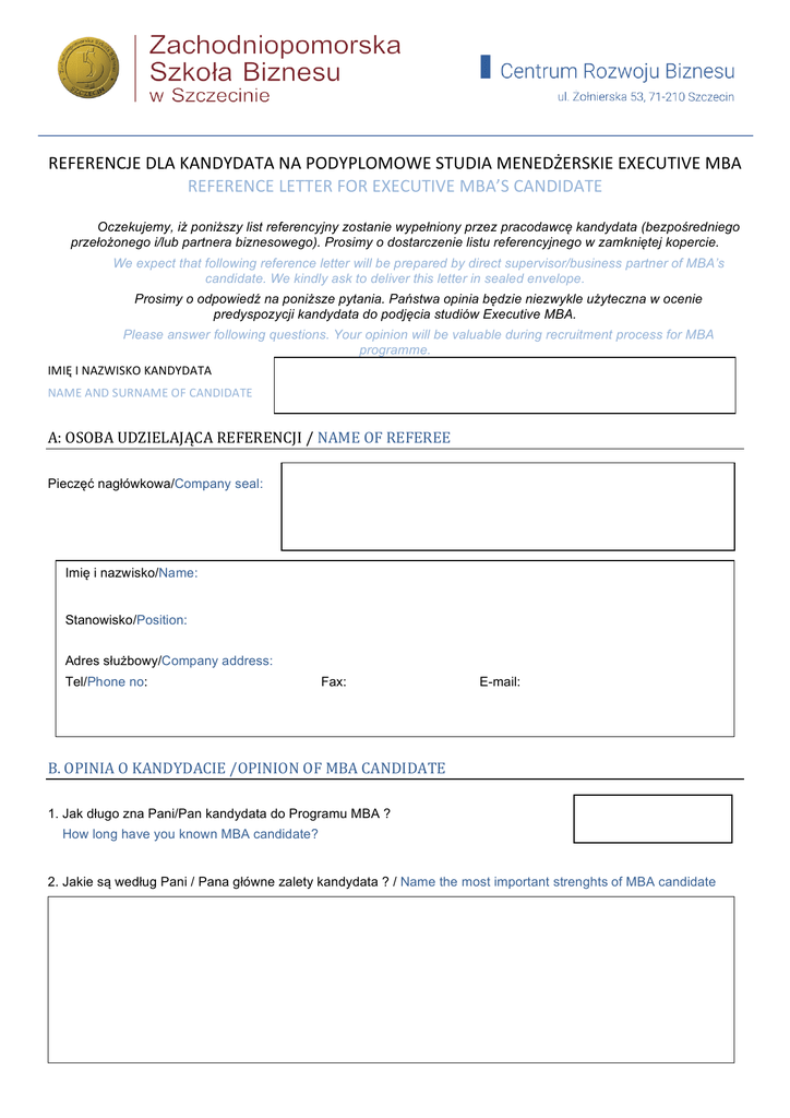 REFERENCJEDLAKANDYDATANAPODYPLOMOWESTUDIAMENEDŻERSKIEEXECUTIVEMBA REFERENCELETTERFOREXECUTIVEMBA’SCANDIDATE Oczekujemy, iż poniższy list referencyjny zostanie wypełniony przez pracodawcę kandydata (bezpośredniego przełożonego i/lub partnera biznesowego). Prosimy o dostarczenie listu referencyjnego w zamkniętej kopercie. We expect that following reference letter will be prepared by direct supervisor/business partner of MBA’s candidate. We kindly ask to deliver this letter in sealed envelope. Prosimy o odpowiedź na poniższe pytania. Państwa opinia będzie niezwykle użyteczna w ocenie predyspozycji kandydata do podjęcia studiów Executive MBA. Please answer following questions. Your opinion will be valuable during recruitment process for MBA programme. IMIĘINAZWISKOKANDYDATA NAMEANDSURNAMEOFCANDIDATE A:OSOBAUDZIELAJĄCAREFERENCJI/NAMEOFREFEREE Pieczęć nagłówkowa/Company seal: Imię i nazwisko/Name: Stanowisko/Position: Adres służbowy/Company address: Tel/Phone no: Fax: E-mail: B.OPINIAOKANDYDACIE/OPINIONOFMBACANDIDATE 1. Jak długo zna Pani/Pan kandydata do Programu MBA ? How long have you known MBA candidate? 2. Jakie są według Pani / Pana główne zalety kandydata ? / Name the most important strenghts of MBA candidate 3. Jakie są według Pani / Pana główne wady kandydata ?/ Name some weaknesses of MBA candidate 4. Proszę o ocenę głównych predyspozycji kandydata do podjęcia studiów MBA, na podstawie poniższych kryteriów Please assess MBA candidate using following criteria concerning managerial skills Bardzo dobry Dobry Przeciętny Very good Good Satisfactory Poniżej przeciętnej Niezadawalający Not satisfactory Below average Zdolność logicznego myślenia /Analytic thinking 5 4 3 2 1 Poziom intelektualny/ Intellect 5 4 3 2 1 Umiejętności prezentacji werbalnej/ Oral expression 5 4 3 2 1 Umiejętności prezentacji w formie pisemnej/ Written expression 5 4 3 2 1 Umiejętność pracy zespołowej/ Teamwork 5 4 3 2 1 Umiejętność kierowania pracą zespołową/Team supervision 5 4 3 2 1 Dotrzymywanie terminów wykonania zadań/ Task delivering excellance 5 4 3 2 1 Umiejętność wyciągania wniosków/Problem solving 5 4 3 2 1 Gotowość do podejmowania nowych wyzwań , zadań/ Attitude towards new challanges 5 4 3 2 1 Gotowość do podejmowania trudnych zadań i ciężkiej pracy/ Attitude towards complex tasks and hard working 5 4 3 2 1 5. Inne opinie, jakie chce Pani / Pan zawrzeć w liście referencyjnym Additional information that you want to share about MBA candidate Data, pieczęć służbowa i podpis osoby składającej referencje: Date, seal and name of referee