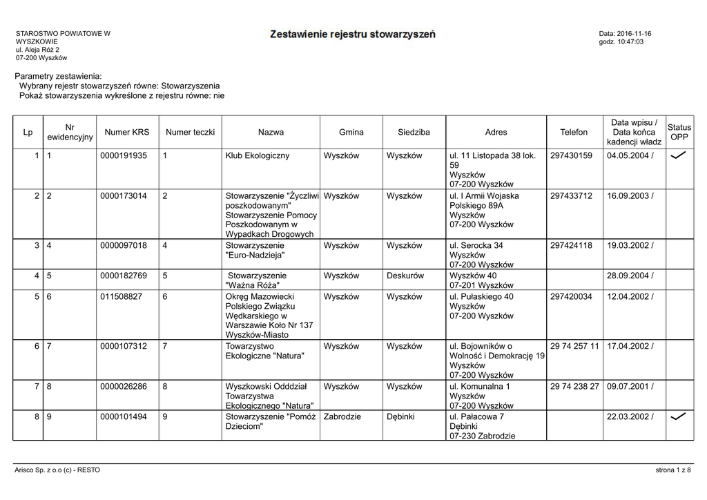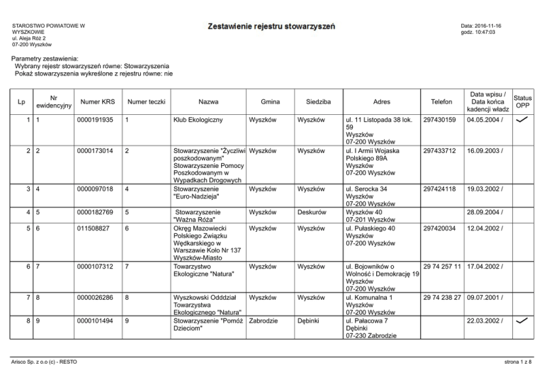 STAROSTWO POWIATOWE W WYSZKOWIE ul. Aleja Róż 2 07-200 Wyszków Data: 2016-11-16 godz. 10:47:03 Parametry zestawienia: Wybrany rejestr stowarzyszeń równe: Stowarzyszenia Pokaż stowarzyszenia wykreślone z rejestru równe: nie Lp Nr ewidencyjny Numer KRS Numer teczki Nazwa Gmina Siedziba 1 1 0000191935 1 Klub Ekologiczny Wyszków Wyszków 2 2 0000173014 2 Wyszków 3 4 0000097018 4 Stowarzyszenie "Życzliwi Wyszków poszkodowanym" Stowarzyszenie Pomocy Poszkodowanym w Wypadkach Drogowych Stowarzyszenie Wyszków "Euro-Nadzieja" 4 5 0000182769 5 Wyszków Deskurów 5 6 011508827 6 Wyszków Wyszków 6 7 0000107312 7 Stowarzyszenie "Ważna Róża" Okręg Mazowiecki Polskiego Związku Wędkarskiego w Warszawie Koło Nr 137 Wyszków-Miasto Towarzystwo Ekologiczne "Natura" Wyszków Wyszków 7 8 0000026286 8 Wyszków 8 9 0000101494 9 Wyszkowski Odddział Wyszków Towarzystwa Ekologicznego "Natura" Stowarzyszenie "Pomóż Zabrodzie Dzieciom" Arisco Sp. z o.o (c) - RESTO Wyszków Dębinki Adres Telefon Data wpisu / Status Data końca OPP kadencji władz ul. 11 Listopada 38 lok. 59 Wyszków 07-200 Wyszków ul. I Armii Wojaska Polskiego 89A Wyszków 07-200 Wyszków 297430159 04.05.2004 / 297433712 16.09.2003 / ul. Serocka 34 Wyszków 07-200 Wyszków Wyszków 40 07-201 Wyszków ul. Pułaskiego 40 Wyszków 07-200 Wyszków 297424118 19.03.2002 / 28.09.2004 / 297420034 12.04.2002 / ul. Bojowników o 29 74 257 11 17.04.2002 / Wolność i Demokrację 19 Wyszków 07-200 Wyszków ul. Komunalna 1 29 74 238 27 09.07.2001 / Wyszków 07-200 Wyszków ul. Pałacowa 7 22.03.2002 / Dębinki 07-230 Zabrodzie strona 1 z 8 Lp Nr ewidencyjny Numer KRS Numer teczki 9 10 0000223971 10 10 12 0000161323 12 11 13 0000163347 13 12 25 0000146534 25 13 26 0000094699 14 27 Nazwa Gmina Siedziba Adres Stowarzyszenie na Rzecz Uczniów Niepełnosprawnych "Promyk" Stowarzyszenie Przyjaciół Wyszkowa Puszczy Białej i Kamienieckiej Polski Związek Niewidomych Okreg Mazowiecki Koło Terenowe Klub "Amazonek" Wyszków Wyszków ul. Geodetów 45 Wyszków 07-200 Wyszków Wyszków Wyszków ul. Jordanowska 4 Wyszków 07-200 Wyszków Wyszków Wyszków ul. I AWP 89a lok. pok. 8 Wyszków 07-200 Wyszków Wyszków Wyszków 26 Związek Harcerstwa Polskiego Wyszków Wyszków 0000156967 27 Stowarzyszenie "Pepisko" Wyszków Wyszków 15 28 0000227706 28 Stowarzyszenie Pomocy Wyszków Rodzinom Wyszków 16 29 0000156968 29 Somianka Somianka 17 32 0000053179 32 Brańszczyk Dalekie Tartak 18 33 0000028003 33 Rząśnik Dąbrowa 19 34 0000170045 34 Stowarzyszenie na Rzecz Gminy Somianka "Soma" Stowarzyszenie na Rzecz Rozwoju Osiedla Dalekie-Tartak "Sosna" Stowarzyszenie na Rzecz Rozowju Wsi Dąbrowa Stowarzyszenie Użytkowników Ośrodka "Pod Sosnami" Barcicie ul. 3 Maja 16 Wyszków 07-200 Wyszków ul. Al. Róż 2 Wyszków 07-200 Wyszków ul. Nadgórze 39 Wyszków 07-200 Wyszków ul. Gen. Władysława Sikorskiego 40 Wyszków 07-200 Wyszków Somianka 21 07-203 Somianka Barcice Arisco Sp. z o.o (c) - RESTO Telefon Data wpisu / Status Data końca OPP kadencji władz 14.12.2004 / 29 74 233 50 16.05.2003 / 06.12.2005 / 29 74 240 97 13.01.2003 / 798 61 51 52 19.11.2007 / 608 175 135 30.06.1995 / 29 74 296 65 02.02.2005 / 29 74 187 60 27.03.2003 / ul. Topolowa 17 Dalekie-Tartak 07-221 Brańszczyk Dąbrowa 40 07-205 Rząśnik 02.09.2000 / Barcice 07-203 Somianka 08.06.2011 / 11.08.2000 / strona 2 z 8 Lp Nr ewidencyjny Numer KRS 20 35 Numer teczki 35 21 36 0000106108 36 22 37 0000106108 37 23 39 0000106108 39 24 40 0000109984 40 25 41 0000176675 41 26 43 0000043349 43 27 45 0000134684 45 28 47 0000077905 47 Arisco Sp. z o.o (c) - RESTO Nazwa Gmina Siedziba Adres Telefon Data wpisu / Status Data końca OPP kadencji władz Światowy Związek Żołnierzy Armii Krajowej Obwód "Rajski Ptak" Ośrodek V Koło w Wyszkowie Związek Kombatantów Rzeczypospolitej Polskiej i Byłych Więźniów Politycznych Związek Kombatantów Rzeczypospolitej Polskiej i Byłych Więźniów Politycznych Związek Kombatantów Rzeczypospolitej Polskiej i Byłych Więźniów Politycznych Polski Związek Emerytów, Rencistów i Inwalidów Koło w Wyszkowie Towarzystwo Wiedzy Powszechnej Oddział Regionalny w Wyszkowie Polski Komitet Pomocy Społecznej Wyszków Wyszków ul. 3 Maja 3 Wyszków 07-200 Wyszków 26.05.1989 / Długosiodło Długosiodło ul. Poniatowskiego 36 Długosiodło 07-210 Poręba Poręba 07-308 Wyszków Wyszków ul. Prosta 7A Wyszków 07-200 Wyszków 29 74 241 25 11.02.2004 / Wyszków Wyszków ul. Prosta 7A Wyszków 07-200 Wyszków 16.05.2002 / Wyszków Wyszków ul. 3 Maja 12 lok. 1A Wyszków 07-200 Wyszków Ostrołęka Towarzystwo Przyjaciół Dzieci Oddział Powiatowy Stowarzyszenie "Przymierze dla Wyszkowa - Rozwój Regionalny" Wyszków Wyszków Wyszków Wyszków ul. Przemysłowa Ostrołęka 07-410 Ostrołęka ul. 1 Maja 7 lok. 34 Wyszków 07-200 Wyszków ul. I AWP 173 Wyszków 07-200 Wyszków 29 74 122 03 11.02.2004 / 11.02.2004 / 29 74 295 65, 21.10.2003 / 74 250 05 10.06.2011 / 29 74 333 64 10.10.2002 / 29 74 222 13 16.06.2011 / strona 3 z 8 Lp Nr ewidencyjny Numer KRS Numer teczki 29 48 0000232169 48 30 49 0000225718 49 31 50 0000162757 50 32 51 0000127921 51 33 55 0000233698 55 34 57 0000235290 57 35 59 59 Nazwa Siedziba Adres Stowarzyszenie na Rzecz Osób Niepełnosprawnych i Niezaradnych Życiowo "Zawsze Razem" Stowarzyszenie na Rzecz Rozwoju Gminy Długosiodło Polskie Stowarzyszenie na Rzecz Osób z Upośledzeniem Umysłowym Koło w Wyszkowie Nadbużańskie Towarzystwo Oświatowe "Moja Wieś" Stowarzyszenie dla Powiatu Wyszkowskiego Brańszczyk Brańszczyk ul. Jana Pawła II 65 Brańszczyk 07-221 Brańszczyk Długosiodło Długosiodło Wyszków Wyszków ul. Mickiewicza 15 Długosiodło 07-210 ul. Geodetów 76 07-200 Wyszków Somianka Popowo Kościelne Somianka 60 07-203 Wyszków Wyszków Stowarzyszenie Prywatnych Właścicieli Nieruchomości "Ostoja" Wyszkowska Federacja Uczniowskich Klubów Sportowych Stowarzyszenie Komitet Ochrony Podatników Wyszków Deskurów 