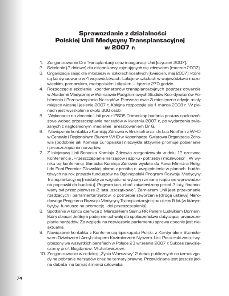 Sprawozdanie z dzia³alnoci Polskiej Unii Medycyny Transplantacyjnej w 2007 r. 1. Zorganizowanie Dni Transplantacji oraz inauguracji Unii (styczeñ 2007). 2. Szkolenie (2 dniowe) dla dziennikarzy zajmuj¹cych siê zdrowiem (marzec 2007). 3. Organizacja zajêæ dla m³odzie¿y w szko³ach licealnych (kwiecieñ, maj 2007), które s¹ kontynuowane w 4 województwach. Lekcje w szko³ach w województwie mazowieckim, pomorskim, ma³opolskim i l¹skim ³¹cznie 270 godzin. 4. Rozpoczêcie szkolenia koordynatorów transplantacyjnych poprzez otwarcie w Akademii Medycznej w Warszawie Podyplomowych Studiów Koordynatorów Pobierania i Przeszczepiania Narz¹dów. Pierwsze dwie 3 miesiêczne edycje mia³y miejsce wiosn¹ i jesieni¹ 2007 r.. Kolejna rozpoczê³a siê 1 marca 2008 r.. W planach jest wyszkolenie oko³o 300 osób. 5. Wykonanie na zlecenie Unii przez IPSOS Demoskop badania postaw spo³eczeñstwa wobec przeszczepiania narz¹dów w kwietniu 2007 r., po wydarzenia zwi¹zanych z nag³onionym medialnie aresztowaniem Dr G. 6. Nawi¹zanie kontaktu z Komisj¹ Zdrowia w Brukseli oraz dr. Luc Noelem z WHO w Genewie i Regionalnym Biurem WHO w Kopenhadze. wiatowa Organizacja Zdrowia (podobnie jak Komisja Europejska) niezwykle aktywnie promuje pobieranie i przeszczepianie narz¹dów. 7. Z inicjatywy Unii Senacka Komisja Zdrowia zorganizowa³a w dniu 12 czerwca Konferencjê Przeszczepianie narz¹dów i szpiku - potrzeby i mo¿liwoci. W wyniku tej konferencji Senacka Komisja Zdrowia wys³a³a do Pana Ministra Religi i do Pani Premier Gilowskiej pismo z prob¹ o uwzglêdnienie w planach bud¿etowych na rok przysz³y funduszów na Ogólnopolski Program Rozwoju Medycyny Transplantacyjnej (niestety ze wzglêdu na wybory i zmianê rz¹du nie wprowadzono poprawki do bud¿etu). Pogram ten, choæ zatwierdzony przed 2 laty, finansowany by³ przez pierwsze 2 lata szcz¹tkowo. Zamiarem Unii jest przekonanie rz¹dz¹cych i parlamentarzystów o potrzebie stworzenia (drog¹ ustawy) Narodowego Programu Rozwoju Medycyny Transplantacyjnej na okres 5 lat (w którym by³yby fundusze na promocjê idei przeszczepiania). 8. Spotkanie w koñcu czerwca z Marsza³kiem Sejmu RP, Panem Ludwikiem Dornem, który obieca³, ¿e Sejm podejmie uchwa³ê do spo³eczeñstwa dotycz¹c¹ przeszczepiania narz¹dów. Ze wzglêdu na rozwi¹zanie parlamentu sprawa obecnie jest nieaktualna. 9. Nawi¹zanie kontaktu z Konferencj¹ Episkopatu Polski, z Kardyna³em Stanis³awem Dziwiszem i Arcybiskupem Kazimierzem Nyczem. List Pasterski zosta³ wyg³oszony we wszystkich parafiach w Polsce 23 wrzenia 2007 r. Sukces zawdziêczamy prof. Bogdanowi Micha³owiczowi. 10. Zorganizowanie w redakcji ¯ycia Warszawy 2 debat publicznych na temat zgody na pobranie narz¹dów oraz na tematy prawne. Przewidziana jest jeszcze jedna debata na temat mierci cz³owieka. 74 11. Wydanie 23-stronnicowego dodatku do ¯ycia Warszawy w miesi¹cu wrzeniu pt. Transplantologia. 12. Wydanie w ¯yciu Warszawy owiadczenia woli, wyra¿aj¹cego zgodê na pobranie narz¹dów. 13. Wspó³udzia³ w organizacji Biegu po zdrowie z has³em Nie zabieraj narz¹dów do nieba przygotowanego przez Oddzia³ Szczeciñski TVP (czerwiec 2007). 14. Udzia³ w wielu programach radiowych (rozmowy ze s³uchaczami) i przekazach telewizyjnych. 15. Przygotowanie promocyjnych zestawów z 7 p³ytami CD, na których zosta³y nagrane audycje radiowe pod wspólnym tytu³em Sekrety przeszczepiana narz¹dów. Wydane zosta³o 200 zestawów CD celem rozes³ania do rozg³oni radiowych, szkó³ itp. 16. Realizacja dwóch zadañ publicznych, które finansuje Ministerstwo Zdrowia dotycz¹cych edukacji w dziedzinie przeszczepiania narz¹dów. W ramach powy¿szych zadañ: a. Opracowane i wydane zosta³y materia³y dla nauczycieli, uczniów oraz ulotki. b. W opracowaniu materia³y z przeznaczeniem dla wyk³adów w seminariach duchownych. 17. Zrealizowanie filmu na DVD dotycz¹cego skutecznoci i bezpieczeñstwa przeszczepiania nerki od dawcy ¿ywego (dystrybucja w 240 stacjach dializ w Polsce). 18. Przygotowanie umowy z TVN Med na przygotowanie i realizacjê materia³ów merytorycznych oraz nagrañ i emisji dwóch audycji telewizyjnych. 19. Wspólnie z grup¹ Linemed powstaje Edukacyjna Witryna Internetowa dotycz¹ca medycyny transplantacyjnej. 20. Emisja spotów dotycz¹cych transplantacji w okresie od wrzenia do grudnia, w kinach Multikina w ca³ej Polsce. Spot realizowany przez Szko³ê Mistrzów Reklamy przy Wy¿szej Szkole Przedsiêbiorczoci i Zarz¹dzania im. Leona Komiñskiego. Wojciech Rowiñski 75