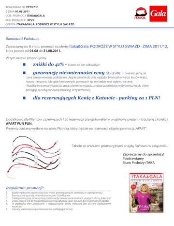 KOMUNIKAT NR 277/2011 z dnia 01.08.2011 DOT.: Promocji ITAKA&GALA KOD PROMOCJI: KPZ3 oferta: ITAKA&GALA: Podróże w stylu gwiazd Szanowni Państwo, Zapraszamy do III etapu promocji na ofertę: Itaka&Gala: PODRÓŻE W STYLU GWIAZD - ZIMA 2011/12, która potrwa od 01.08 do 31.08.2011. W tym okresie proponujemy: << zniżki do 41% - liczone od cen całkowitych. << gwarancję niezmienności ceny (GR - Gwarantujemy, że cena zarezerwowanej podróży nie ulegnie zmianie do dnia wyjazdu! Ewentualny wzrost kursów walut, kosztu transportu lub opłat lotniskowych, portowych itp. nie będzie miał wpływu na cenę. Wszelkie inne zmiany takie jak: zmiana terminu wyjazdu, zmiana uczestników, wyżywienia, hotelu i inne pociągają za sobą ponowną kalkulację ceny rezerwacji. << dla rezerwujących Kenię z Katowic - parking za 1 PLN! Dodatkowo dla Klientów z pierwszych 150 rezerwacji przygotowaliśmy wyjątkowy prezent - biżuterię z kolekcji APART FUN FUN. Prezenty zostaną wysłane na adres Płatnika, który będzie na rezerwacji objętej promocją „APART”. Tabele ze zniżkami promocyjnymi znajdą Państwo w załączniku. Zapraszamy do sprzedaży! Pozdrawiamy Biuro Podróży ITAKA Regulamin promocji: 1. 2. 3. 4. 5. 6. Każda impreza ma ograniczoną ilość miejsc przeznaczoną do sprzedaży w czasie promocji. Promocja nie łączy się z innymi promocjami i bonifikatami. Zniżki promocyjnej nie otrzymują dzieci i osoby dorosłe na dostawkach, objętych ofertą „stała cena”. Zniżka liczona jest od cen podstawowych zawartych w tabeli cenowej bez ewentualnych dopłat. W przypadku ofert „zwiedzanie + wypoczywanie” zniżka wyliczana jest od ceny podstawowej wycieczki. Imprezy realizowane na zamówienie nie podlegają promocji. ITAKA&GALA Podróże w stylu gwiazd - ZIMA 11/12 KOMUNIKAT NR 277/2011 z dnia 01.08.2011 III etap: 01.08.11-31.08.11 Nr Str. Nazwa Hotelu Kod 20 22 n 24 26 n 28 n 30 n 32 34 36 n 40 42 n 46 48 n 52 54 n 56 58 n 60 62 n 66 n 70 n 74 78 76 n 82 84 86 n 90 n 94 96 2/3 Wyspy Kanaryjskie - Fuerteventura Hotel Design R2 Bahia Playa Hotel Melia Gorriones FUEBAHG FUEGORG 26% 26% Wyspy Kanaryjskie - Lanzarote Hotel Melia Salinas Hotel Gran Castillo ACEMELG ACECASG TFSGRAG 30% Wyspy Kanaryjskie - Gomera Hotel Jardin Tecina TFSJARG 27% Wyspy Kanaryjskie - Gran Canaria Hotel Gloria Palace Royal & Spa Hotel Melia Tamarindos Hotel Lopesan Baobab Resort n 100 102 n 30% 25% Wyspy Kanaryjskie - Teneryfa Hotel Gran Melia Palacio De Isora Nr Str. Nazwa Hotelu Kod LPAGPRG LPAMELG LPABAOG 27% 29% 25% Hotel Cs Madeira Atlantic Res. & Sea Spa FNCCSMG Hotel Melia Madeira Mare Resort & Spa FNCMELG 33% 33% 106 108 110 112 114 116 n 120 122 124 Zniżka Promocyjna Dominikana Dreams Punta Cana Resort & Spa Barcelo Bavaro Palace Deluxe PUJDREG PUJBAPG 25% 24% DPSMELG DPSTROG 22% 22% DPSMIRG DPSJAYG DPSBING DPSHYAG 22% 20% 21% 22% MBJROSG 26% MBJGRAG MBJPALG 26% 26% Bali Hotel Melia Bali Villas & Spa Resort Hotel Bali Tropic Resort & Spa Hotel Grand Mirage Res. & Thalasso Bali Hotel Jayakarta Hotel Ramada Bintang Bali Hotel Grand Hyatt Bali Jamajka Hotel Iberostar Rose Hall Beach Hotel Grand Palladium Jamaica Resort & Spa Hotel Sunset At The Palms Madera Cypr Hotel Atlantica Aeneas Resort Hotel St Raphael Resort LCAAENG LCARAPG 41% 33% Egipt - Hurghada Hotel Movenpick Resort & Spa El Gouna HRGMOVG Hotel Premier Le Reve & Spa HRGPREG 25% 20% Egipt - Sharm El Sheikh Hotel Stella Di Mare Beach & Spa Hotel Hilton Waterfalls Resort SSHSTEG SSHHIWG 30% 30% RMFCORG RMFLAMG 28% 30% MIRSULG 30% Egipt - Marsa El Alam Hotel Iberotel Coraya Beach Resort Hotel Iberotel Lamaya Resort Tunezja Hotel Le Sultan Resort & Spa Maroko Hotel Sofitel Agadir Royal Bay Resort AGASOFG 22% << gwarancja niezmienności ceny (do 15.08) <<dla rezerwujących Kenię z Katowic - parking za 1 PLN! n Zniżka Promocyjna Kenia Hotel Sands At Nomads Serena Beach Hotel & Spa Swahili Beach Resort MBANOMG MBASERG MBASWAG 29% 31% 28% ZNZZHOG ZNZGEMG ZNZSTAG 23% 29% 25% CMBEDEG 30% GOILEEG 29% GOIINTG 29% Zanzibar Hotel The Z Hotel Diamonds La Gemma Dell’Est Diamonds Star Of The East Sri Lanka Hotel Eden Resort & Spa INDIE - Goa Hotel The Leela Kempinski Goa Hotel Intercontinental The Lalit Goa Resort wczasy ITAKA&GALA Podróże w stylu gwiazd - ZIMA 11/12 KOMUNIKAT NR 277/2011 z dnia 01.08.2011 III etap: 01.08.11-31.08.11 150 151 152 n 153 Włochy Florencja Rzym Palermo n FLRGALG 24% ROMGALG25% PMOGALG22% 132 126 n Francja Paryż Zniżka Promocyjna wycieczki city break n Nr Str. Nazwa Wycieczki Kod 128 PARGALG20% n 130 n 134 n 136 n 138 n 140 n 142 144 n 146 n 148 Włochy Toskania Ze Smakiem Toskania FLRSMAG 21% FLRTOSG24% Meksyk Meksykańskie Smaczne Kąski MEXSMAG 20% LAXCUDG 25% BODFRAG 22% BIOWING 23% GIGKARG 20% MBAKENG 18% SJOKWEG CTGREJG 20% 20% MIAREJG 15% LISREJG 15% UWAGA: wyloty 02.11 - zniżka15% Usa American Dream Francja Francja Temu Winna LATO 2010 - wycieczki Zniżka Promocyjna Hiszpania Rioja Winem Płynąca Brazylia Karnawał W Rio Kenia Wysoko Na Równiku Kostaryka W Krainie Tiocos I Kwezala Rejs Po Karaibach USA Bahamy Z Miami Portugalia Na Krańcu Starego Świata << gwarancja niezmienności ceny (do 15.08) <<dla rezerwujących Kenię z Katowic - parking za 1 PLN! Nr Str. Nazwa Wycieczki Kod city break wycieczki 3/3