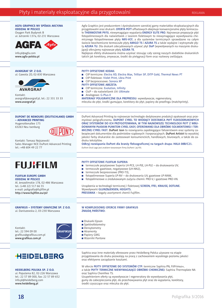 Płyty i materiały eksploatacyjne dla przygotowalni AGFA GRAPHICS NV SPÓŁKA AKCYJNA ODDZIAŁ W POLSCE Oxygen Park Budynek B ul. Jutrzenki 137a, 02-231 Warszawa [email protected] www.agfa-polska.pl AVARGRAF SP. Z O.O. ul. Gawota 2D, 02-830 Warszawa Kontakt: [email protected], tel.: 22 331 33 33 www.avargraf.pl DUPONT DE NEMOURS (DEUTSCHLAND) GMBH – ADVANCED PRINTING Hugenottenallee 175 63263 Neu Isenburg Kontakt: Tomasz Nojszewski Sales Manager NCE DuPont Advanced Printing tel.: +48 604 49 22 77 FUJIFILM EUROPE GMBH ODDZIAŁ W POLSCE Al. Jerozolimskie 178, 02-486 Warszawa tel.: (+48 22) 517 66 55 e-mail: poligrafia@fujifilm.pl http://www.fujifilm.eu/pl/ GRAFIKUS – SYSTEMY GRAFICZNE SP. Z O.O. ul. Daniszewska 2, 03-230 Warszawa REKLAMA Agfa Graphics jest producentem i dystrybutorem szerokiej gamy materiałów eksploatacyjnych dla przygotowalni oraz drukarń. OFERTA PŁYT offsetowych obejmuje konwencjonalne płyty termoczułe THERMOSTAR P970, niewymagające wypalania ENERGY ELITE PRO. Najnowsze propozycje płyt fotopolimerowych dla naświetlarek z laserem fioletowym to niewymagające wywoływania chemicznego fotopolimerowe płyty N95-VCF, a dla systemów termicznych sprawdzone na całym świecie bezchemiczne termoczułe płyty AMIGO TS i AZURA TS a także wydajne i wytrzymałe płyty AZURA TU. Dla drukarń zdecydowanych używać płyt DoP (wywoływanych na maszynie drukującej) oferujemy najnowsze płyty AZURA TE. Najlepsze efekty drukowania można uzyskać stosując cały szereg naszych dodatków drukarskich takich jak korektory, zmywacze, środki do pielęgnacji form oraz roztwory zwilżające. PŁYTY OFFSETOWE KODAK: I CtP termiczne: Electra XD, Electra Max, Trillian SP, DITP Gold, Thermal News PT I CtP fioletowe: Violet Print, Libra Print I CtP bezprocesowe: Sonora XP PŁYTY OFFSETOWE ABEZETA: I CtP termiczne: Evolution, Infinity I CtcP – do naświetlarek UV: Ultimate I Analogowe: G-Plus-II MATERIAŁY POLIGRAFICZNE DLA PREPRESSU: wywoływacze, regeneratory, mleczka do płyt, środki gumujące, korektory do płyt; papiery do proofingu (matchprinty). DuPont Advanced Printing to najnowsze technologie dedykowane produkcji opakowań oraz przemysłowi poligraficznemu. DUPONT CYREL TO WIODĄCY DOSTAWCA PŁYT FLEKSODRUKOWYCH ORAZ SYSTEMÓW DO ICH PRZYGOTOWANIA, W TYM NAJNOWSZEJ TECHNOLOGII PŁYT Z WBUDOWANYM PŁASKIM PUNKTEM CYREL EASY, OFEROWANEJ DLA OBRÓBKI SOLWENTOWEJ I TERMICZNEJ CYREL FAST. DuPont Izon to rozwiązania zapobiegające fałszerstwom oraz systemy zabezpieczeń dokumentów dla podmiotów rządowych i korporacyjnych. DuPont Artistri to wysokiej jakości farby drukarskie do zastosowań konsumenckich, handlowych, biurowych, a także do zadruku tekstyliów. Odkryj rozwiązania DuPont dla branży fleksograficznej na targach drupa: HALA 08B/C21. DuPont Oval Logo jest znakiem towarowym firmy DuPont i jej filii. PŁYTY OFFSETOWE FUJIFILM SUPERIA I termoczułe pozytywowe Superia LH-PCE, LH-PJE, LH-PLE – do drukowania UV, I termoczułe gazetowe, negatywowe (LH-NN2), I termoczułe bezprocesowe (PRO-T3), I fotopolimerowe Superia LP-NV – do drukowania UV, gazetowe LP-NNW, I fotopolimerowe o zredukowanym zużyciu chemii: PRO-V, i gazetowe PRO-VN. Urządzenia w technologii termicznej i fioletowej SCREEN, FFEI, KRAUSE, DOTLINE. Wywoływarki GLUNZ&JENSEN, HEIGHTS. PRESSMAX – bogaty asortyment chemii Fujifilm. W KOMPLEKSOWEJ OFERCIE FIRMY GRAFIKUS ZNAJDĄ PAńSTWO: I Drukarki Epson Spektrofotometry I Densytometry I Atramenty I Papiery GMG I Wzorniki Pantone I Kontakt: tel.: 22 594 09 00 grafikus@grafikus.com.pl www.grafikus.com.pl Saphira oraz inne materiały oferowane przez Heidelberg Polska używane na etapie przygotowania do druku pozwalają na pracę z zachowaniem wysokiego poziomu jakości oraz efektywne zarządzanie kosztami. HEIDELBERG POLSKA SP. Z O.O. ul. Popularna 82, 02-226 Warszawa tel.: 22 57 89 000, fax: 22 57 89 652 [email protected] www.heidelberg.pl 18 W ofercie PŁYTY OFFSETOWE DO SYSTEMÓW CTP: termiczne Saphira PN, FitPrimus+, a także PŁYTY TERMICZNE NIEWYMAGAJĄCE OBRÓBKI CHEMICZNEJ: Saphira Thermoplate NA oraz Saphira Chemfree TS. Uzupełnieniem oferty są wywoływacze i regeneratory do wywoływania płyt, gumy do zabezpieczania płyt, do przechowywania płyt oraz do wypalania, korektory, środki czyszczące oraz mleczka do płyt. Poligrafika 3/2016 REKLAMA Płyty i materiały eksploatacyjne dla przygotowalni PŁYTY CTP DO DRUKU KOMERCYJNEGO: TERMICZNE pozytywowe: Kodak Electra XD, Kodak Electra Max, negatywowe: Kodak Trillian SP, Kodak DITP Gold, bezprocesowe: Kodak Sonora XP; FIOLETOWE: Kodak Libra VP. PŁYTY CTP DO DRUKU GAZETOWEGO: TERMICZNE: Kodak ThermalNews PT; FIOLETOWE: Kodak Libra VP. TECHNOLOGIA FLEKSOGRAFICZNA: płyta polimerowa Kodak NXH, bezprocesowy film termiczny Kodak DITR, płyty fotopolimerowe Kodak Flexcel NXH do druku opakowań miękkich oraz Kodak Flexcel NXC do druku na tekturach falistych, powłoka termiczna TIL do płyt Kodak Flexcel NXH i NXC, bezprocesowy film termiczny Kodak DITR do wykonywania analogowych płyt fleksograficznych oraz letterpress. I I I PODŁOżA, ATRAMENTY I SYSTEMY STAŁEGO ZASILANIA DO PLOTERÓW WIELKOFORMATOWYCH* PŁYTY I CHEMIA DO OBRÓBKI OFFSETOWYCH PŁYT FUJIFILM, IPAGSA** – CtP i analogowe – termoczułe i fotopolimerowe – do obróbki chemicznej, bezobróbkowe i bezodczynnikowe PŁYTY I CHEMIA DO OBRÓBKI FLEKSODRUKOWYCH PŁYT ASAHI*** – wodne i konwencjonalne Poligrafika 3/2016 KODAK POLSKA SP. Z O.O. ul. Domaniewska 50 02-672 Warszawa tel.: 22 430 69 00 [email protected] graphics.kodak.com REPROGRAF S.A. ul. Wolska 88 01-141 Warszawa *Anna Klucznik – tel. kom.: 698 698 672 e-mail: [email protected] **Ewa Łapow – tel. kom.: 698 698 606 e-mail: [email protected] ***Bartłomiej Brzykcy – tel. kom.: 698 676 238 e-mail: [email protected] www.reprograf.com.pl 19