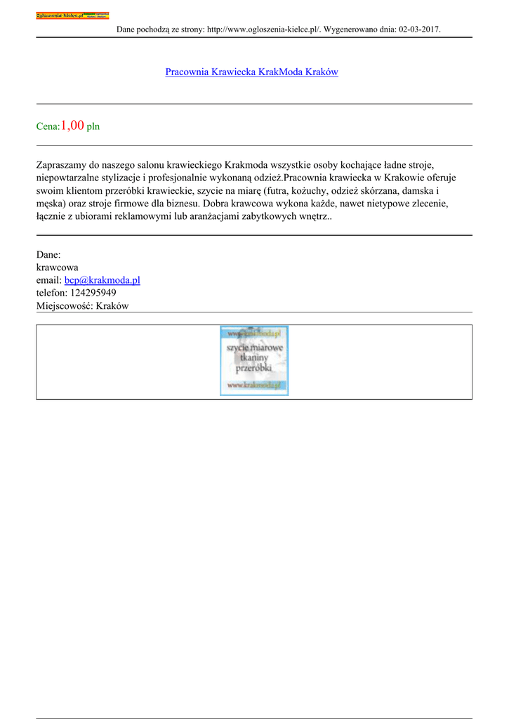 Dane pochodzą ze strony: http://www.ogloszenia-kielce.pl/. Wygenerowano dnia: 02-03-2017. Pracownia Krawiecka KrakModa Kraków Cena:1,00 pln Zapraszamy do naszego salonu krawieckiego Krakmoda wszystkie osoby kochające ładne stroje, niepowtarzalne stylizacje i profesjonalnie wykonaną odzież.Pracownia krawiecka w Krakowie oferuje swoim klientom przeróbki krawieckie, szycie na miarę (futra, kożuchy, odzież skórzana, damska i męska) oraz stroje firmowe dla biznesu. Dobra krawcowa wykona każde, nawet nietypowe zlecenie, łącznie z ubiorami reklamowymi lub aranżacjami zabytkowych wnętrz.. Dane: krawcowa email: [email protected] telefon: 124295949 Miejscowość: Kraków