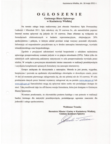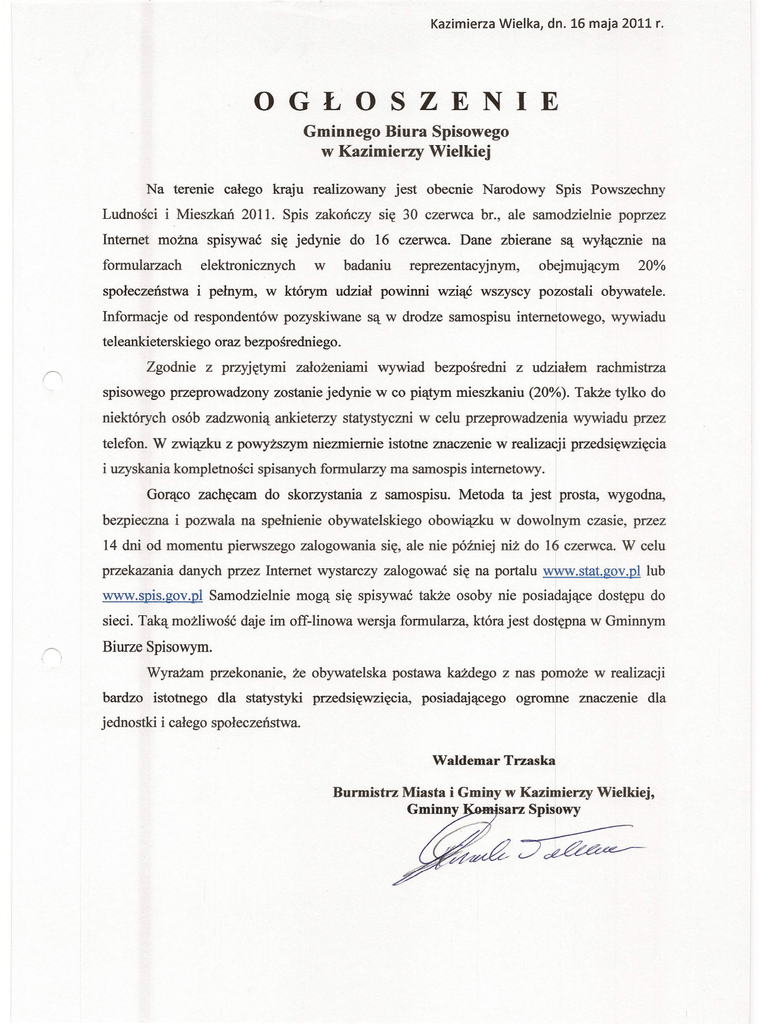Kazimierza Wielka, dn. 16 maja 2011 r. OGŁOSZENIE Gminnego Biura Spisowego w Kazimierzy Wielkiej Na terenie całego kraju realizowany jest obecnie Narodowy Spis Powszechny Ludności i Mieszkań 2011. Spis zakończy się 30 czerwca br., ale samodzielnie Internet można spisywać się jedynie w do 16 czerwca. Dane zbierane badaniu reprezentacyjnym, poprzez są wyłącznie obejmującym na formularzach elektronicznych 20% społeczeństwa i pełnym, w którym udział powinni wziąć wszyscy pozostali obywatele. Informacje od respondentów pozyskiwane są w drodze samospisu internetowego, wywiadu teleankieterskiego oraz bezpośredniego. Zgodnie z przyjętymi założeniami wywiad bezpośredni z udziałem rachmistrza spisowego przeprowadzony zostanie jedynie w co piątym mieszkaniu (20%). Także tylko do niektórych osób zadzwonią ankieterzy statystyczni w celu przeprowadzenia wywiadu przez telefon. W związku z powyższym niezmiernie istotne znaczenie w realizacji przedsięwzięcia i uzyskania kompletności spisanych formularzy ma samo spis internetowy. Gorąco zachęcam do skorzystania z samospisu. Metoda ta jest prosta, wygodna, bezpieczna i pozwala na spełnienie obywatelskiego obowiązku w dowolnym czasie, przez 14 dni od momentu pierwszego zalogowania się, ale nie później niż do 16 czerwca. W celu przekazania danych przez Internet wystarczy zalogować się na portalu www.stat.gov.pl www.spis.gov.pl lub Samodzielnie mogą się spisywać także osoby nie posiadające dostępu do sieci. Taką możliwość daje im off-linowa wersja formularza, która jest dostępna w Gminnym Biurze Spisowym. Wyrażam przekonanie, że obywatelska postawa każdego z nas pomoże w realizacji bardzo istotnego dla statystyki przedsięwzięcia, posiadającego ogromne znaczenie dla jednostki i całego społeczeństwa. Waldemar Trzaska Burmistrz Miasta i Gminy w Kazimierzy Wielkiej, Gminny .sarz Spisowy