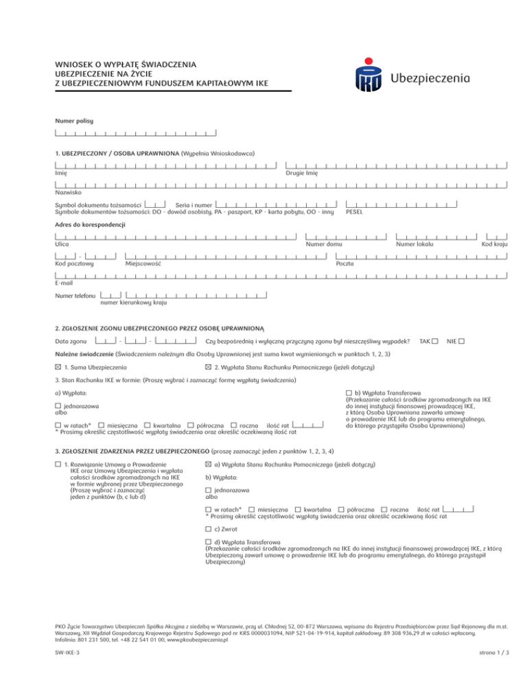 WNIOSEK O WYPŁATĘ ŚWIADCZENIA UBEZPIECZENIE NA ŻYCIE z ubezpieczeniowym funduszem kapitałowym IKE Numer polisy 1. UBEZPIECZONY / OSOBA UPRAWNIONA (Wypełnia Wnioskodawca) ImięDrugie Imię Nazwisko Seria i numer Symbol dokumentu tożsamości Symbole dokumentów tożsamości: DO - dowód osobisty, PA - paszport, KP - karta pobytu, OO - inny PESEL Adres do korespondencji UlicaNumer domuNumer lokalu Kod kraju - Kod pocztowyMiejscowośćPoczta E-mail Numer telefonu numer kierunkowy kraju 2. ZGŁOSZENIE ZGONU UBEZPIECZONEGO PRZEZ OSOBĘ UPRAWNIONĄ Data zgonu - - Czy bezpośrednią i wyłączną przyczyną zgonu był nieszczęśliwy wypadek? TAK NIE Należne świadczenie (Świadczeniem należnym dla Osoby Uprawnionej jest suma kwot wymienionych w punktach 1, 2, 3) 1. Suma Ubezpieczenia 2. Wypłata Stanu Rachunku Pomocniczego (jeżeli dotyczy) 3. Stan Rachunku IKE w formie: (Proszę wybrać i zaznaczyć formę wypłaty świadczenia) a) Wypłata: b) Wypłata Transferowa (Przekazanie całości środków zgromadzonych na IKE jednorazowado innej instytucji finansowej prowadzącej IKE, alboz którą Osoba Uprawniona zawarła umowę o prowadzenie IKE lub do programu emerytalnego, w ratach* miesięczna kwartalna półroczna roczna ilość rat do którego przystąpiła Osoba Uprawniona) * Prosimy określić częstotliwość wypłaty świadczenia oraz określić oczekiwaną ilość rat 3. ZGŁOSZENIE ZDARZENIA PRZEZ UBEZPIECZONEGO (proszę zaznaczyć jeden z punktów 1, 2, 3, 4) 1. R ozwiązanie Umowy o Prowadzenie a) Wypłata Stanu Rachunku Pomocniczego (jeżeli dotyczy) IKE oraz Umowy Ubezpieczenia i wypłata całości środków zgromadzonych na IKE b) Wypłata: w formie wybranej przez Ubezpieczonego jednorazowa (Proszę wybrać i zaznaczyć jeden z punktów (b, c lub d)albo w ratach* miesięczna kwartalna półroczna roczna ilość rat * Prosimy określić częstotliwość wypłaty świadczenia oraz określić oczekiwaną ilość rat c) Zwrot d) Wypłata Transferowa (Przekazanie całości środków zgromadzonych na IKE do innej instytucji finansowej prowadzącej IKE, z którą Ubezpieczony zawarł umowę o prowadzenie IKE lub do programu emerytalnego, do którego przystąpił Ubezpieczony) PKO Życie Towarzystwo Ubezpieczeń Spółka Akcyjna z siedzibą w Warszawie, przy ul. Chłodnej 52, 00-872 Warszawa, wpisana do Rejestru Przedsiębiorców przez Sąd Rejonowy dla m.st. Warszawy, XII Wydział Gospodarczy Krajowego Rejestru Sądowego pod nr KRS 0000031094, NIP 521-04-19-914, kapitał zakładowy: 89 308 936,29 zł w całości wpłacony. Infolinia: 801 231 500, tel. +48 22 541 01 00, www.pkoubezpieczenia.pl SW-IKE-3 strona 1 / 3 2. Rozwiązanie Umowy o Prowadzenie IKE bez rozwiązania Umowy Ubezpieczenia i wypłata całości środków zgromadzonych na IKE w formie wybranej przez Ubezpieczonego (Proszę wybrać i zaznaczyć jeden z punktów (a, b lub c) a) Wypłata: jednorazowa albo w ratach* miesięczna kwartalna półroczna roczna ilość rat * Prosimy określić częstotliwość wypłaty świadczenia oraz określić oczekiwaną ilość rat b) Zwrot c) Wypłata Transferowa (Przekazanie całości środków zgromadzonych na IKE do innej instytucji finansowej prowadzącej IKE, z którą Ubezpieczony zawarł umowę o prowadzenie IKE lub do programu emerytalnego, do którego przystąpił Ubezpieczony) 3. W ykup Częściowy z Rachunku Pomocniczego , Wartość Wykupu Częściowego z Rachunku Pomocniczego Słownie: 4. C zęściowy Zwrot z Subkonta IKE (bez rozwiązania Umowy o Prowadzenie IKE i bez rozwiązania Umowy Ubezpieczenia) Wartość Zwrotu Częściowego z Subkonta IKE , Słownie: 5. P odział Wartości Wykupu Częściowego z Rachunku Pomocniczego / Proporcjonalnie Częściowego Zwrotu z Subkonta IKE, na poszczególne Ubezpieczeniowe Fundusze Kapitałowe (UFK) typu E: Wypełnić w przypadku wyboru punktu 3 lub 4 (Jeżeli wybrano „procentowo”, prosimy wskazać procentowy podział na poszczególne Ubezpieczeniowe Fundusze Kapitałowe): Procentowo Kod UFK Nazwa UFK typu EWartość % E , E , E , E , E , E , E , E , Jeżeli Ubezpieczony nie określił % podziału Wartości Wykupu Częściowego albo Częściowego Zwrotu z Subkonta IKE - uważa się, że podział jest SUMA: 100% proporcjonalny do udziału wartości jednostek funduszu każdego Ubezpieczeniowego Funduszu Kapitałowego typu E. Nazwa i adres Urzędu Skarbowego właściwego dla Ubezpieczonego w sprawach opodatkowania podatkiem dochodowym od osób fizycznych (Proszę wypełnić w przypadku dyspozycji Wypłaty środków zgromadzonych na IKE przez Ubezpieczonego) Nazwa i adres Zakładu Ubezpieczeń Społecznych właściwego dla miejsca zamieszkania Ubezpieczonego (Proszę wypełnić w przypadku dyspozycji Zwrotu, gdy na IKE została kiedykolwiek przyjęta Wypłata Transferowa z pracowniczego programu emerytalnego w rozumieniu ustawy z dnia 20 kwietnia 2004 roku o pracowniczych programach emerytalnych Dz.U.Nr 116, pozycja 1205 z późn. zm.) 4. FORMA WYPŁATY ŚWIADCZENIA Przelew na rachunek bankowy Numer rachunku bankowego Przekaz pocztowy na adres korespondencyjny wskazany w punkcie 1 strona 2 / 3 5. WRAZ Z WNIOSKIEM O WYPŁATĘ ŚWIADCZENIA NALEŻY ZŁOŻYĆ KOPIĘ DOKUMENTU TOŻSAMOŚCI OSOBY UPRAWNIONEJ ORAZ W ZALEŻNOŚCI OD RODZAJU ZGŁASZANEGO ZDARZENIA DODATKOWO WSKAZANE PONIŻEJ DOKUMENTY Prosimy dołączyć do wniosku oryginały lub kopie dokumentów, potwierdzone za zgodność z oryginałem przez Pracownika/Pośrednika/Agenta PKO Ubezpieczenia, urzędnika administracji państwowej/samorządowej lub notariusza. Zgon Ubezpieczonego Akt Zgonu W przypadku braku Uposażonego: dokument potwierdzający pokrewieństwo z Ubezpieczonym w przypadku małżonka, dziecka, rodzica, rodzeństwa, albo rawomocne postanowienie sądu o stwierdzeniu nabycia spadku oraz zgodne oświadczenia wszystkich spadkobierców o sposobie podziału środków p zgromadzonych przez Ubezpieczonego, bądź prawomocne postanowienie sądu o podziale spadku, w przypad