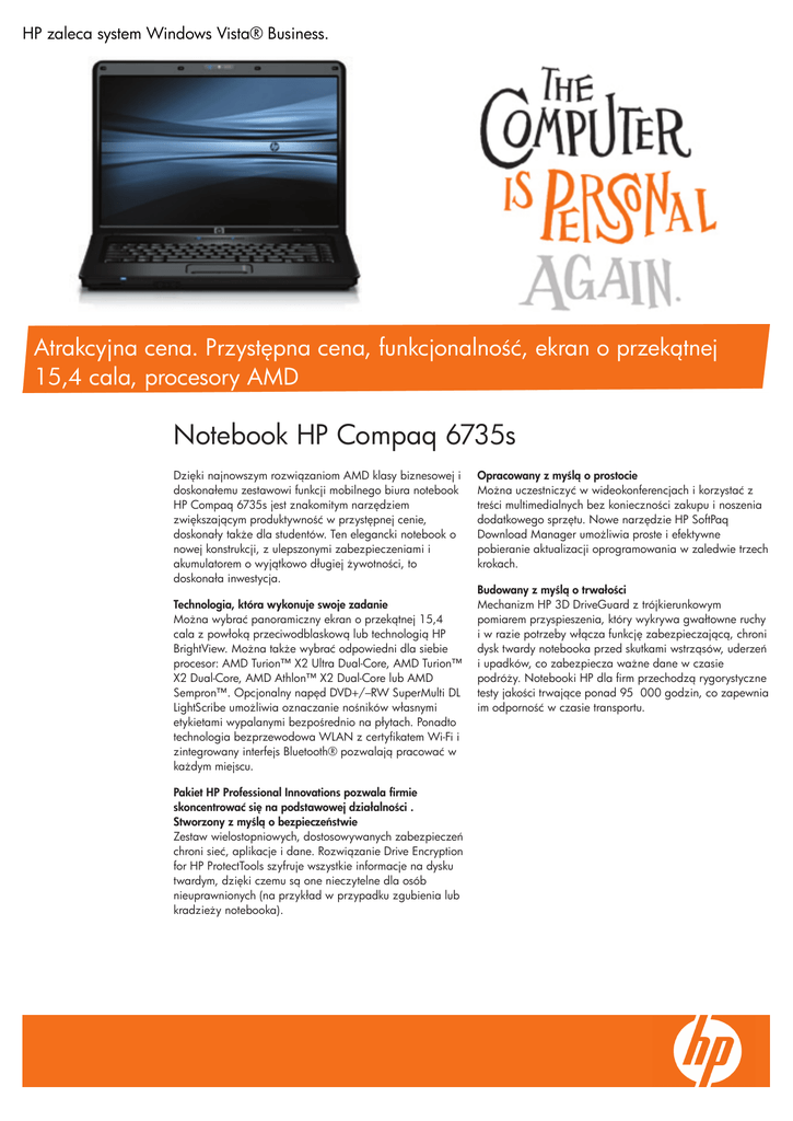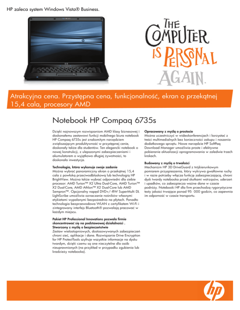 HP zaleca system Windows Vista® Business. Atrakcyjna cena. Przystępna cena, funkcjonalność, ekran o przekątnej 15,4 cala, procesory AMD Notebook HP Compaq 6735s Dzięki najnowszym rozwiązaniom AMD klasy biznesowej i doskonałemu zestawowi funkcji mobilnego biura notebook HP Compaq 6735s jest znakomitym narzędziem zwiększającym produktywność w przystępnej cenie, doskonały także dla studentów. Ten elegancki notebook o nowej konstrukcji, z ulepszonymi zabezpieczeniami i akumulatorem o wyjątkowo długiej żywotności, to doskonała inwestycja. Technologia, która wykonuje swoje zadanie Można wybrać panoramiczny ekran o przekątnej 15,4 cala z powłoką przeciwodblaskową lub technologią HP BrightView. Można także wybrać odpowiedni dla siebie procesor: AMD Turion™ X2 Ultra Dual-Core, AMD Turion™ X2 Dual-Core, AMD Athlon™ X2 Dual-Core lub AMD Sempron™. Opcjonalny napęd DVD+/–RW SuperMulti DL LightScribe umożliwia oznaczanie nośników własnymi etykietami wypalanymi bezpośrednio na płytach. Ponadto technologia bezprzewodowa WLAN z certyfikatem Wi-Fi i zintegrowany interfejs Bluetooth® pozwalają pracować w każdym miejscu. Pakiet HP Professional Innovations pozwala firmie skoncentrować się na podstawowej działalności . Stworzony z myślą o bezpieczeństwie Zestaw wielostopniowych, dostosowywanych zabezpieczeń chroni sieć, aplikacje i dane. Rozwiązanie Drive Encryption for HP ProtectTools szyfruje wszystkie informacje na dysku twardym, dzięki czemu są one nieczytelne dla osób nieuprawnionych (na przykład w przypadku zgubienia lub kradzieży notebooka). Opracowany z myślą o prostocie Można uczestniczyć w wideokonferencjach i korzystać z treści multimedialnych bez konieczności zakupu i noszenia dodatkowego sprzętu. Nowe narzędzie HP SoftPaq Download Manager umożliwia proste i efektywne pobieranie aktualizacji oprogramowania w zaledwie trzech krokach. Budowany z myślą o trwałości Mechanizm HP 3D DriveGuard z trójkierunkowym pomiarem przyspieszenia, który wykrywa gwałtowne ruchy i w razie potrzeby włącza funkcję zabezpieczającą, chroni dysk twardy notebooka przed skutkami wstrząsów, uderzeń i upadków, co zabezpiecza ważne dane w czasie podróży. Notebooki HP dla firm przechodzą rygorystyczne testy jakości trwające ponad 95 000 godzin, co zapewnia im odporność w czasie transportu. Notebook HP Compaq 6735s HP zaleca system Windows Vista® Business. System operacyjny Oryginalny Windows Vista® Business 32-bitowy Oryginalny Windows Vista® Home Basic 32-bitowy Oryginalny Windows Vista® Home Premium 32-bitowy FreeDOS System Red Flag Linux (może być różny w zależności od kraju) Procesor AMD Turion™ X2 Ultra Dual-Core ZM-80 (do 2,4 GHz, 2 MB pamięci podręcznej L2), AMD Turion™ X2 Dual-Core RM-70 (do 2,0 GHz, 1 MB pamięci podręcznej L2), AMD Athlon™ X2 Dual-Core QL-60 (do 1,9 GHz, 1 MB pamięci podręcznej L2) lub AMD Sempron SI-40 (do 2,0 GHz, 512 KB pamięci podręcznej L2) Zestaw układów Zestaw układów AMD M780G Pamięć DDR2, 800 MHz, 1024, 2048 lub 4096 MB; 2 gniazda SODIMM z obsługą pamięci dwukanałowej; Możliwość rozbudowy do 8192 MB (4096 MB w przypadku procesora AMD Sempron) Oprogramowanie HP Recovery Manager, HP SoftPaq Download Manager, Roxio Creator Business 10, Microsoft® Office 2007 Ready (60-dniowa wersja próbna) Dysk twardy Dysk twardy Serial ATA 120, 160 lub 250 GB (5400 obr./min), HP 3D DriveGuard Urządzenie optyczne Napęd DVD+/–RW SuperMulti DL LightScribe Wyświetlacz 15,4" WXGA (rozdzielczość 1280x800) lub 15,4" WXGA z technologią BrightView (rozdzielczość 1280x800), możliwość korzystania z połączeń głosowych (VoIP) — opcjonalna kamera internetowa VGA z wbudowanym mikrofonem Grafika ATI Radeon™ HD 3200 Wymiary (szer. x głęb. x wys.) 3,2 (z przodu) x 35,8 x 26,7 cm Waga Od 2,5 kg Zasilanie 6-ogniwowy akumulator litowy (47 Wh); Zasilacz zewnętrzny HP Smart 65 W, technologia HP Fast Charge Czas pracy akumulatora Maks. 3 godz. (maks. 7 godz. 45 min z akumulatorem HP Extended Life, maks. 11 godz. 20 min z akumulatorem HP Ultra-Capacity) Karta dźwiękowa Dźwięk High Definition, głośniki stereo, wyjście słuchawek stereo/wyjście sygnałowe audio (line out), wejście mikrofonu stereo, wbudowany mikrofon Obsługa komunikacji bezprzewodowej HP 3G Broadband Wireless (wymaga usług operatora sieci telefonii komórkowej), Broadcom 802.11 a/b/g/draft-n i Broadcom 802.11 b/g, Bluetooth® 2.0, HP Wireless Assistant Komunikacja Modem 56 Kb/s; Marvell Ethernet PCI Controller (karta sieciowa 10/100) Gniazda rozszerzeń Dostępne gniazda urządzeń dodatkowych: 1 gniazdo na kartę ExpressCard/54, czytnik kart pamięci I/O porty i zlacza 4 porty USB 2.0, VGA, wejście mikrofonu stereo, wyjście słuchawek stereo/wyjście sygnałowe audio, złącze zasilania, RJ-11, RJ-45 Klawiatura Pełnowymiarowa klawiatura Urządzenie wskazujące Tabliczka dotykowa z przewijaniem Bezpieczeństwo HP ProtectTools, Enhanced Drive Lock, Enhanced Pre-Boot Security, Drive Encryption for HP ProtectTools, HP Spare Key, HP Disk Sanitizer Blokada Kensington, McAfee Security Solution (opcja) Gwarancja Roczna gwarancja z naprawą w punkcie serwisowym, w niektórych krajach z odbiorem i zwrotem do klienta (dostępne są rozszerzenia gwarancji sprzedawane oddzielnie), roczna gwarancja na akumulator podstawowy Więcej informacji można znaleźć na stronie HP z zastrzeżeniami pod adresem www.hp.eu/disclaimer © 2008 Hewlett-Packard Development Company L.P. Niniejsze informacje mogą ulec zmianie bez powiadomienia. Jedyne gwarancje, jakich HP udziela na produkty i usługi, są określone w oświadczeniach gwarancyjnych dostarczanych wraz z takimi produktami i usługami. Żaden zapis niniejszego dokumentu nie może być uważany za dodatkową gwarancję. HP nie ponosi odpowiedzialności za błędy techniczne lub redakcyjne oraz braki występujące w niniejszym dokumencie. Niektóre funkcje system