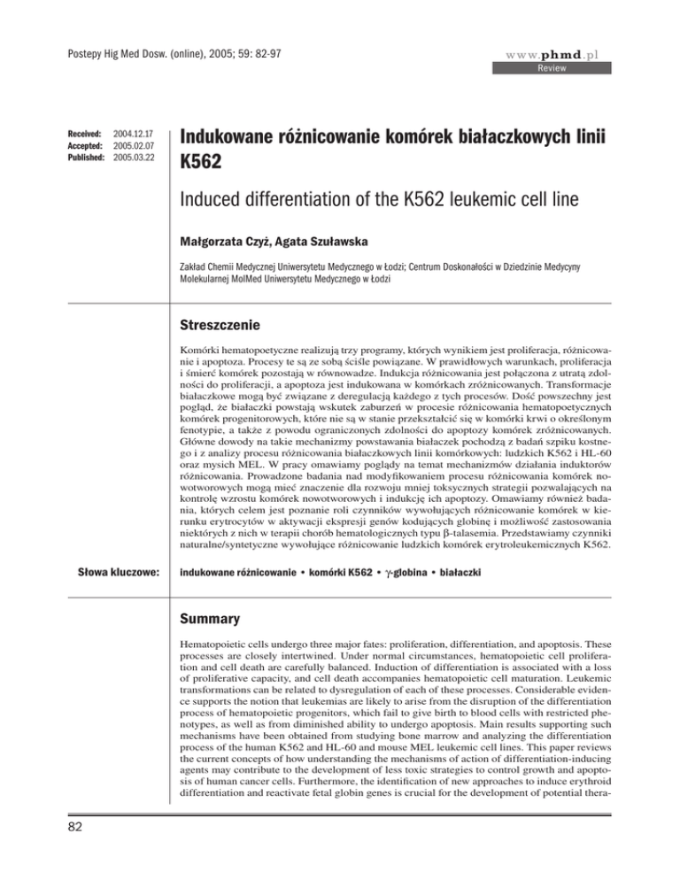 Postepy Hig Med Dosw. (online), 2005; 59: 82-97 www.phmd.pl Review Received: 2004.12.17 Accepted: 2005.02.07 Published: 2005.03.22 Indukowane różnicowanie komórek białaczkowych linii K562 Induced differentiation of the K562 leukemic cell line Małgorzata Czyż, Agata Szuławska Zakład Chemii Medycznej Uniwersytetu Medycznego w Łodzi; Centrum Doskonałości w Dziedzinie Medycyny Molekularnej MolMed Uniwersytetu Medycznego w Łodzi Streszczenie Komórki hematopoetyczne realizują trzy programy, których wynikiem jest proliferacja, różnicowanie i apoptoza. Procesy te są ze sobą ściśle powiązane. W prawidłowych warunkach, proliferacja i śmierć komórek pozostają w równowadze. Indukcja różnicowania jest połączona z utratą zdolności do proliferacji, a apoptoza jest indukowana w komórkach zróżnicowanych. Transformacje białaczkowe mogą być związane z deregulacją każdego z tych procesów. Dość powszechny jest pogląd, że białaczki powstają wskutek zaburzeń w procesie różnicowania hematopoetycznych komórek progenitorowych, które nie są w stanie przekształcić się w komórki krwi o określonym fenotypie, a także z powodu ograniczonych zdolności do apoptozy komórek zróżnicowanych. Główne dowody na takie mechanizmy powstawania białaczek pochodzą z badań szpiku kostnego i z analizy procesu różnicowania białaczkowych linii komórkowych: ludzkich K562 i HL-60 oraz mysich MEL. W pracy omawiamy poglądy na temat mechanizmów działania induktorów różnicowania. Prowadzone badania nad modyfikowaniem procesu różnicowania komórek nowotworowych mogą mieć znaczenie dla rozwoju mniej toksycznych strategii pozwalających na kontrolę wzrostu komórek nowotworowych i indukcję ich apoptozy. Omawiamy również badania, których celem jest poznanie roli czynników wywołujących różnicowanie komórek w kierunku erytrocytów w aktywacji ekspresji genów kodujących globinę i możliwość zastosowania niektórych z nich w terapii chorób hematologicznych typu b-talasemia. Przedstawiamy czynniki naturalne/syntetyczne wywołujące różnicowanie ludzkich komórek erytroleukemicznych K562. Słowa kluczowe: indukowane różnicowanie • komórki K562 • g-globina • białaczki Summary Hematopoietic cells undergo three major fates: proliferation, differentiation, and apoptosis. These processes are closely intertwined. Under normal circumstances, hematopoietic cell proliferation and cell death are carefully balanced. Induction of differentiation is associated with a loss of proliferative capacity, and cell death accompanies hematopoietic cell maturation. Leukemic transformations can be related to dysregulation of each of these processes. Considerable evidence supports the notion that leukemias are likely to arise from the disruption of the differentiation process of hematopoietic progenitors, which fail to give birth to blood cells with restricted phenotypes, as well as from diminished ability to undergo apoptosis. Main results supporting such mechanisms have been obtained from studying bone marrow and analyzing the differentiation process of the human K562 and HL-60 and mouse MEL leukemic cell lines. This paper reviews the current concepts of how understanding the mechanisms of action of differentiation-inducing agents may contribute to the development of less toxic strategies to control growth and apoptosis of human cancer cells. Furthermore, the identification of new approaches to induce erythroid differentiation and reactivate fetal globin genes is crucial for the development of potential thera- 82 Czyż M. i Szuławska A. – Indukowane różnicowanie komórek białaczkowych linii K562 peutic agents in hematological disorders, including b-thalassemia. The natural/synthetic agents inducing differentiation of human erythroleukemia K562 cells are presented. Key words: Full-text PDF: Word count: Tables: Figures: References: induced differentiation • K562 cells • g-globin • leukemias http://www.phmd.pl/pub/phmd/vol_59/7243.pdf 6169 1 2 168 Adres autorki: Dr hab. Małgorzata Czyż, Zakład Chemii Medycznej UM, ul. Mazowiecka 6/8, 92-215 Łódź; e-mail: [email protected] Wykaz skrótów: ABL – kinaza tyrozynowa; ACLA – aklacynomycyna; ALL – ostra białaczka limfoblastyczna (acute lymphocytic leukemia); AP-1 – czynnik transkrypcji (activator protein 1); Ara C – cytarabina (1-b-D-arabinofuranozylocytozyna); Aza C – 5-azacytydyna; Bax, Bcl-2, Bcl-x – białka apoptotyczne należące do rodziny białek Bcl; cIAP – rodzina białek hamujących apoptozę (inhibitor of apoptosis proteins); CML – przewlekła białaczka szpikowa (chronic myeloid leukemia); COX-2 – cyklooksygenaza 2; DOX – doksorubicyna (adriamycyna); DRB – daunorubicyna; EGF – czynnik wzrostu naskórka (epidermal growth factor); Epo-R – receptor erytropoetyny (erythropoietin receptor); ERK – kinaza regulowana czynnikami zewnętrznymi (extracellular signalregulated kinase); 5-Fu – 5-fluorouracyl; HbF – hemoglobina płodowa (fetal hemoglobin); HDAC – deacetylaza histonowa; HMBA – bisacetamid (hexamethylamine bisacetamide); HSC – hematopoetyczne komórki macierzyste (hematopoietic stem cells); ICAM -1 – międzykomórkowa cząsteczka adhezyjna 1 (intercellular adhesion molecule-1); IL-1, -6, -8 – interleukiny 1, 6, 8; iNOS – indukowana syntaza tlenku azotu (inducible nitric oxide synthase); JNK – kinaza fosforylująca N-terminalną część białka Jun (Jun N-terminal kinase); 5-LOX – 5-lipooksygenaza; MAPK – kinaza białek aktywowanych mitogenami (mitogen activated protein kinase); MDR – oporność wielolekowa (multidrug resistance); MEK – kinaza ERK (ERK kinase); MEL – mysie komórki erytroleukemiczne (mouse erythroleukemia cells); MOLT-3 – ludzkie linie komórek limfocytów T; PBGD – deaminaza porfobilinogenu (porphobilinogen deaminase); PDGF – płytkowy czynnik wzrostu (plateletderived growth factor); PI3K – kinaza 3-fosfatydyl