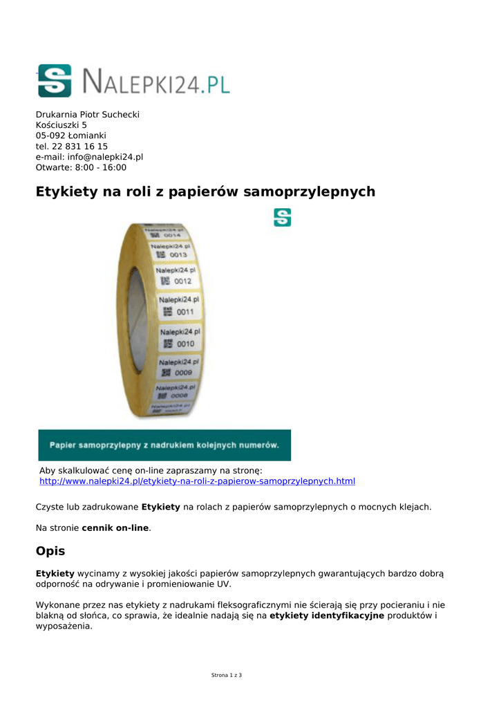 Drukarnia Piotr Suchecki Kościuszki 5 05-092 Łomianki tel. 22 831 16 15 e-mail: [email protected] Otwarte: 8:00 - 16:00 Etykiety na roli z papierów samoprzylepnych Aby skalkulować cenę on-line zapraszamy na stronę: http://www.nalepki24.pl/etykiety-na-roli-z-papierow-samoprzylepnych.html Czyste lub zadrukowane Etykiety na rolach z papierów samoprzylepnych o mocnych klejach. Na stronie cennik on-line. Opis Etykiety wycinamy z wysokiej jakości papierów samoprzylepnych gwarantujących bardzo dobrą odporność na odrywanie i promieniowanie UV. Wykonane przez nas etykiety z nadrukami fleksograficznymi nie ścierają się przy pocieraniu i nie blakną od słońca, co sprawia, że idealnie nadają się na etykiety identyfikacyjne produktów i wyposażenia. Strona 1 z 3 Uwaga! Etykiety papierowe z nadrukiem termotransferowym taśmą woskową są mało odporne na ścieranie. Jeśli jest potrzebna duża odporność na ścieranie polecamy etykiety z folii z nadrukiem termotransferowym taśmą żywiczną. Etykiety spełniają wymogi oznaczenia CE na opakowaniech. Kalkulator cen online dostępny na tej stronie pozwala na wyliczenie cen etykiet czystych i z nadrukiem termotransferowym. Dla większych nakładów etykiet, np. ponad 10.000 szt. ekonomicznie uzasadnione może być wykonanie nadruku fleksograficznego. W takim wypadku prosimy o przesłanie zapytania e-mailem wraz z poglądowym projektem. Dodatkowe informacje Etykiety należy kleić na czystych i odtłuszczonych powierzchniach. Minimalna temperatura otoczenia wynosi +5ºC. Czas wiązania kleju do osiągnięcia pełnej wytrzymałości na oderwanie wynosi do 24 godz., w zależności od warunków i rodzaju papieru. W przypadku wątpliwości, czy etykieta będzie się trzymała danej powierzchni, prosimy o zamówienie bezpłatnych próbek. W przypadku bardzo porowatych i mało nośnych powierzchni możemy zaproponować specjalne sposoby klejenia i odpowiednie papiery. Prosimy o kontakt. Rodzaje nadruków Etykieta może być zadrukowana dwiema technikami. Poniżej prezentujemy zestawienie zalet i wad. 1. Druk termotransferowy - precyzyjna metoda nadruku - bardzo niski koszt jednostkowy nawet przy małych nakładach - możliwość drukowania kolejnych numerów, zmiennych kodów kreskowych i innych danych np. z bazy lub programu Excel - wadą jest brak możliwości drukowania przejść tonalnych kolorów i bardzo precyzyjnego ich pasowania 2. Druk fleksograficzny - precyzyjna i trwała metoda nadruku - niski koszt jednostkowy przy średnich i dużych nakładach - możliwość druku pełnokolorowego CMYK np. zdjęcia - brak możliwość drukowania kolejnych numerów (zmienne dane trzeba dodrukowywać inną techniką np. termotransferem) Jak zamówić? Aby zamówić etykiety przechodzimy do zakładki "Skalkuluj cenę". Jeśli nie jesteśmy zalogowani to musimy się zalogować. 1. Wybieramy materiał z jakiego mają być wykonane etykiety i jej wymiar. 2. Wpisujemy interesujący nas nakład. 3. Wybieramy, czy etykiety mają mieć kolejne numery lub kody kreskowe (nie ma to wpływu na Strona 2 z 3 cenę). 4. Zaznaczamy kolory nadruków. Po kliknięciu klawisza "Przelicz", po prawej stronie pojawią się ceny dla różnych nakładów. Klikając na klawisz "Do koszyka" wybieramy konkretny nakład i parametry etykiet. Po umieszczeniu etykiet w koszyku można załączyć indywidualny projekt: 1. Przechodzimy do zakładki "Dodaj projekt" 2. Klikamy klawisz "Przeglądaj" koło napisu Projekt 3. Wybieramy z komputera plik z projektem i klikamy "Otwórz" lub "OK" 4. Uzupełniamy "Dodatkowe uwagi dotyczące projektu:" 5. Możemy zamówić dodatkowe usługi, np. przygotowanie projektu, opracowanie logo itp. Jeśli nie dysponują Państwo plikiem z projektem prosimy o wybranie w polu formularza "Sposób dostarczenia projektu" "proszę o przygotowanie projektu wg. opisu w polu "Dodatkowe usługi:" Uwaga! Załadowanie pliku z projektem na serwer następuje dopiero po kliknięciu dużego zielonego klawisza: "Zapisz informacje o projekcie, dodatkowych usługach i próbnych wydrukach." Ładowanie może trwać dłuższą chwilę. Czas ładowania zależy od szybkości łącza do internetu i wielkości pliku. Duże pliki lepiej ładować poprzez zakładkę "Upload". Po zapisaniu informacji o projekcie, możemy przejść do koszyka i sfinalizować zamówienie. Dla Państwa komfortu, zawsze przed realizacją zamówienia, przesyłamy plik z treścią nadruku i całkowitym kosztem zamówienia. Drukujemy dopiero po otrzymaniu pisemnego akceptu e-mailem. Strona 3 z 3